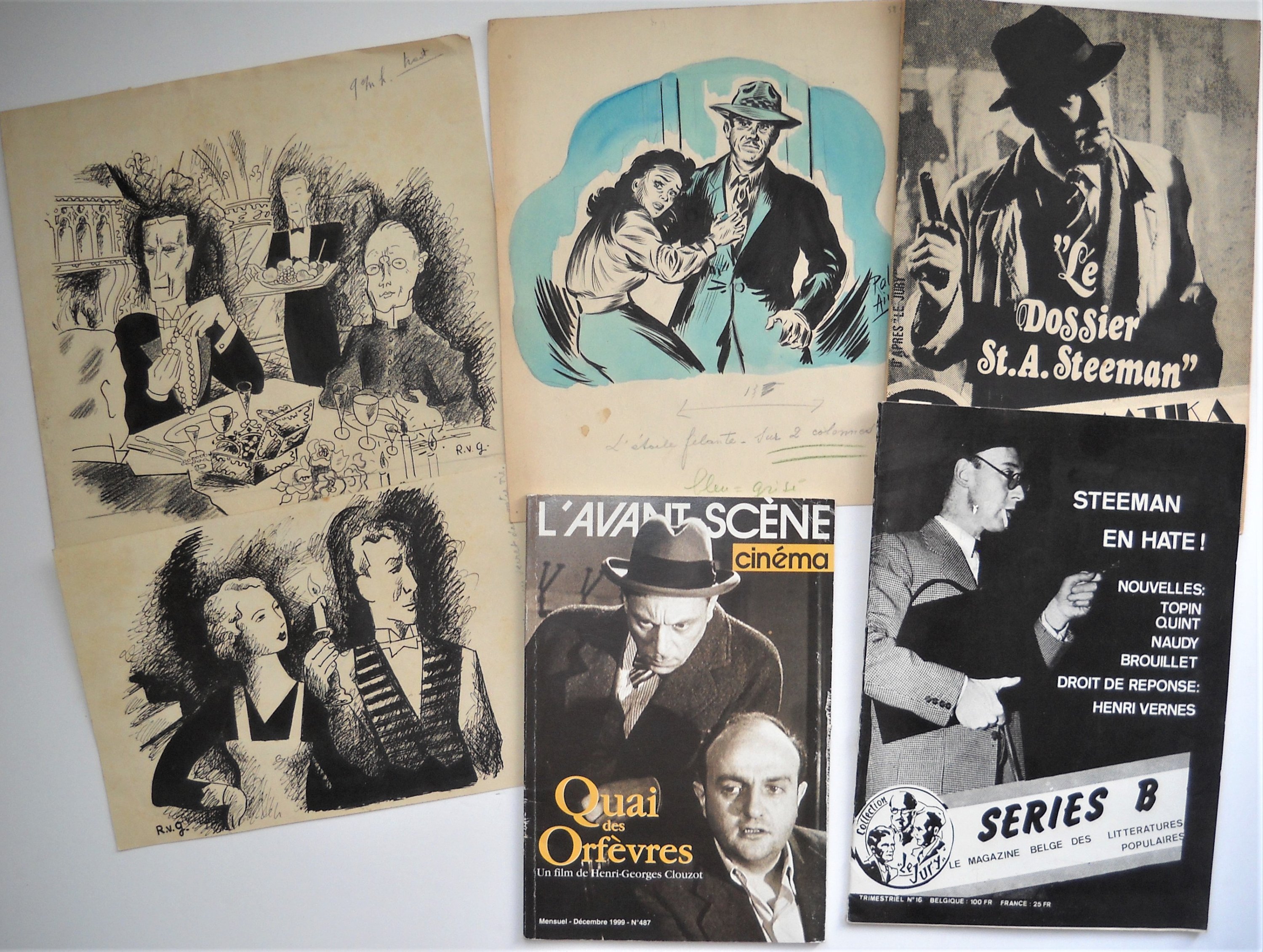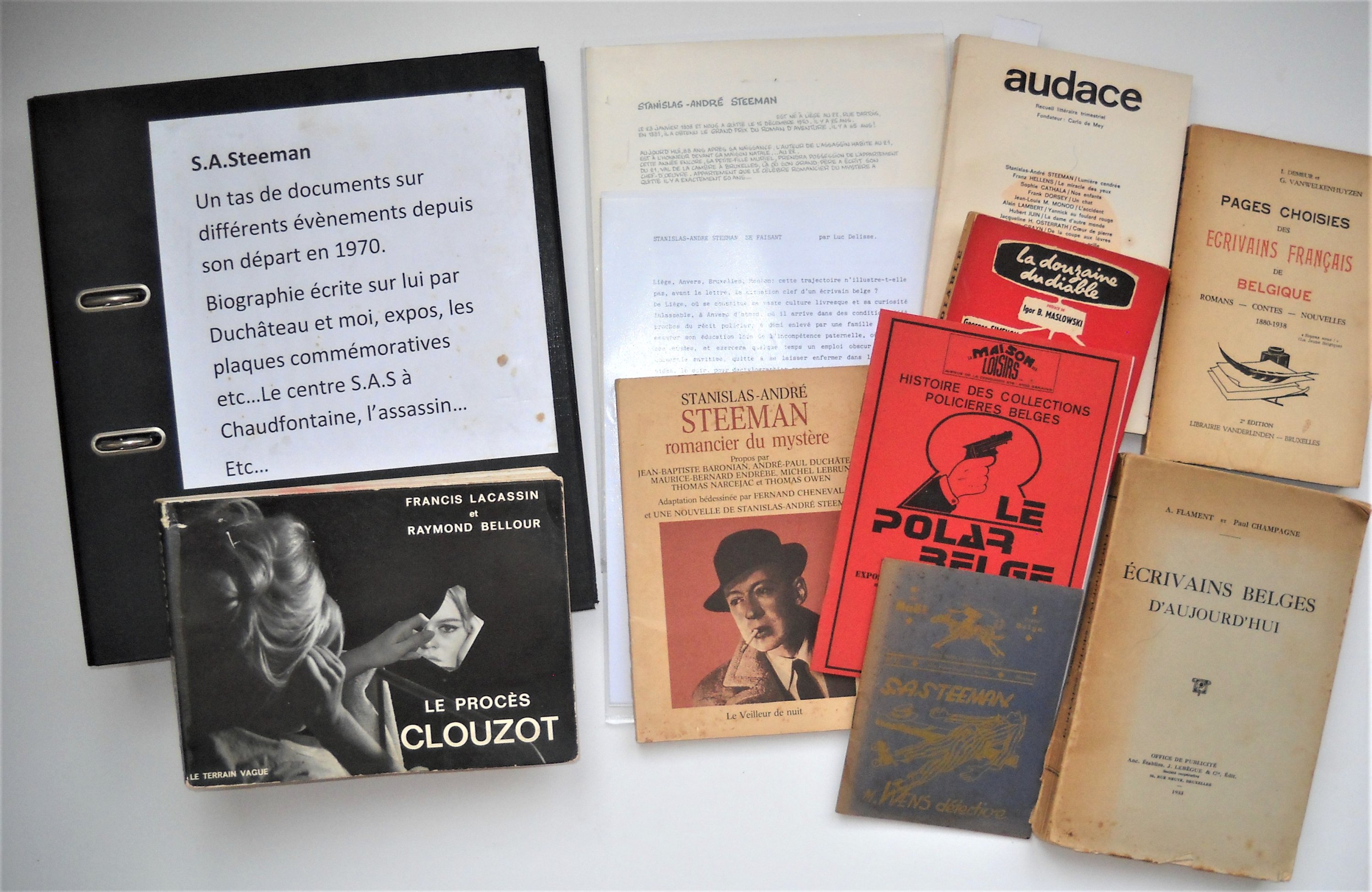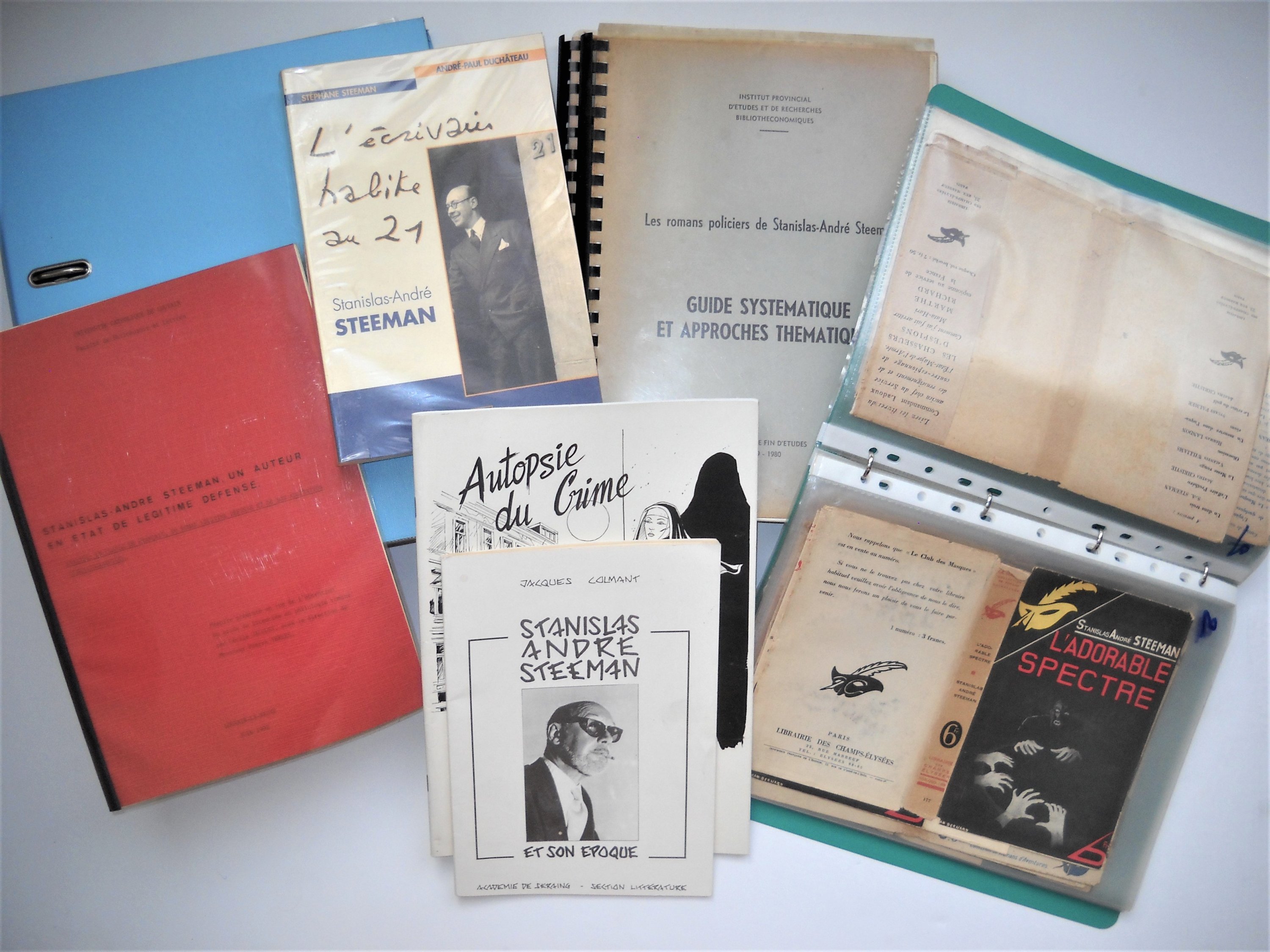 Dont: biographie par Luc Delisse ; « Stanislas-André Steeman, un auteur en état de légitime défense », mémoire de Cécile Jacquet (1992) ; « Les romans policiers de Stanislas-André Steeman, guide systématique et approches thématiques » par Maquet et Marchal (1979-1980) ; classeur contenant les jaquettes des livres parus ; photos du tournage de « LAssassin habite au 21 » et « Les Atouts de M. Wens » ; etc.