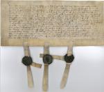 Charte manuscrite écrite en allemand, sur parchemin, 25,5 x 11 cm, avec trois beaux sceaux de cire armoriés appendus sur queues de parchemin.