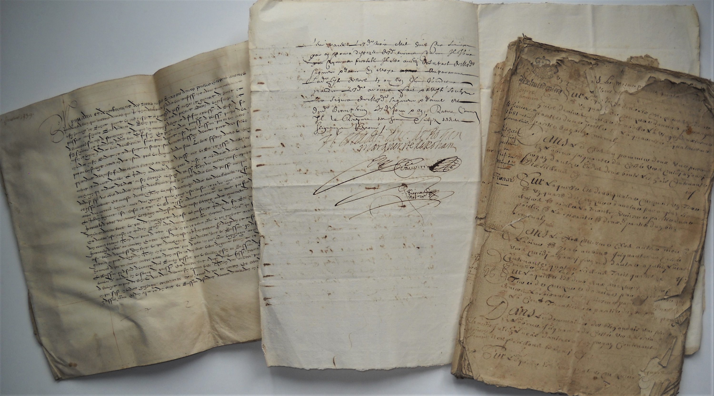 Réunion de + de 180 pièces manuscrites, papier et parchemin, format divers, 15e au 18e siècle.