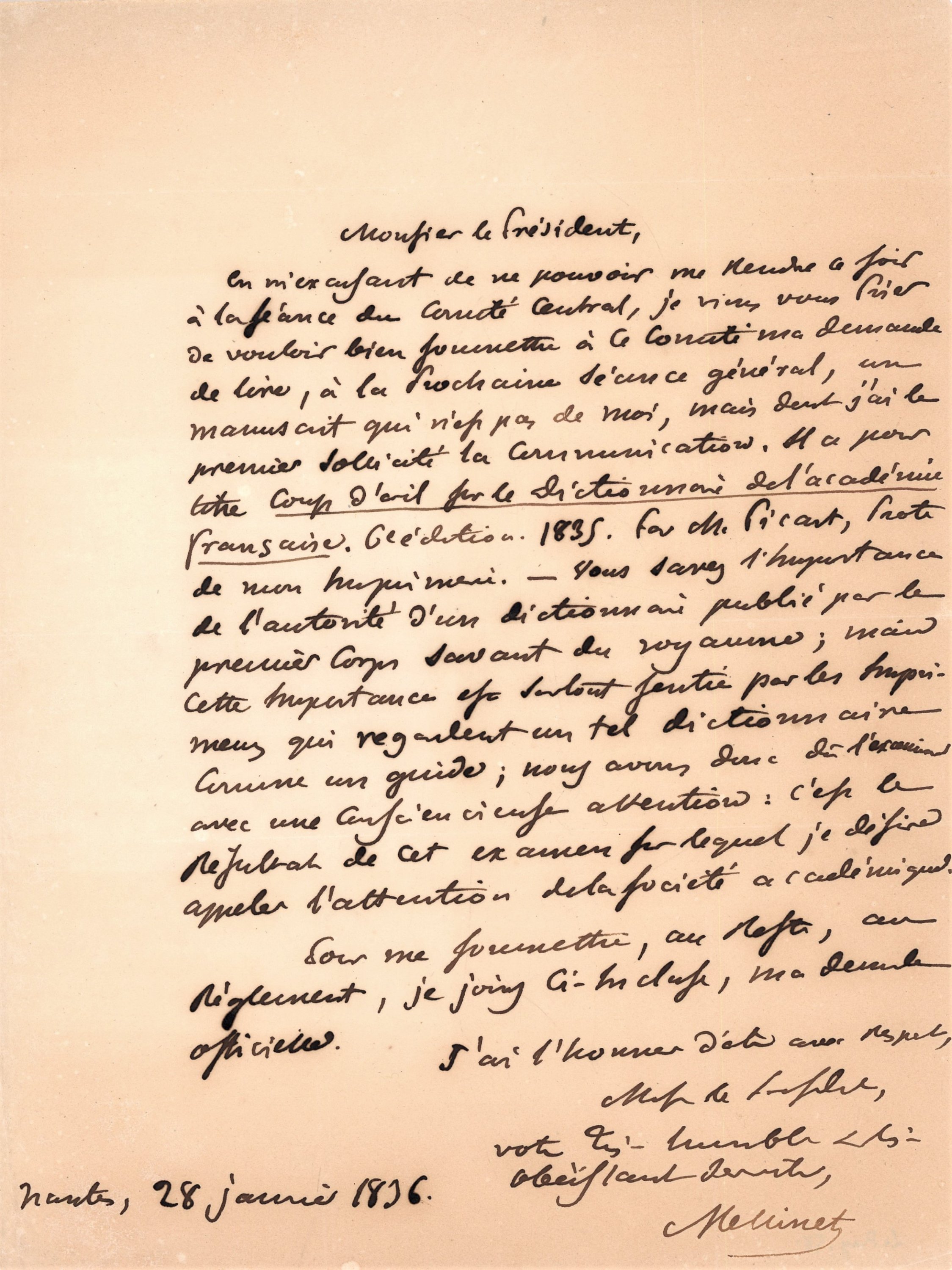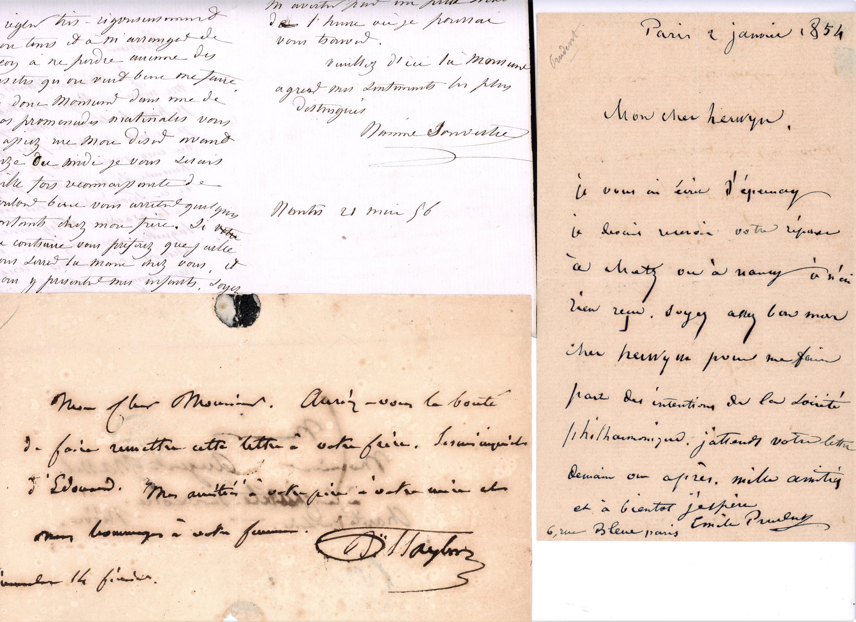 L.A.S., L.A. et divers dhommes et femmes de lettres, élus, scientifiques, politiques, etc, la plupart originaire/en lien avec la Bretagne ou la ville de Nantes, adressées à la Société des Sciences et Arts et à la Société royale académique de la Loire-Inférieure, à des éditeurs nantais (Guéraud, Mellinet-Malassis) et à divers.