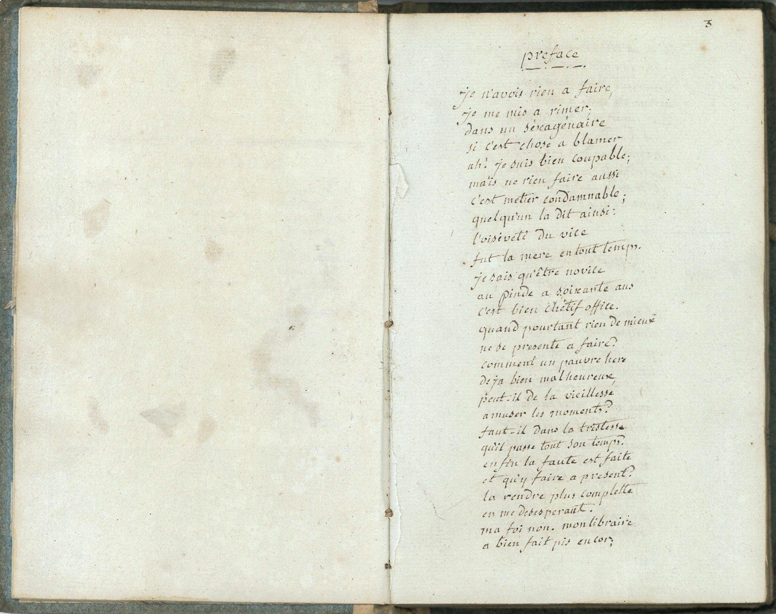 Poésies diverses, ou les amusemens de ma vieillesse, [c. 1803], [Châteaudun], manuscrit à lencre brune, rel. in-8 cartonnage dépoque, 189 pp.
