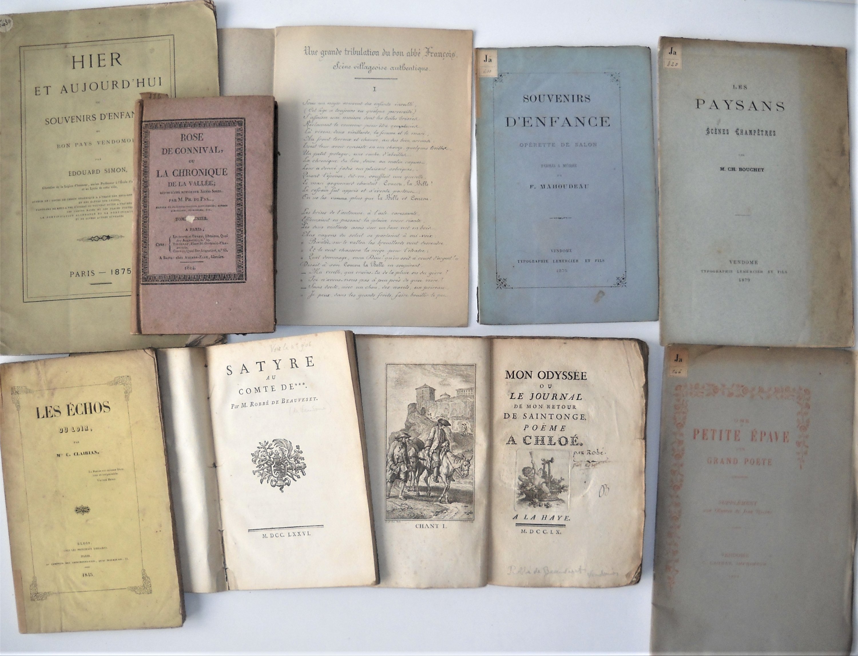 Robbé de Beauveset, Mon odyssée ou le journal de mon retour de Saintonge, poème à Chloé, La Haye, 1760, br. in-8 ; 125 pp. ; Robbé de Beauveset, Satyre au comte de F***, 1776, 32 pp. ; Philippe de Passac, Rose de Connival ou la chronique de la Vallée, tome 1er, Blois, 1824, in-8, 264 pp. ; Melle Clairian, Les échos du Loir, Blois, 1845, 182 pp. ; Mahoudeau, Souvenirs denfance, opérette de salon, Vendôme, 1875 ; Bouchet, Les paysans, scènes champêtres, Vendôme, 1879 ; Achille Duvau, Une petite épave dun grand poète, Vendôme, 1883, 16 pp., n°16/125 ex. ; Legai du Loir [Abbé Ménard, dit], Une grande tribulation du bon abbé François, scène villageoise authentique, 8 pp., poème inédit imprimé en autographie, 1887 ; Edouard Simon, Hier et aujourdhui ou souvenirs denfance du bon pays Vendômois, Paris, 1875 ; Librairie Albert Ripé à Vendôme, 1902 ; etc.