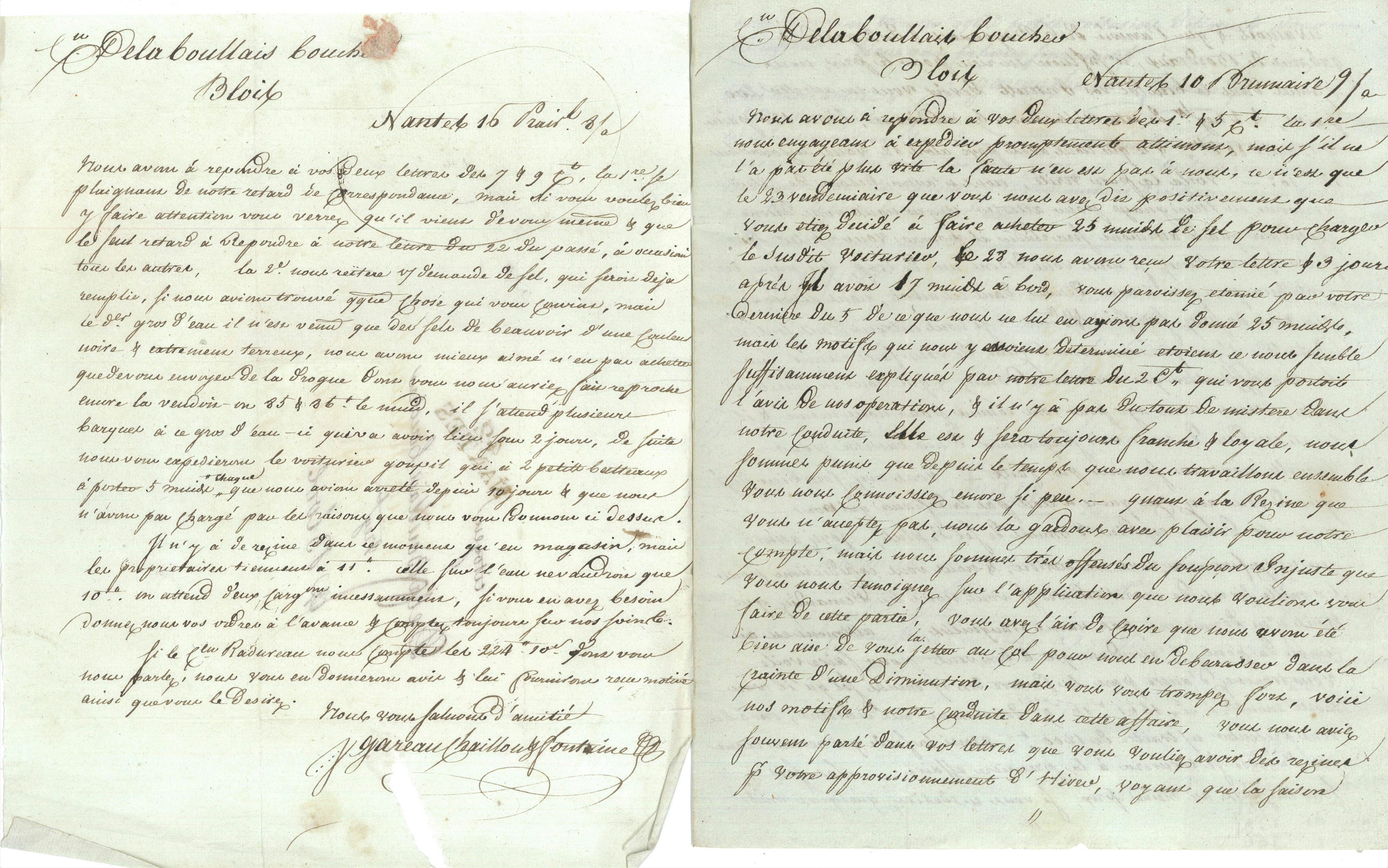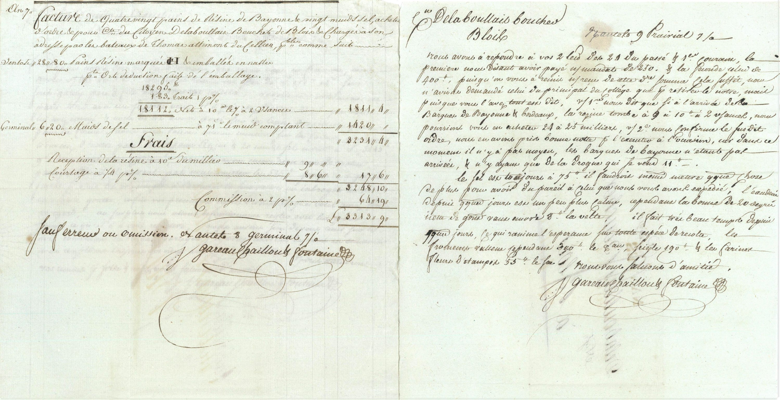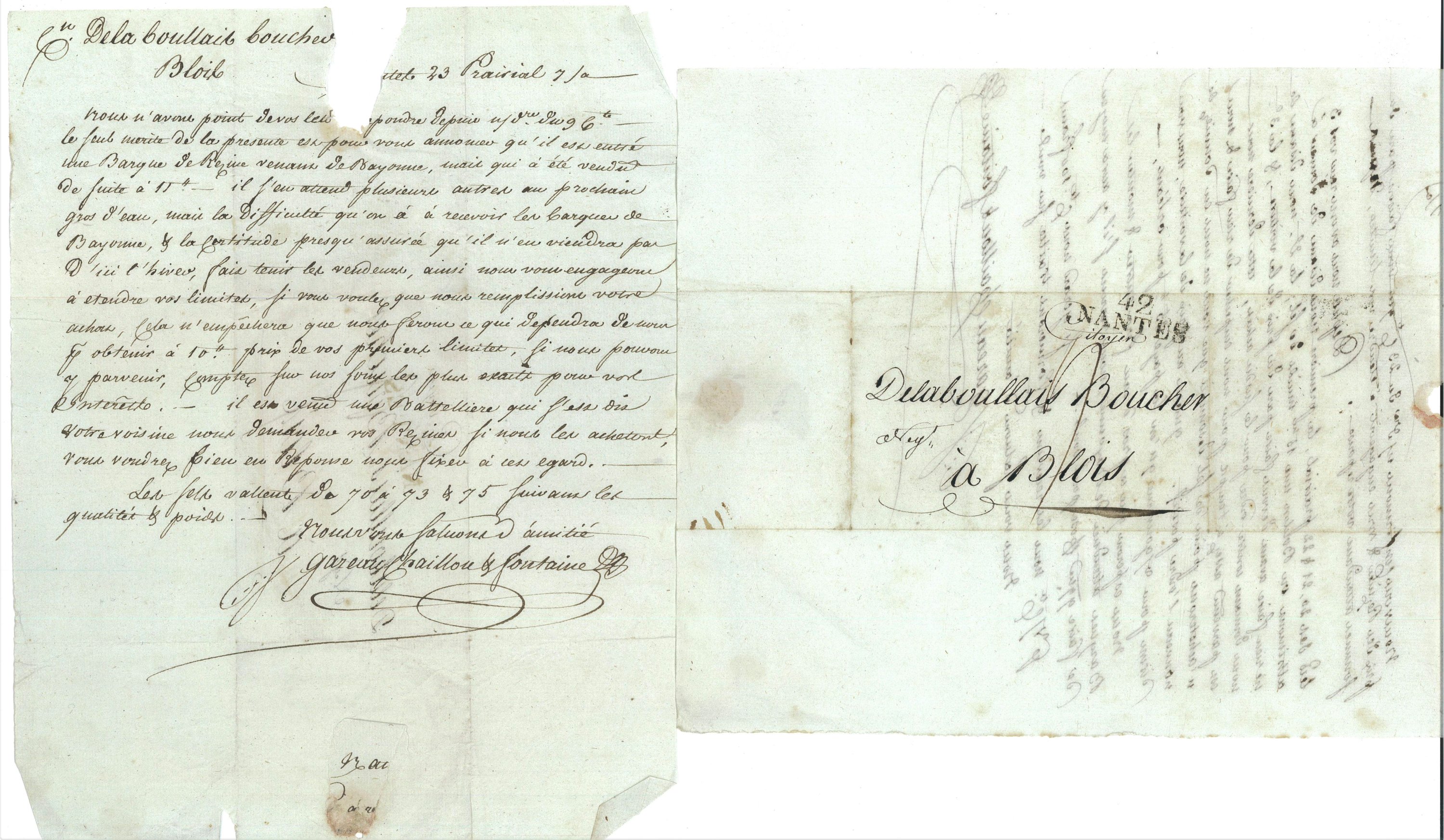 env. 60 correspondances et factures, 1799-1800, émises par « Garreau, Chaillou & Fontaine », négociants courtiers nantais et adressées à Noël-Jean Delaboullais, négociant grossiste en épicerie et marchand cirier à Blois ;