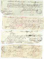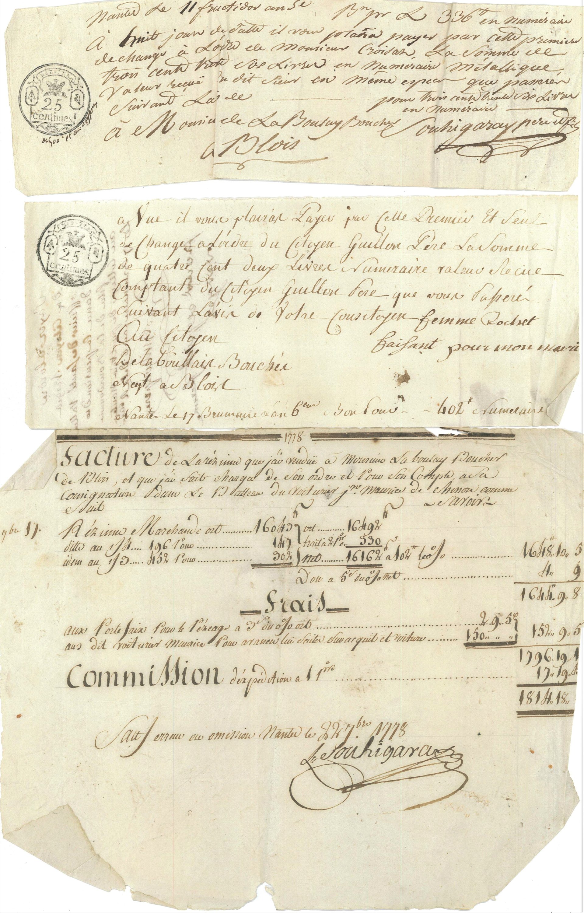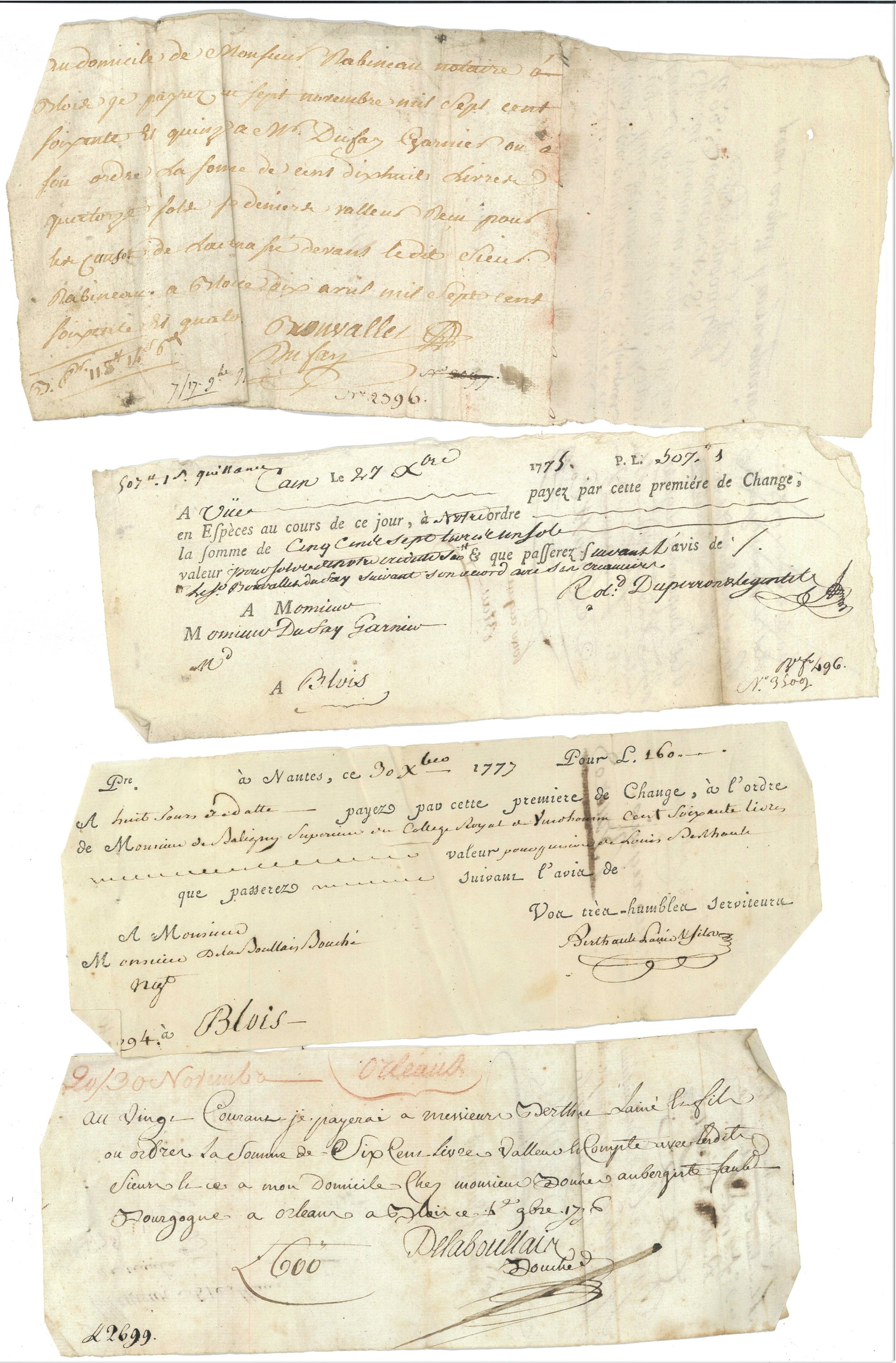 Lot denv. 65 pièces manuscrites, 1772-1795, relatives aux familles blésoises Crignon-Bonvallet et Dufay (dont le prêtre curé de Cellettes émigré) ; quittances, mémoires, comptes, lettres de change ou billets à ordre, correspondances, etc.