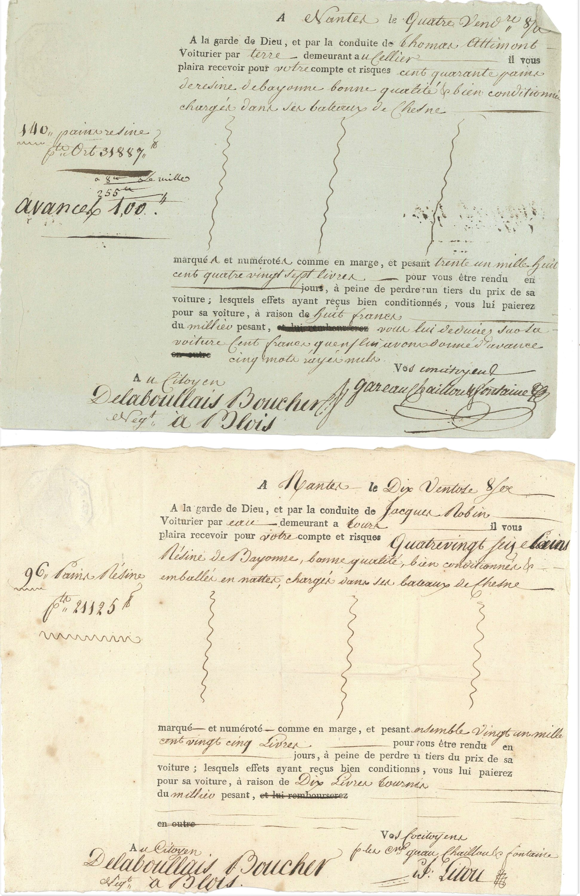 2 lettres de voiture, lune par terre et lautre par eau, 1800 ;