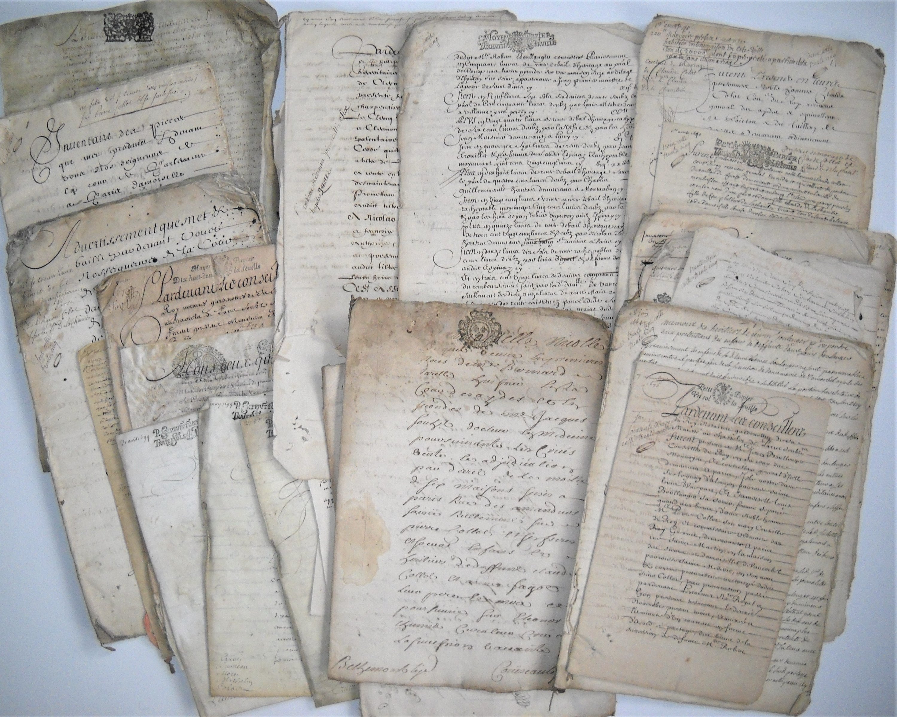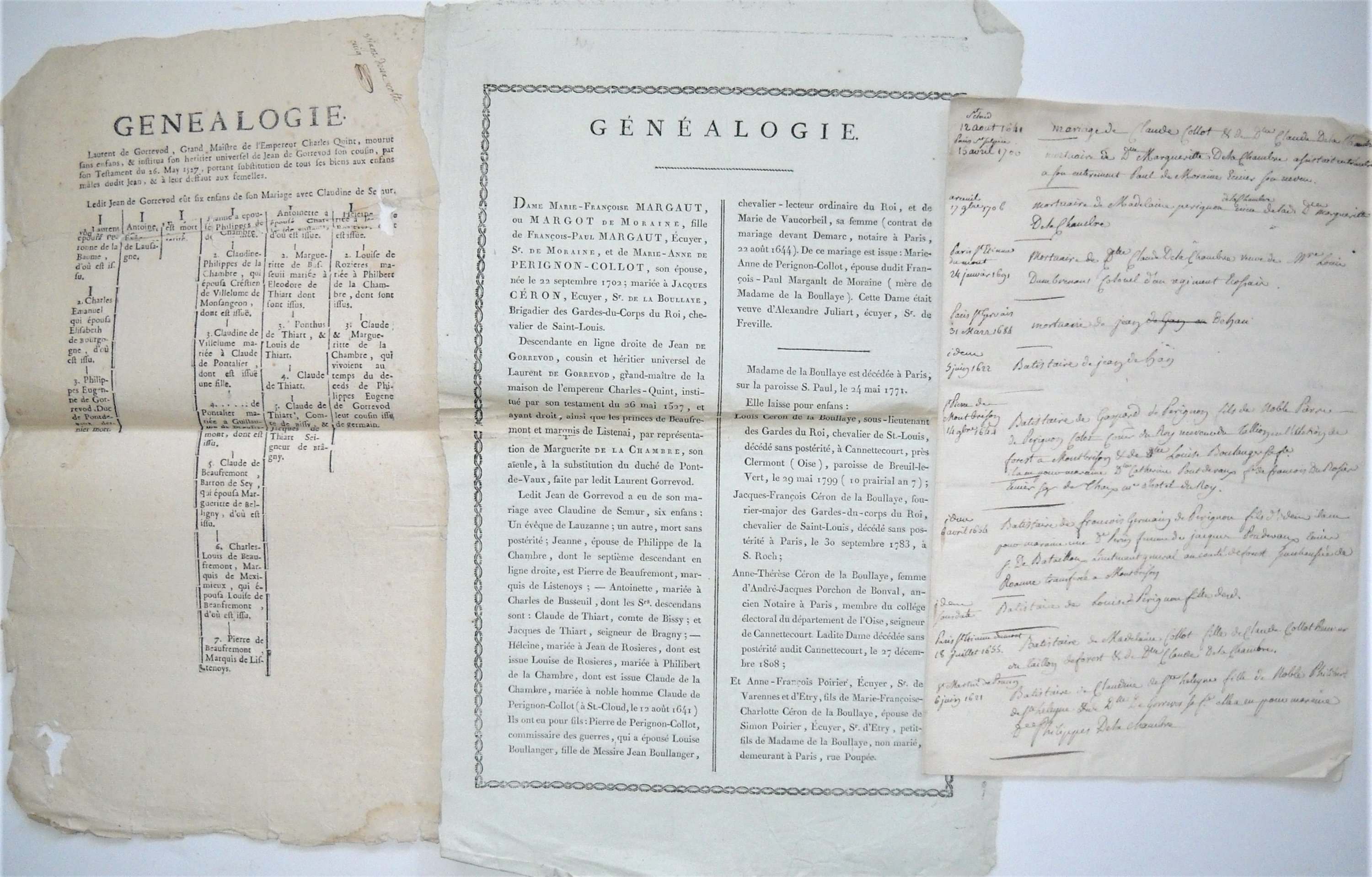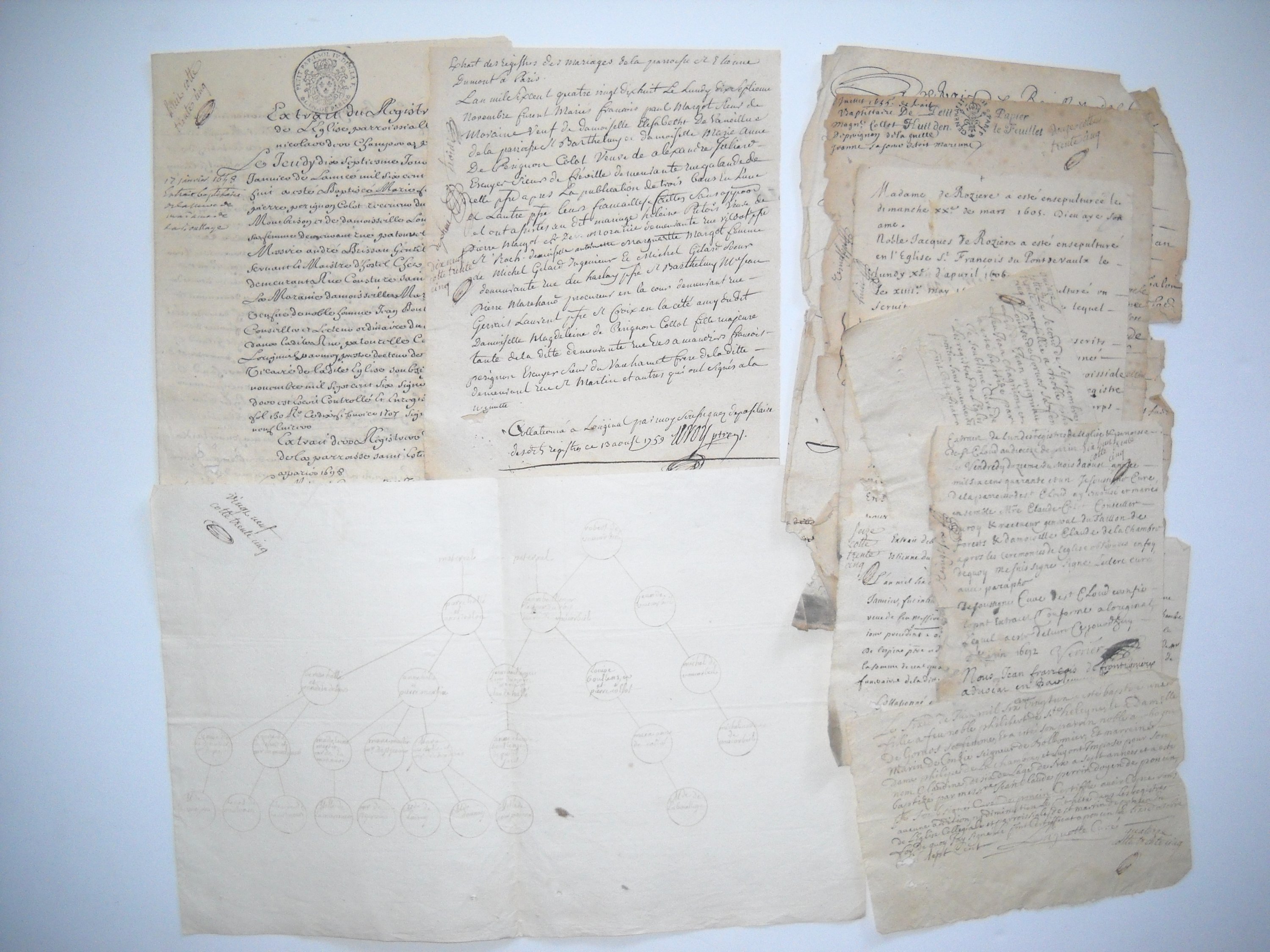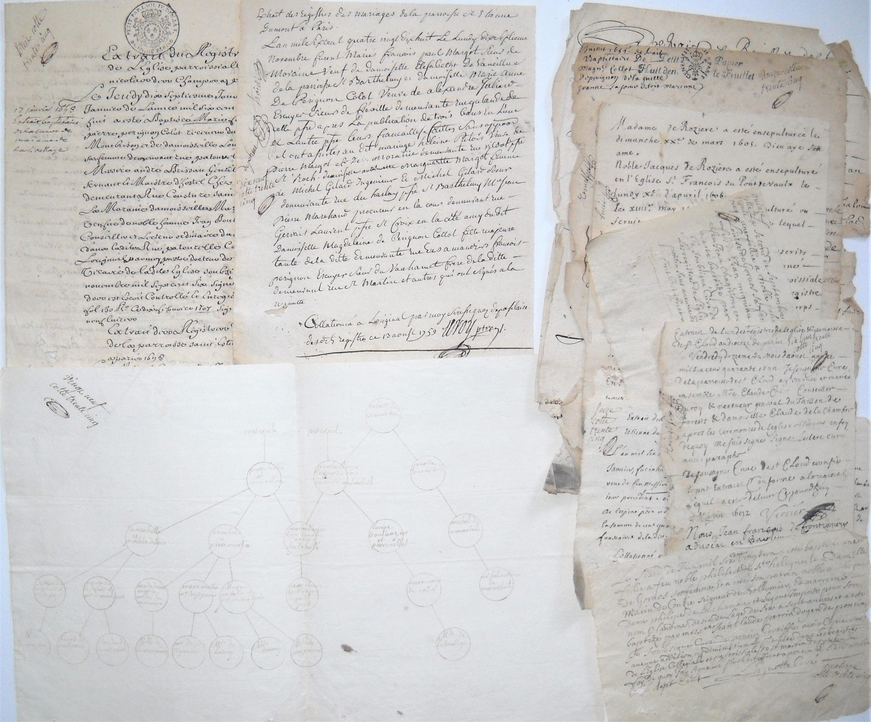 Réunion denv. 50 pièces manuscrites, papier et parchemin, formats divers, 1641-1759, copies dactes notariés et judiciaires, et divers, dont: Contrat de mariage entre: Claude Collot conseiller du roi receveur général des aydes et du taillon de la généralité de Poitiers et Claude de la Chambre (1641), Pierre Collot commissaire ordinaire des guerres et Marie de Vaucorbeil veuve de Jean Boulanger lecteur ordinaire du roi (1644), Alexandre Julliart sieur de Frosville lun des 200 gendarmes de la garde ordinaire du roi et Marie Anne de Pérignon-Collot (1689) ; achat de loffice de receveur alternatif des tailles en lélection de Saint Etienne du Furan en Forez et de loffice triennal du taillon par Me Pierre Pérignon-Collot conseiller du roi receveur ancien alternatif et triennal du taillon en lélection de Forest à Montbrison, époux de Louise Bellanger (1651) ; arbre généalogique ; extraits baptistaires et mortuaires ; etc.