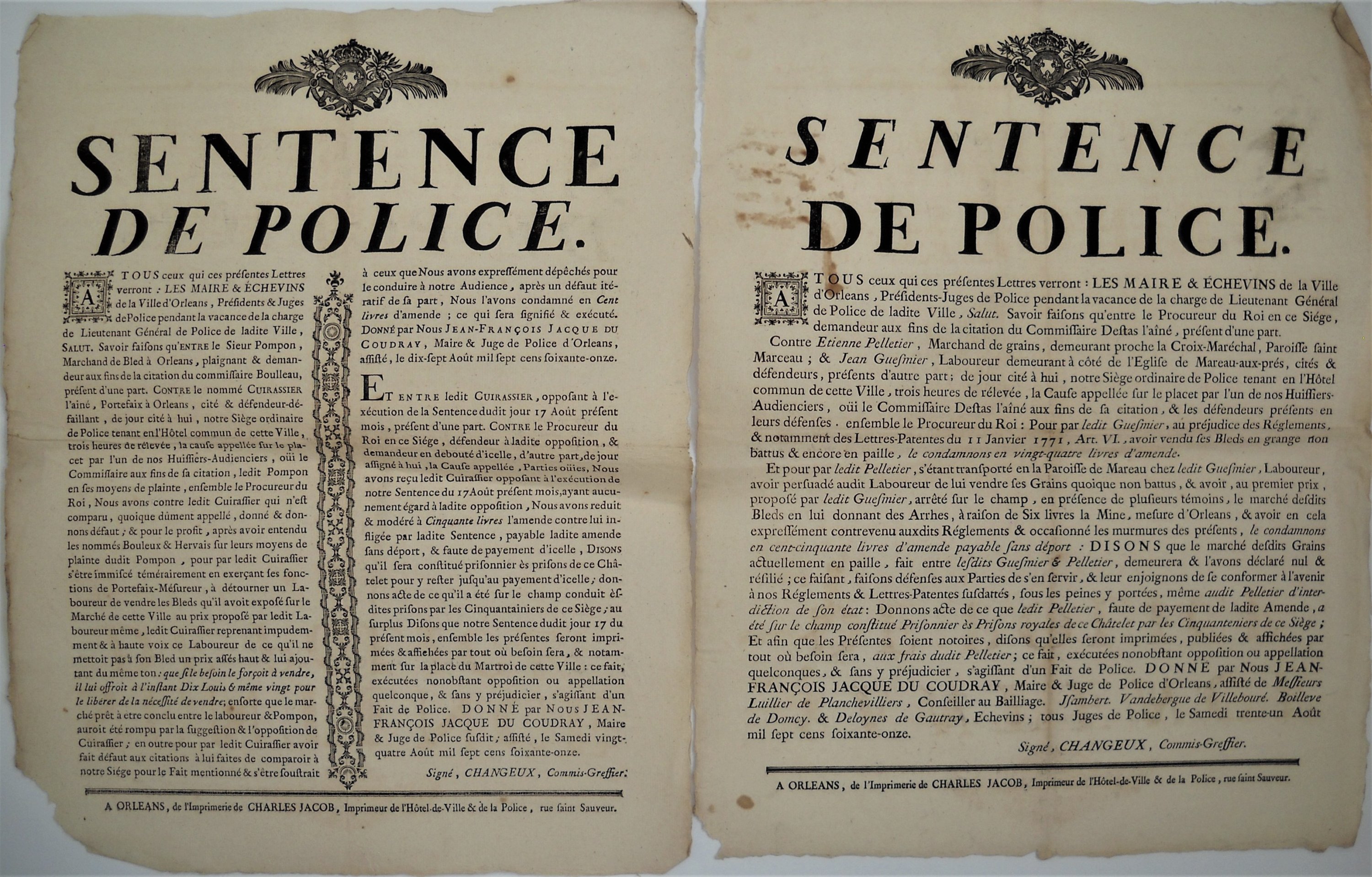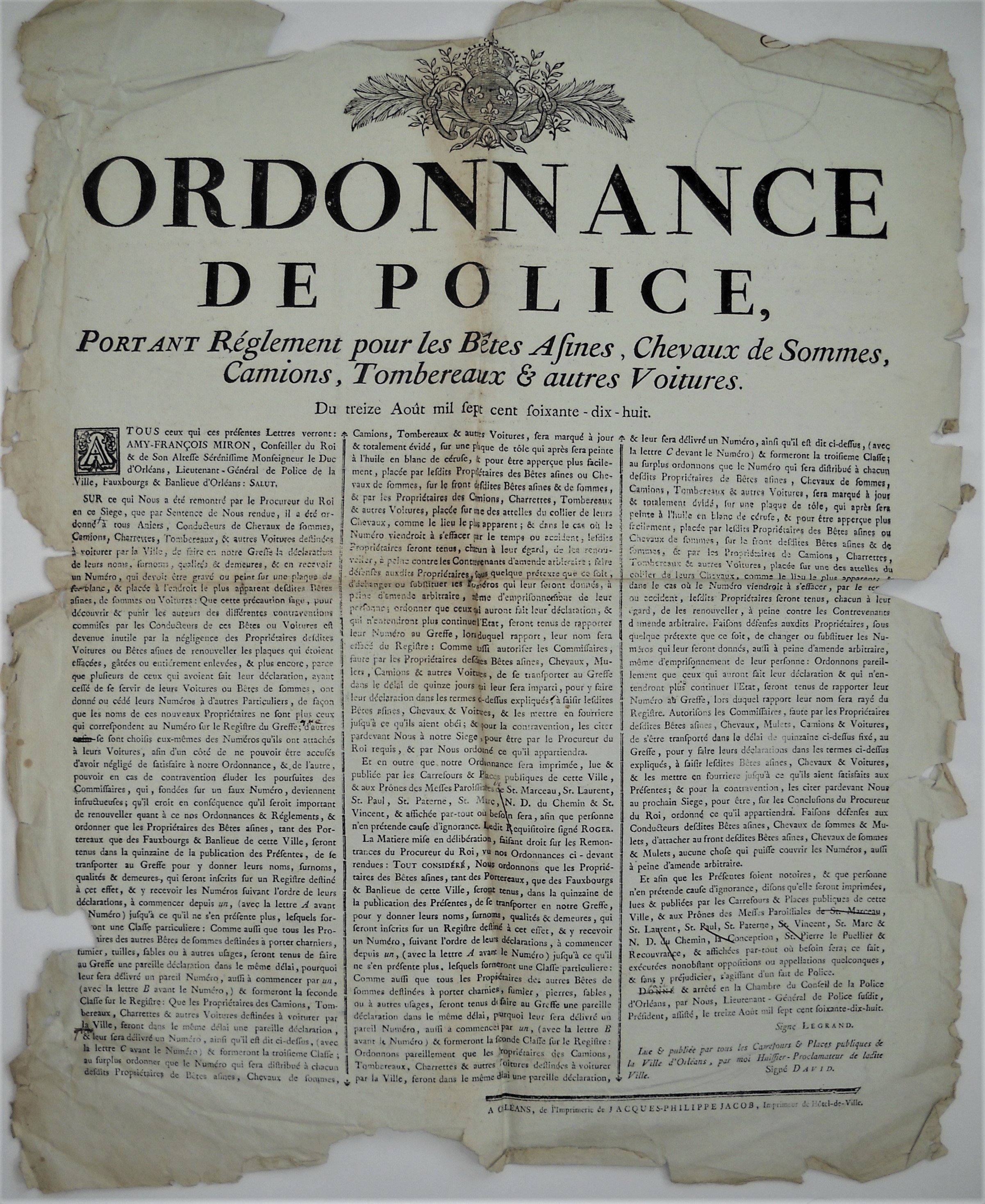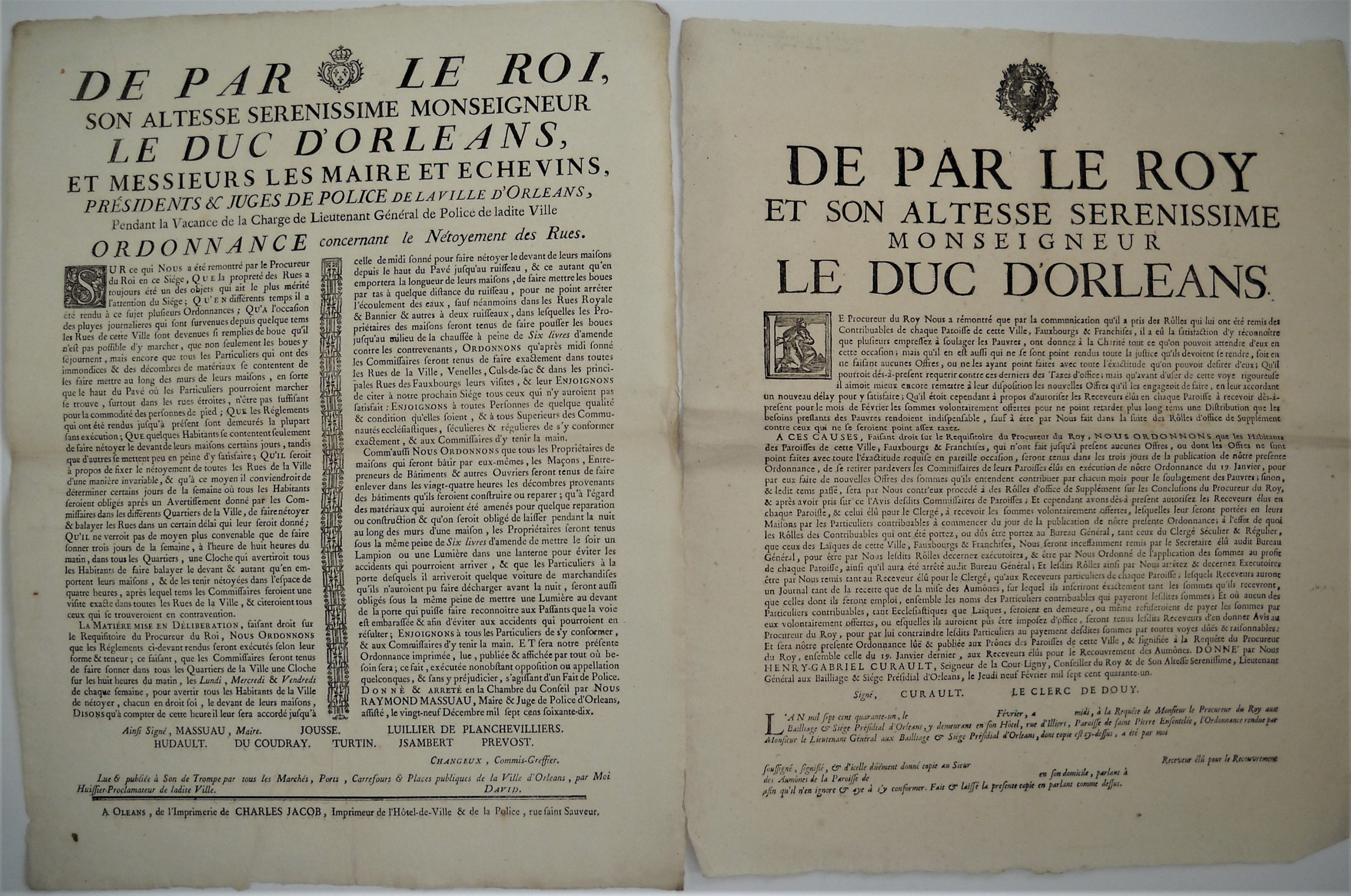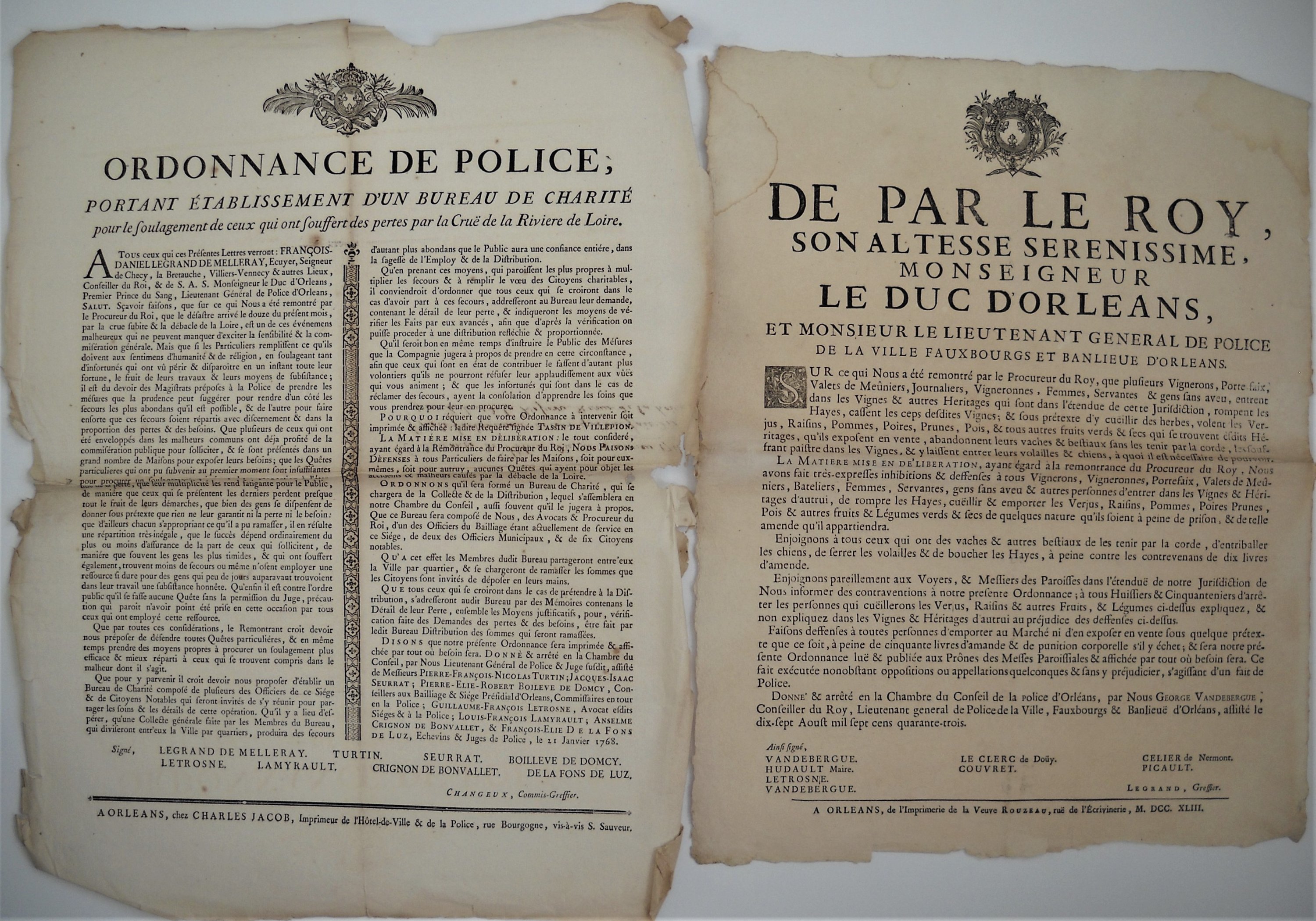 env. 35 ordonnances de police du lieutenant-général dOrléans concernant : La protection des vignobles dans lOrléanais, 3 septembre 1710 ; La réparation obligatoire des puits de la ville en cas dincendie, 19 août 1719 ; Le déchargement de la marée dans les parquets et places destinés dans la grande poissonnerie de la ville, 3 mars 1728 ; Le placement des bestiaux au vieux marché de la ville, 27 septembre 1732 ; La défense de jouer aux boules et aux quilles dans les rues de la ville dOrléans, 2 juin 1736 ; La protection des vignes, 22 août 1733, 22 août 1736, 31 août 1737, 22 août 1739, 10 septembre 1740, 29 août 1742, 17 août 1743, 27 août 1749, 28 juillet 1753 ; La subsistance des pauvres et le paiement obligatoire de laumône, 13 janvier, 19 janvier et 9 février 1741 ; La mendicité sur la voie publique, 5 décembre 1725, 7 décembre 1737, 6 mai 1744 ; La défense dentrer dans les vignes des environs dOrléans pour y grapper jusquau 1er novembre, 28 septembre 1748 ; La défense aux âniers de monter sur leurs bêtes dans la ville et de les tenir à pied par la bride en raison de nombreux accidents, 14 août 1717, 18 octobre 1748 ; Le déblaiement des neiges, le nettoyage des rues et lévacuation des immondices des bouchers de la ville, 18 décembre 1748 ; La défense du pacage des bestiaux dans les vignes, 5 juin 1751 ; Décheniller les arbres fruitiers et autres arbustes, 9 mars 1754 ; Létablissement dun bureau de charité à Orléans pour le soulagement de ceux qui ont soufferts des pertes par la crue de la Loire, 21 janvier 1768 ; Le nettoiement des rues de la ville dOrléans, 10 janvier 1714, 29 janvier 1721, 12 février 1721, 7 février 1737, 7 décembre 1737, 29 décembre 1770 ; Lévacuation des terres et autres matériaux qui proviendront des constructions et démolitions des maisons dans le bassin devant Saint Charles à Orléans, 23 février 1771 ; Le nettoiement des rues, 16 novembre 1775 ; Le règlement pour les ânes, chevaux de sommes, camions, tombereaux et autres voitures, 13 août 1778 ; La taxe des chairs, 11 juin 1788 ;
