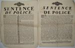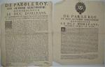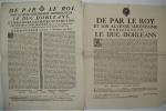 Rare réunion denv. 45 placards imprimés, 1710-1788, en majorité env. 47 x 36 cm, bel état de conservation (plis, rousseurs), dont :