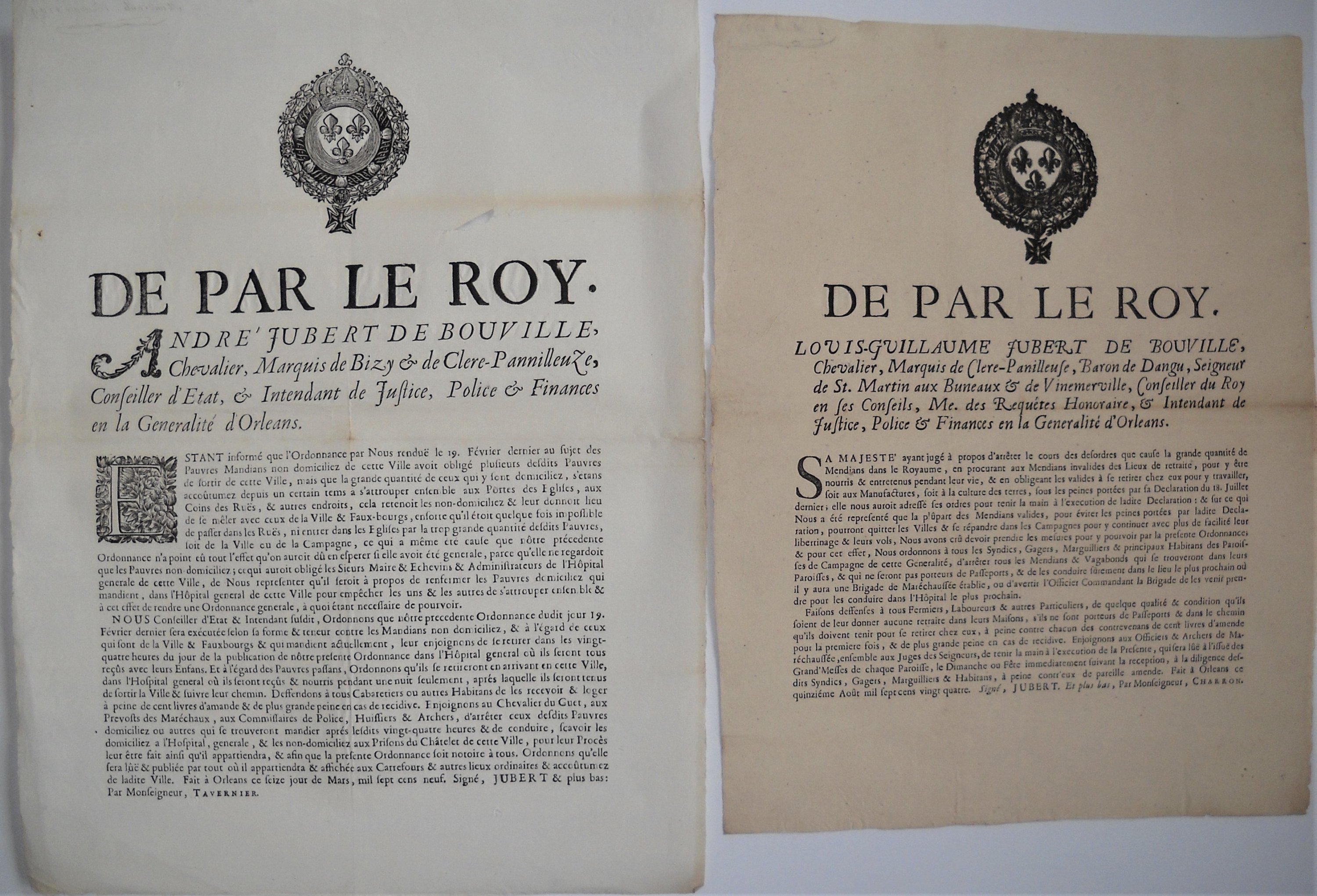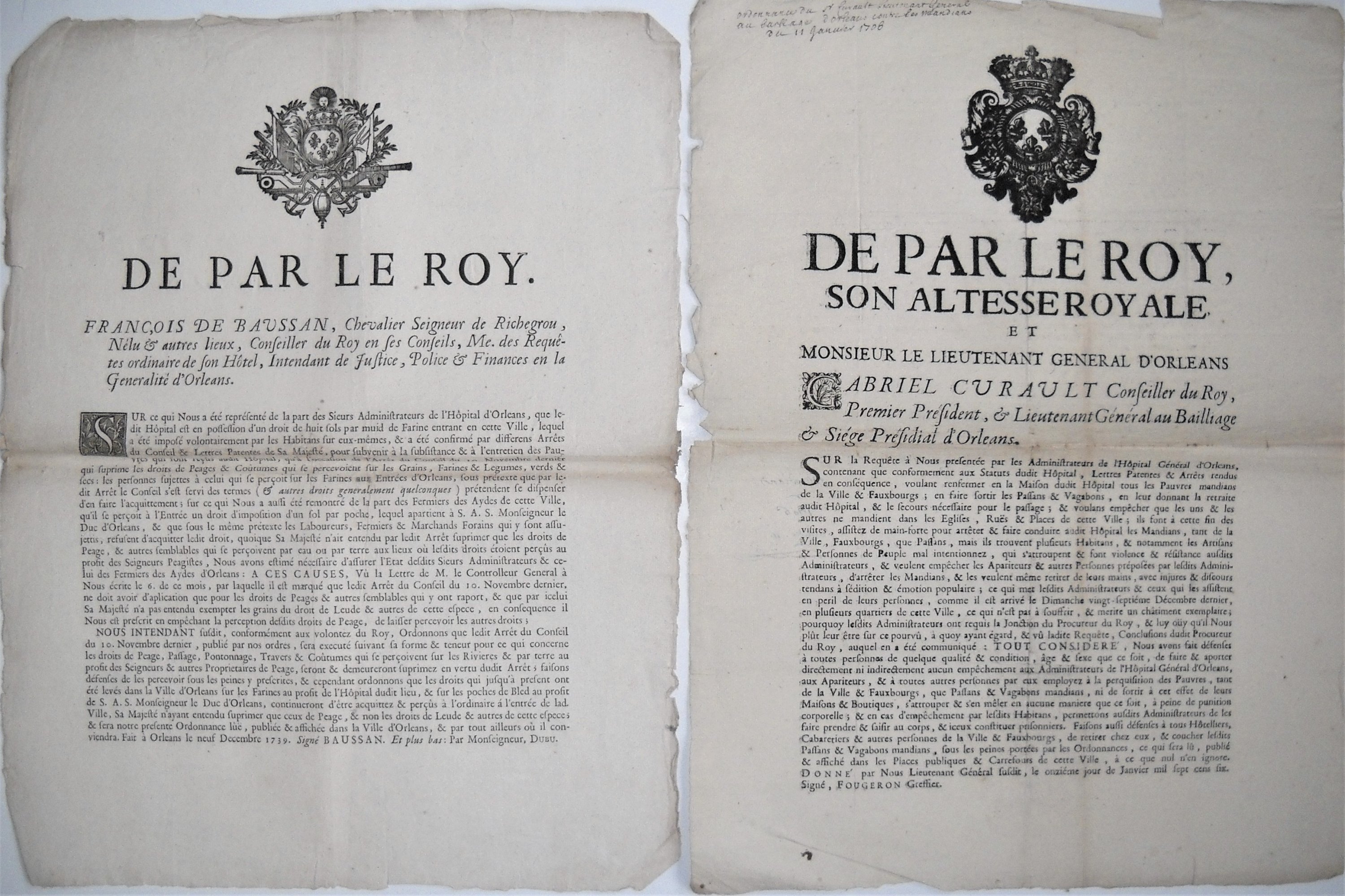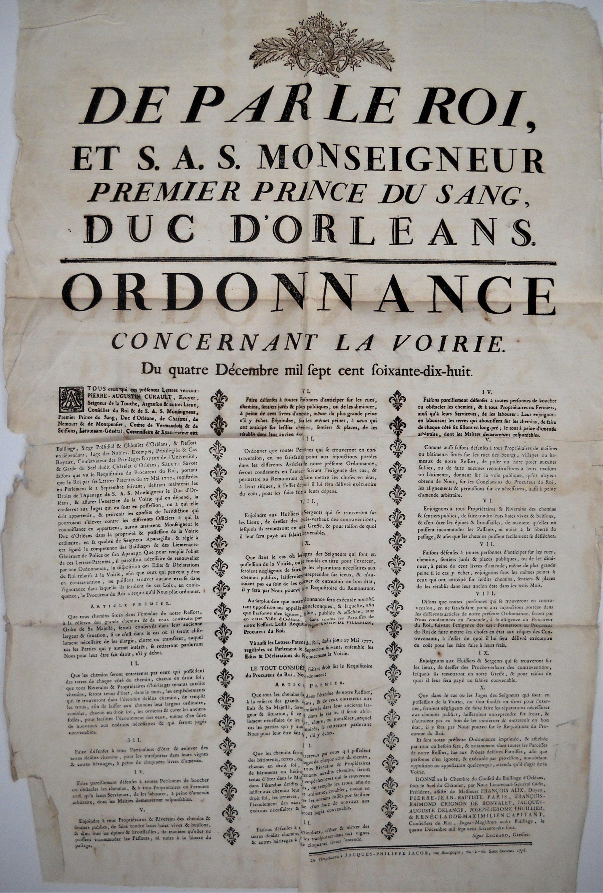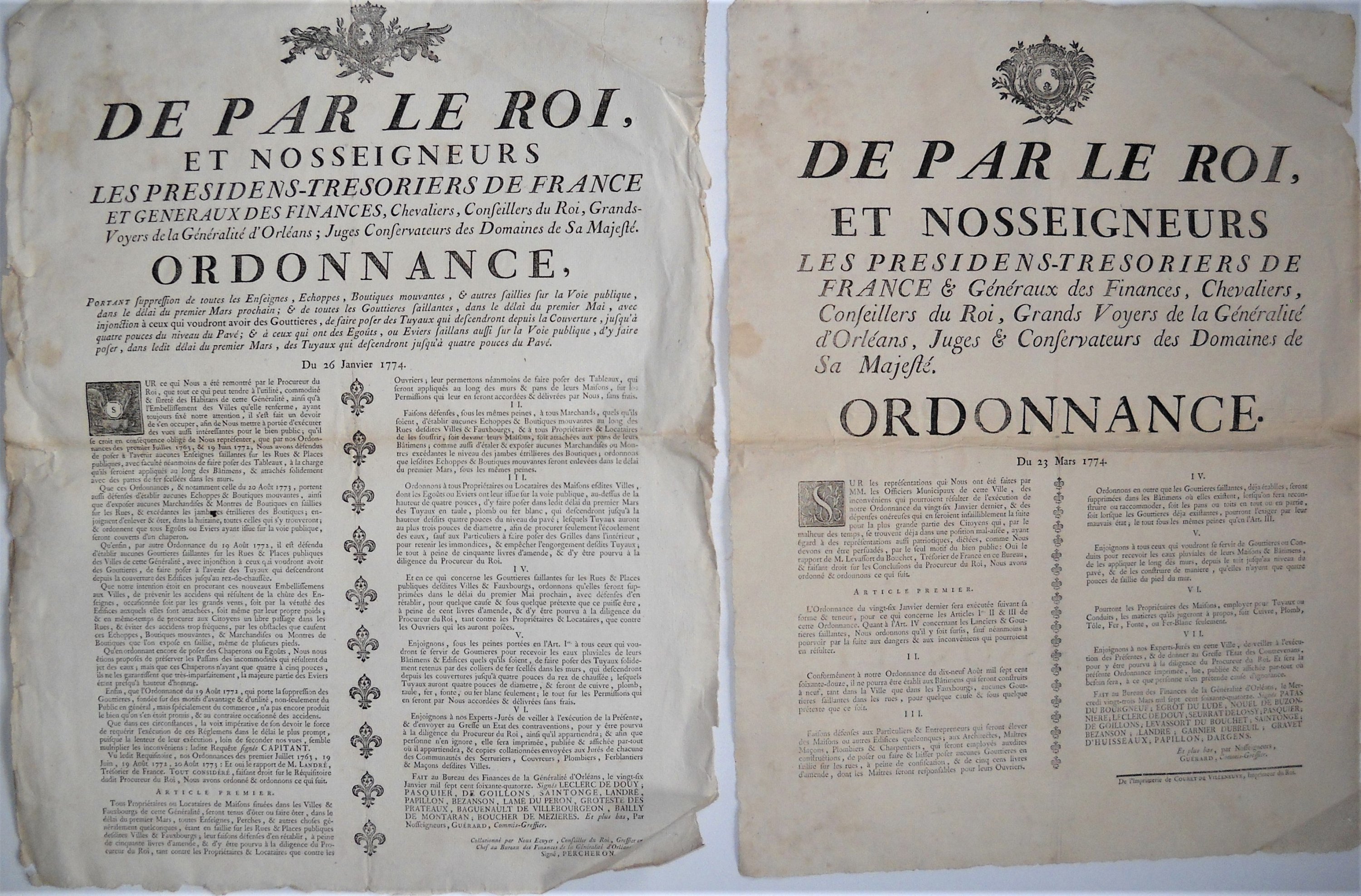 Réunion de 20 ordonnances émises par les intendants et les grands-voyers de la généralité dOrléans, 1709-1778, imprimés sur placards, formats divers dont en majorité env. 50 x 37 cm, bel état de conservation (plis, rousseurs).