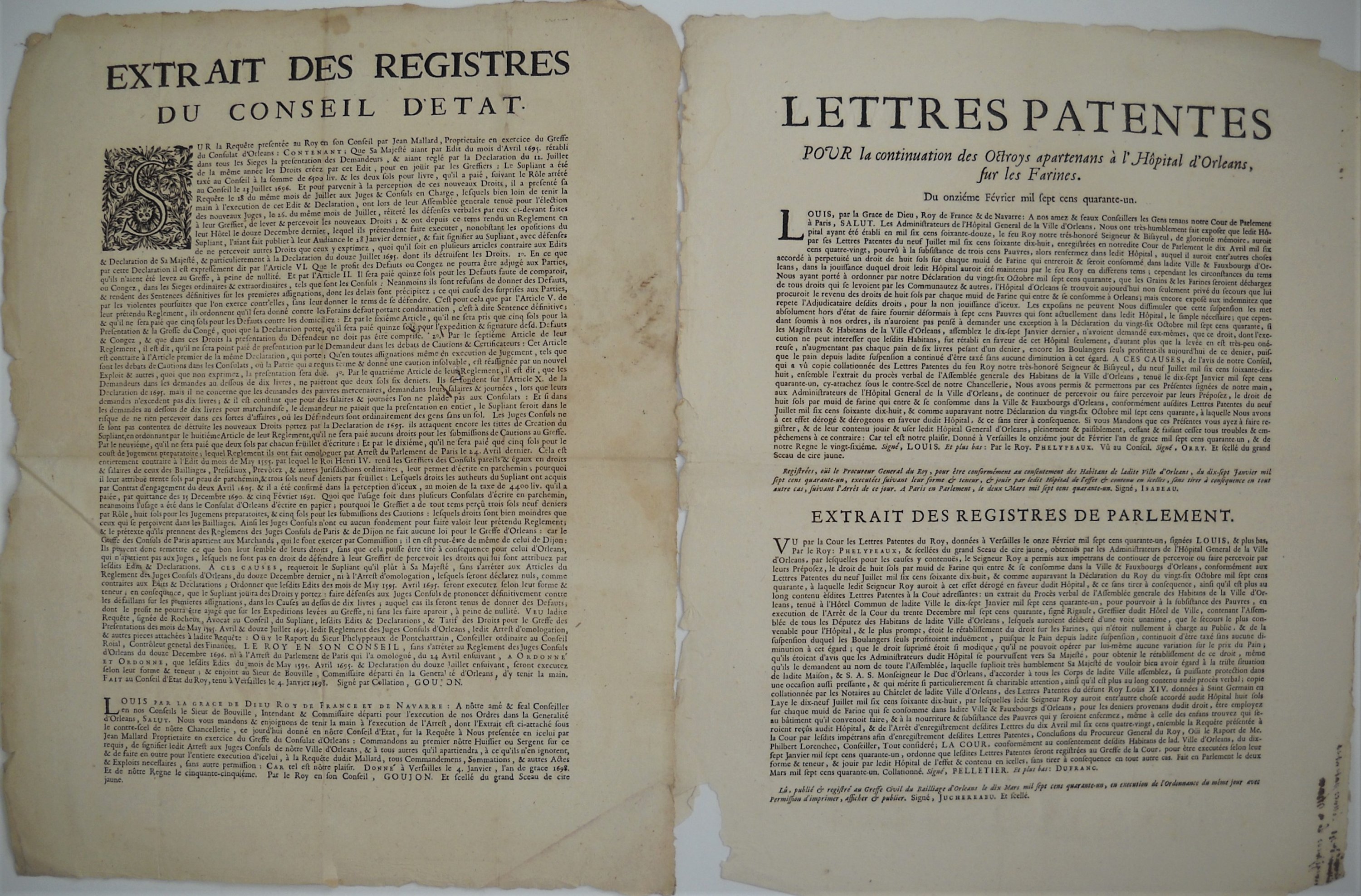 Règlements sur le fait des compétences en la prévôté dOrléans, portant sur rétablissement du droit sur les farines et barrages sur les grains en faveur des pauvres de lhôpital-général de la ville dOrléans, la suppression du droit de pontonage sur le pont de la ville dOrléans et des droits de neuvage et de lansage consistant à un péage pour chaque nouveau marchand qui passe ou fait passer sous le pont ; concernant les manufactures et la défense des marchands dOrléans ; la réduction du nombre des offices municipaux à vendre dans la généralité dOrléans ; sur limposition des offices dinspecteurs et contrôleurs des jurandes de maîtrise et dans les communautés darts et métiers ; la présentation des titres détablissement des deniers patrimoniaux, octrois anciens ou nouveaux, biens communaux et autres revenus dont jouissent les communautés et paroisses de la généralité dOrléans ; la taxation de lentrée des farines dans la ville dOrléans appartenant à lhôpital de cette ville ; la création de droit sur les vins pour payer les gages des offices municipaux dans la généralité dOrléans ; la tenue obligatoire des assemblées générales de commerce ; pourvoir à la liberté du cours des eaux par les fossés appelés jurés, soit le long des grandes routes et autres chemins royaux, soit le long des chemins de communication ; etc.