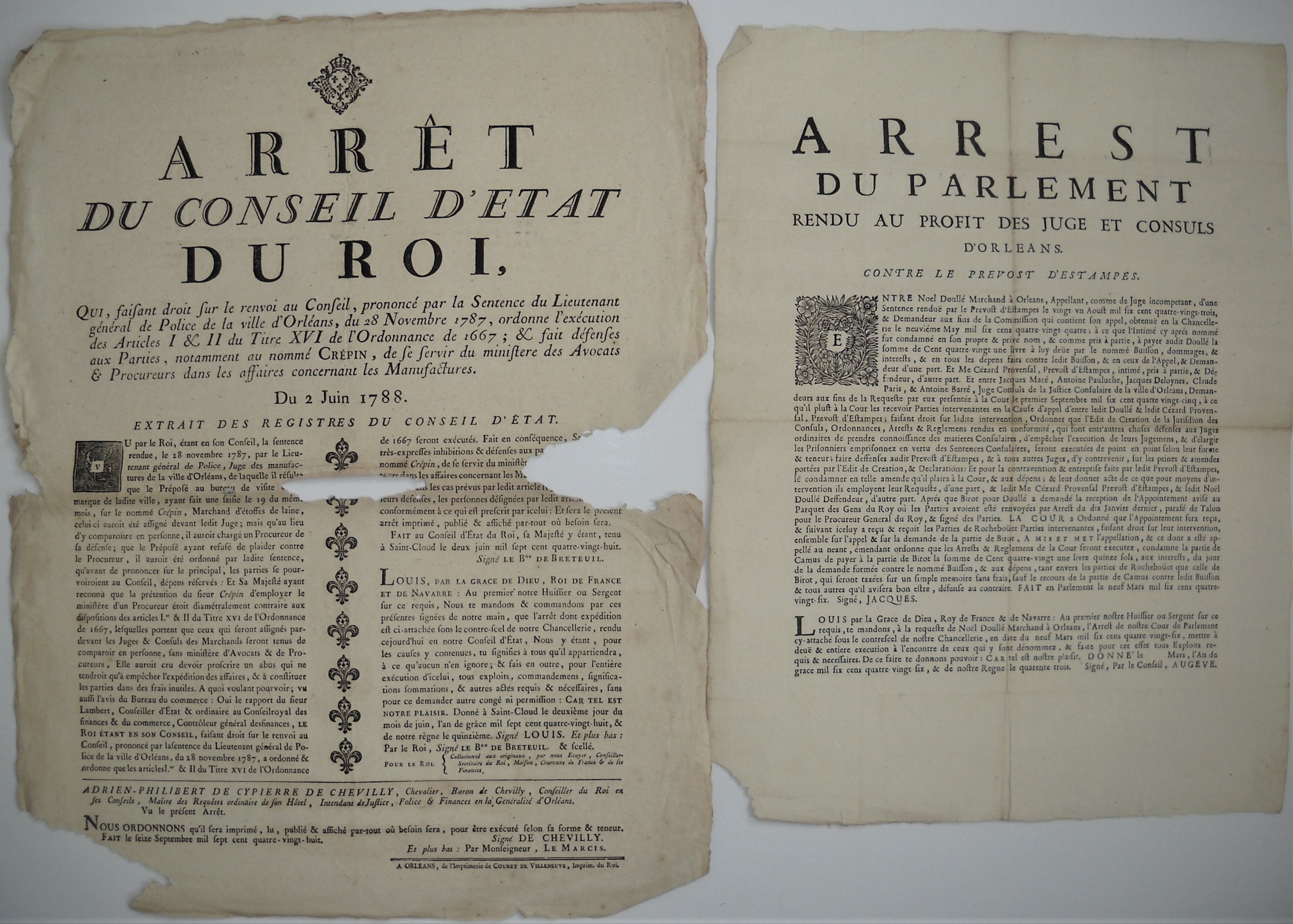 -1788, imprimés sur placards, formats divers dont en majorité env. 50 x 37 cm, bon état de conservation (plis, rousseurs, qqs manques).