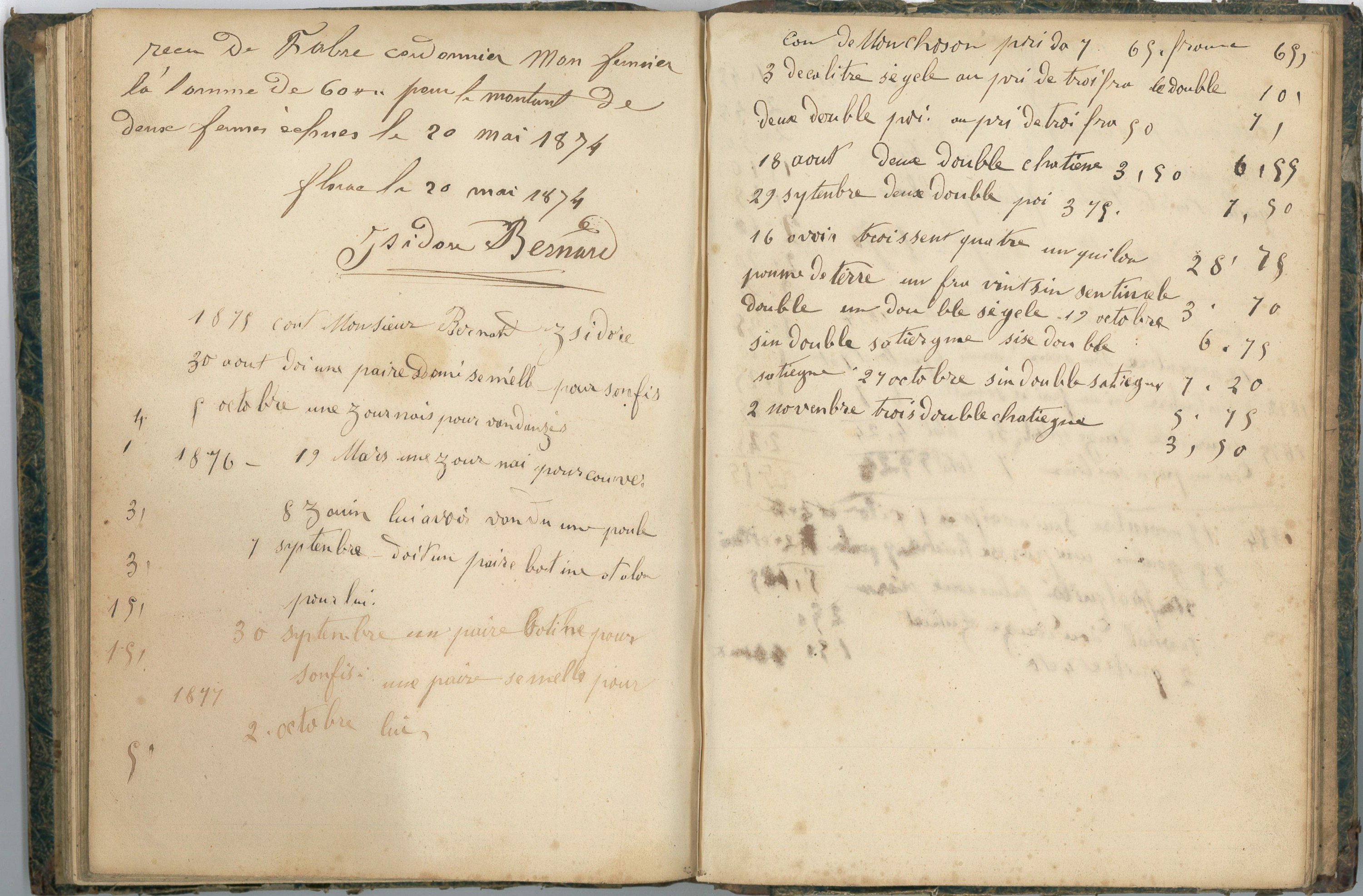Cahier manuscrit rel. 40 pp. in-4, 1866-1876 ; livre de compte de Pierre Fabre, cordonnier né et demeurant à Florac, qui épouse Marie Boulet le 4 mai 1870 à Ispagnac.