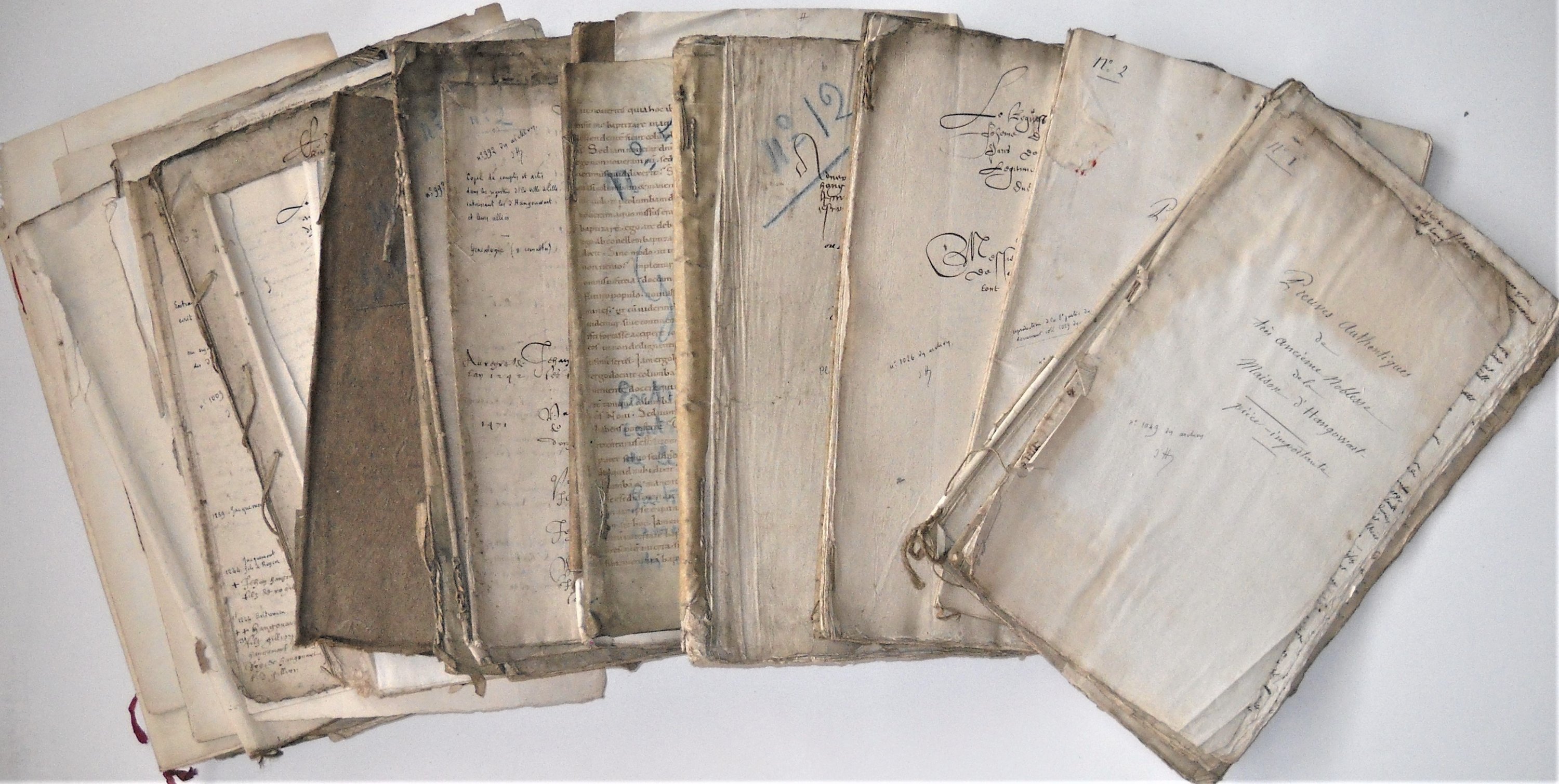 Réunion de + de 50 pièces manuscrites, 16e au 18e siècles, papier et parchemin, formats divers, avec annotations manuscrites, sur chaque document original, du marquis dHangouart, auteur de « Analyse généalogique des Archives de la Maison d'Hangouart. 900 ans d'histoire d'une vieille famille de Lille », publié en 1930.