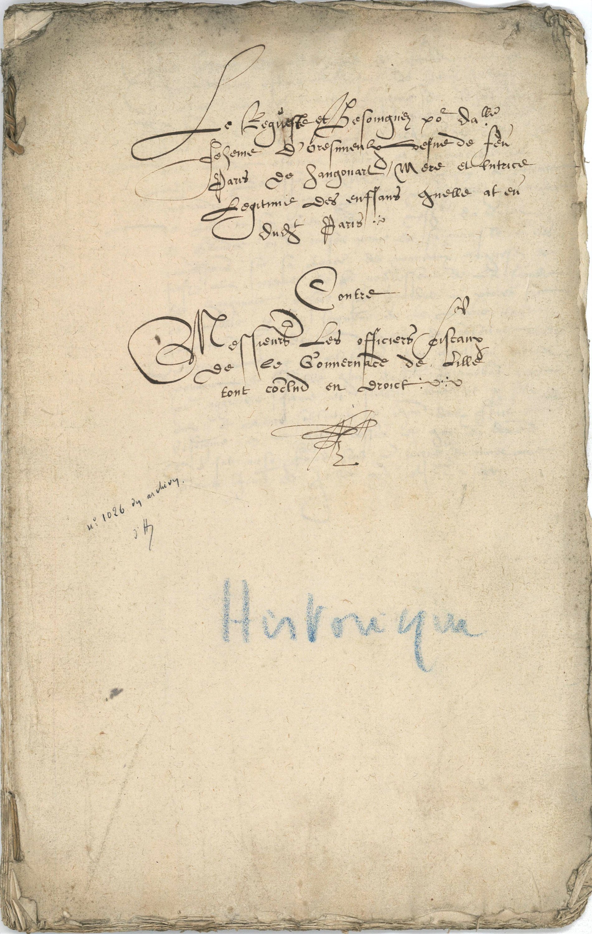 2 mémoires, « Le registre et besoingnes pour damoiselle Jeanne Doresmieulx veusve de feu Paris de Hangouart mère et tutrice légitime des enffans quelle at eu dut Paris contre messieurs les officiers de la gouvernance de Lille