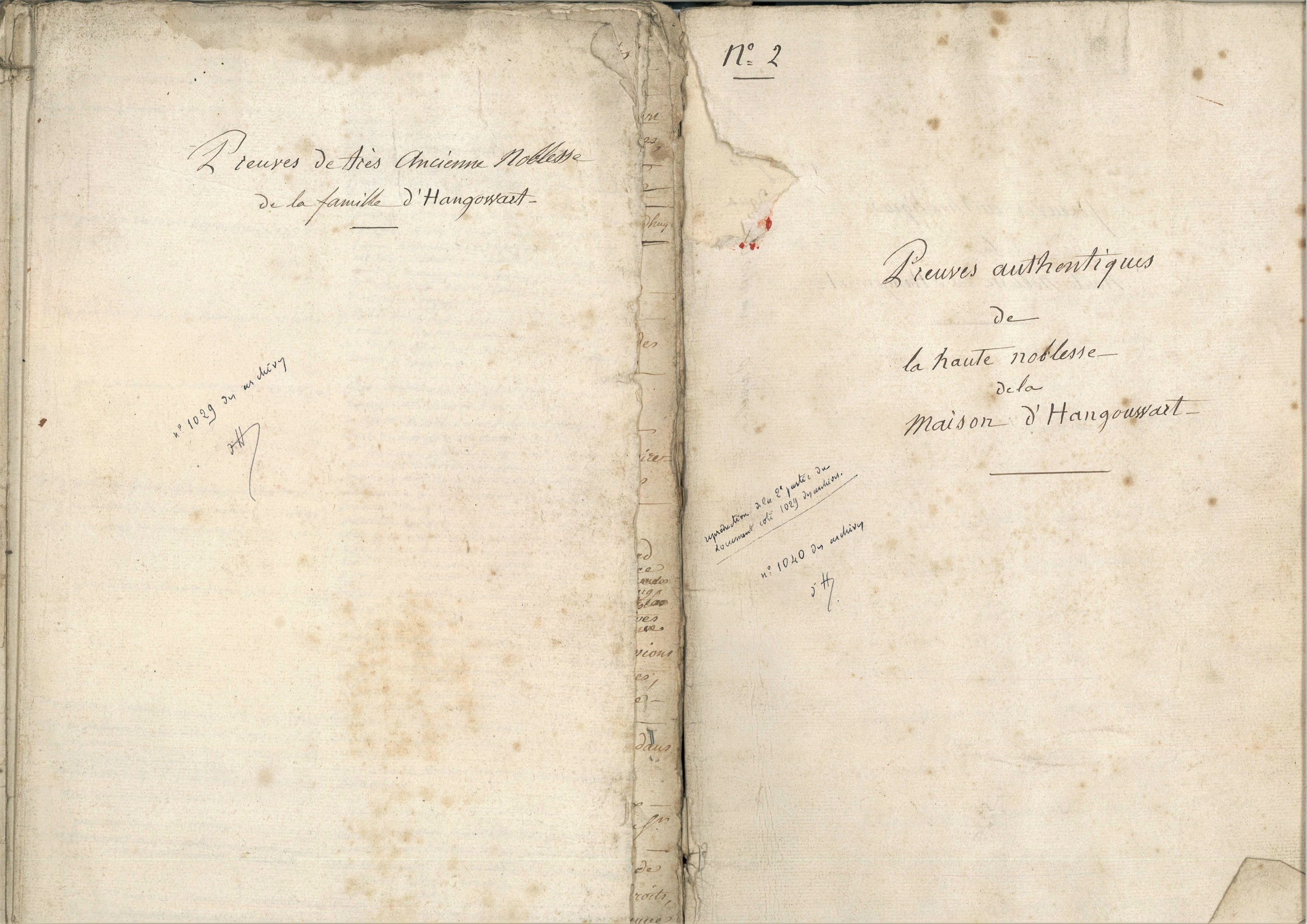« Preuves de très ancienne noblesse de la famille dHangouwart », 18e siècle, 27 pp. in-4 ;