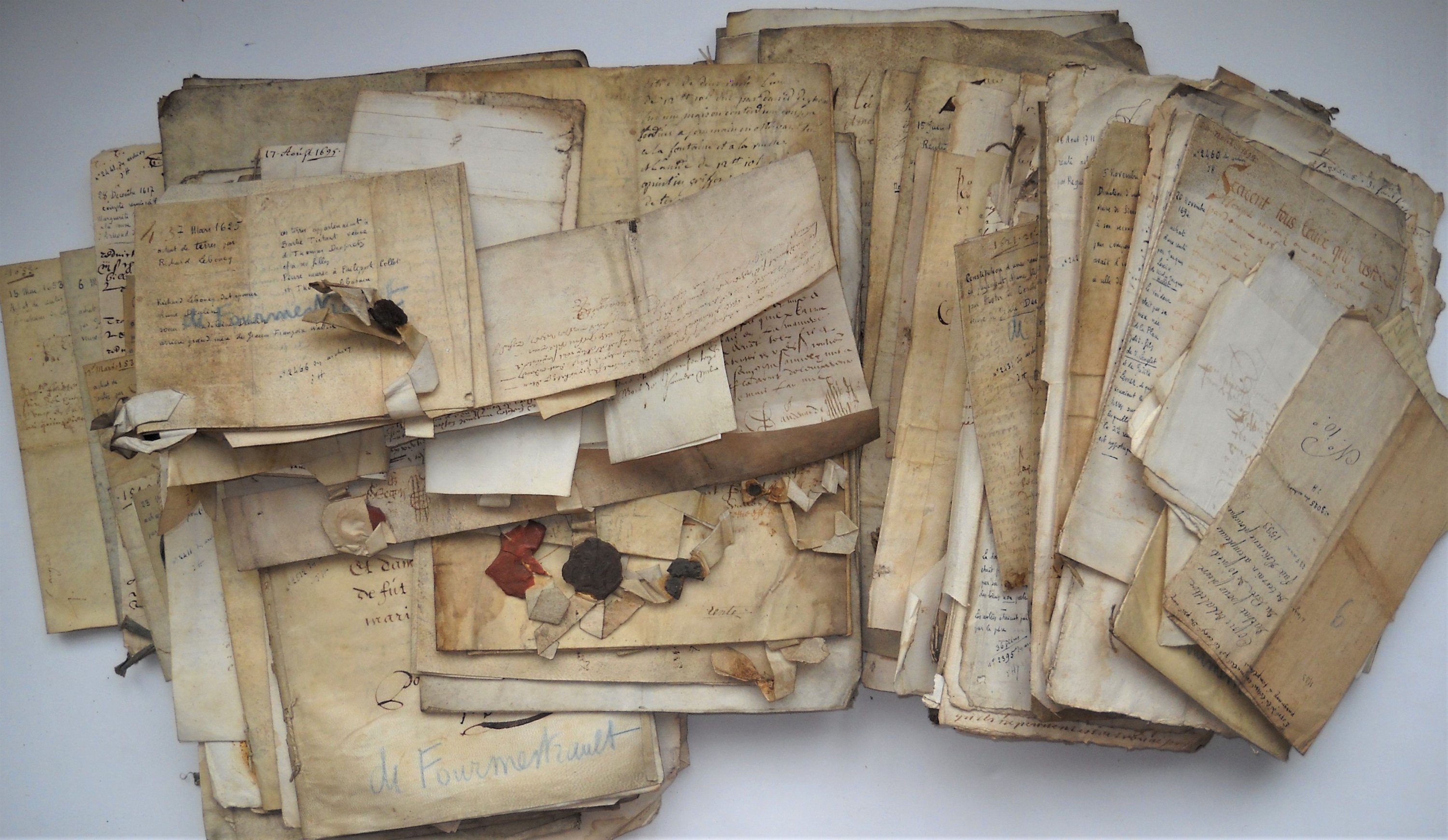 Réunion de + de 130 pièces manuscrites, 16e au 18e siècle, papier et parchemin, formats divers, avec annotations manuscrites, sur chaque document original, du marquis dHangouart, auteur de « Analyse généalogique des Archives de la Maison d'Hangouart. 900 ans d'histoire d'une vieille famille de Lille », publié en 1930, relatives à la seigneurie de Fourmestraux et aux familles Ran de la Fontaine, Lefranc, Claret, Desmaetz, Flameng, de Langlet, etc.