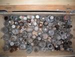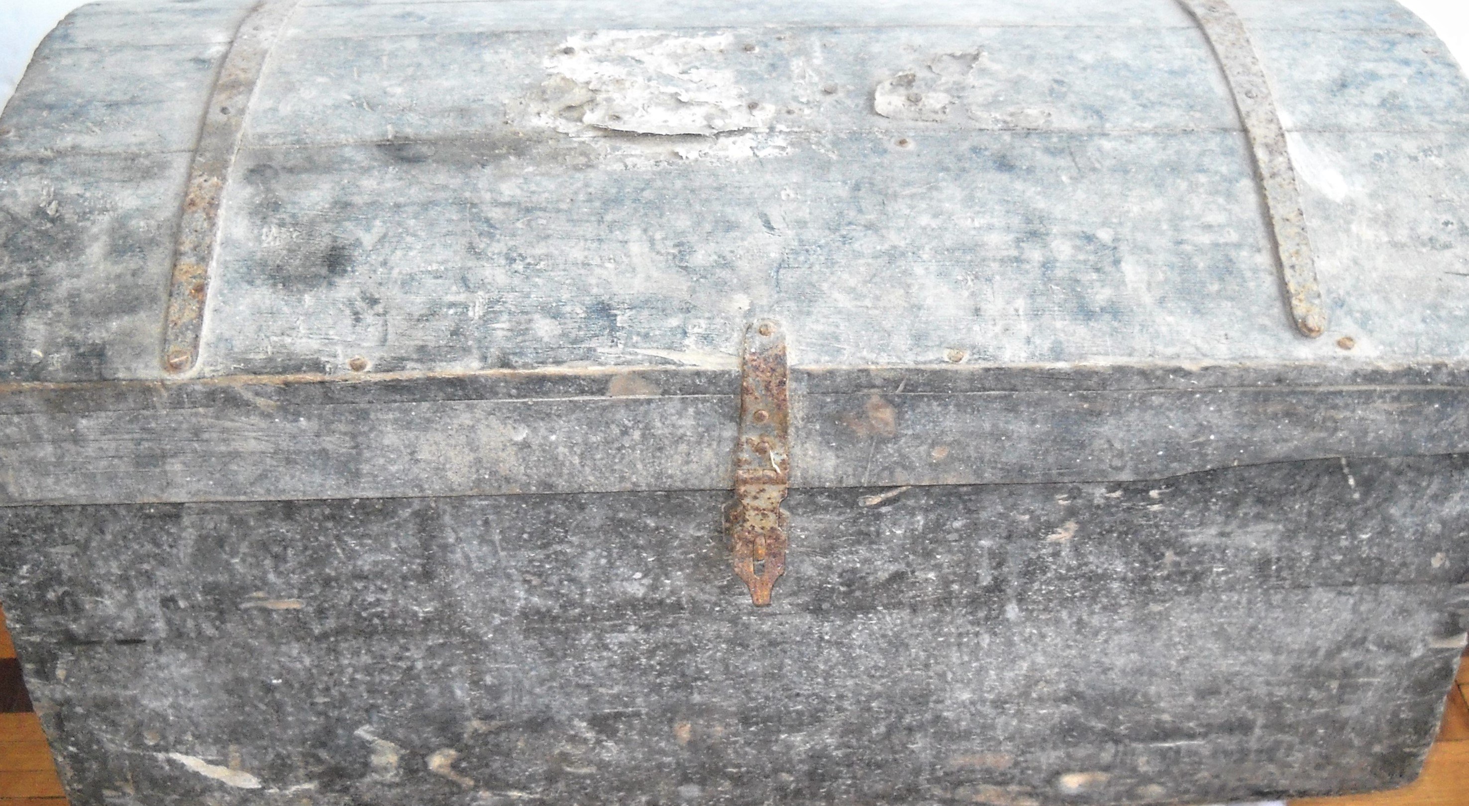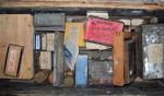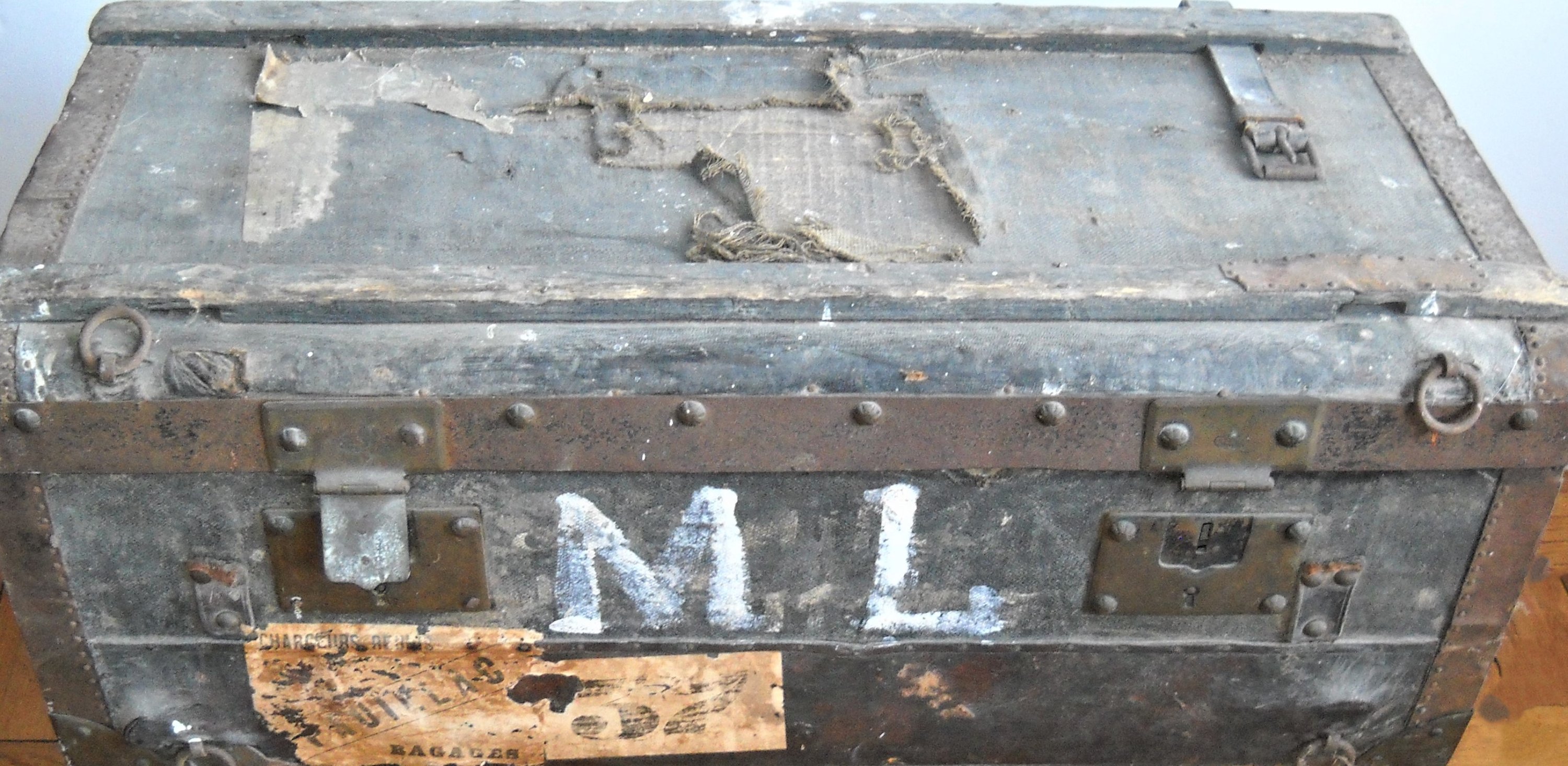 Malle de voyage marquée aux initiales « M.L. » (67 x 32 x 25 cm) contenant de nombreuses boites de plaques photographiques vierges, cadres, outillage et produits divers pour le tirage des photos, des paquets de cartouches pour revolver d’ordonnance modèle 92, des objets d’art en bronze et en bois dont 2 lourds bracelets de cheville pour jeunes filles en âge de mariage.