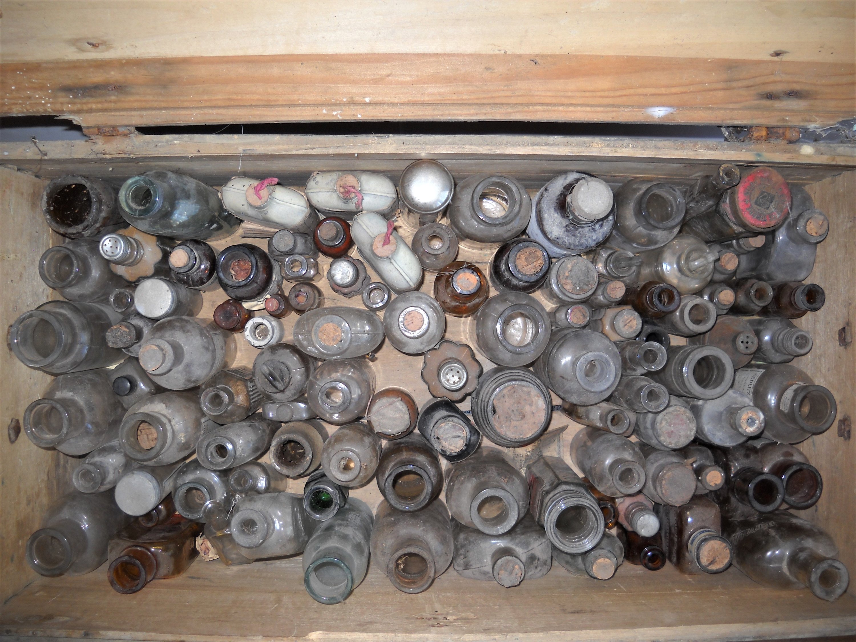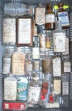 Une seconde malle en bois (66 x 35 x 30 cm) contenant plus de 130 flacons de produits médicamenteux et hygiéniques, vendus en France et en Tunisie, vers 1880-1910.