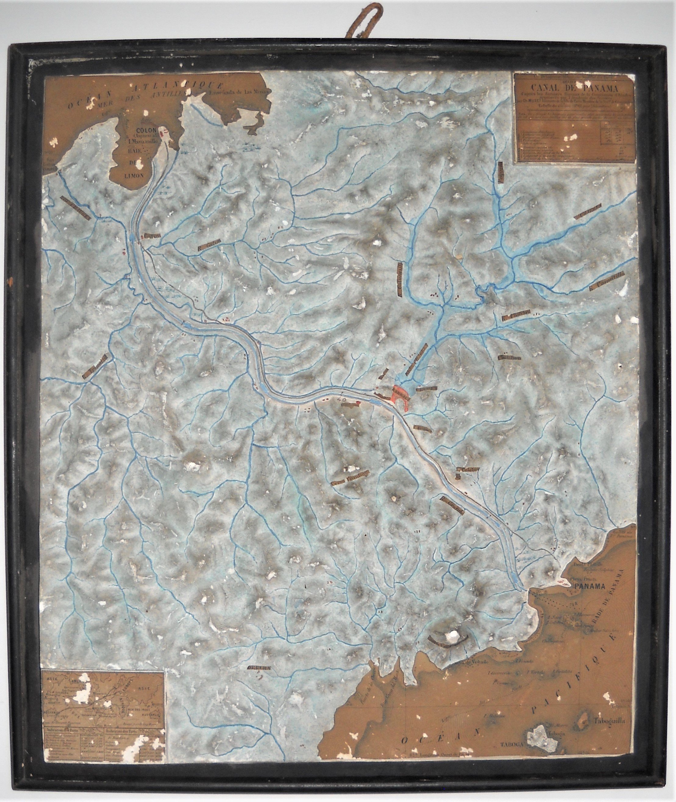 Plan-relief du canal de Panama, début du 20e siècle, édité par Delagrave à Paris, daprès les travaux de Charles Muret, géomètre de la ville de Paris, 40 x 35 cm.