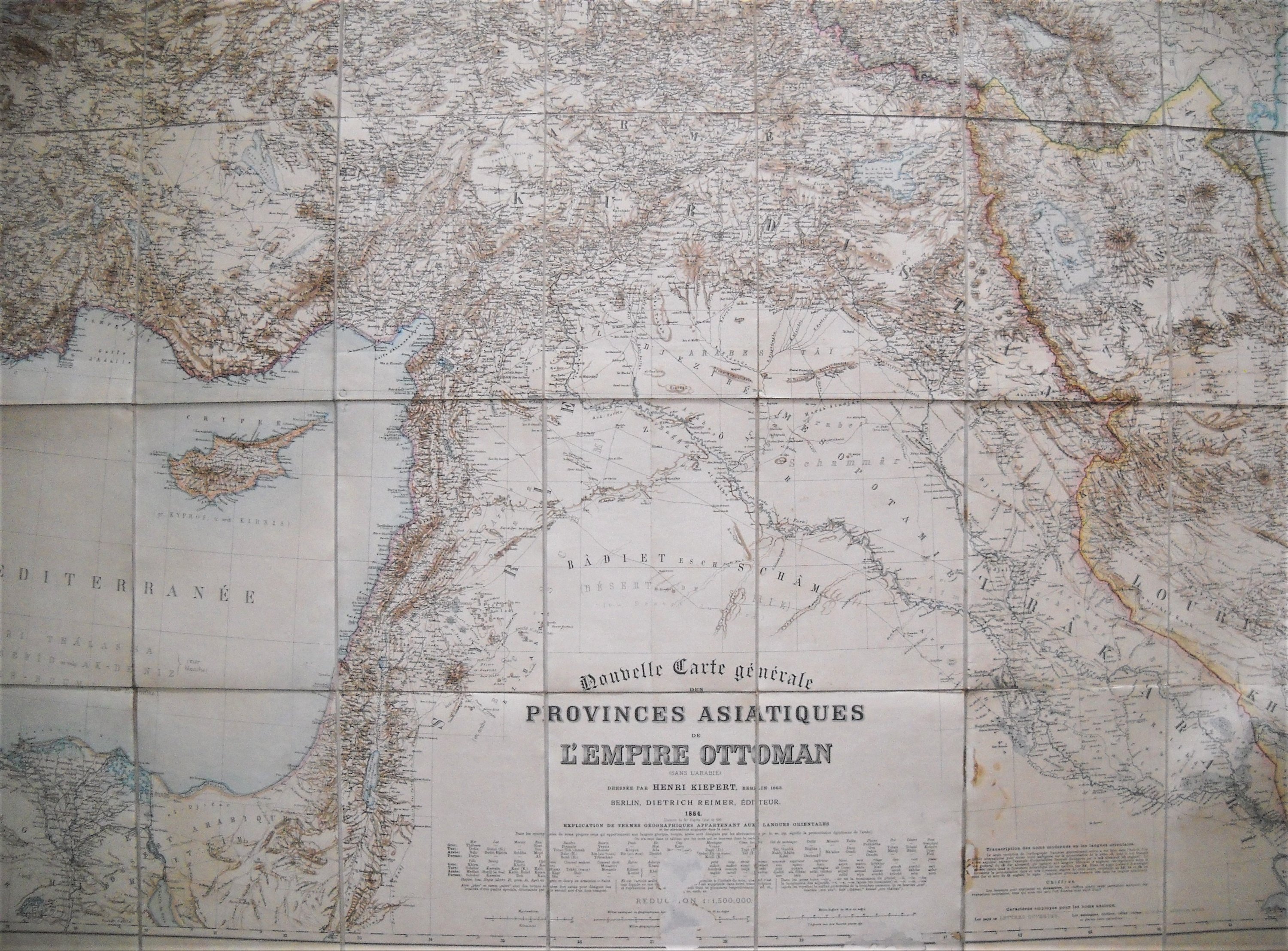 « Nouvelle carte générale des provinces asiatiques de L'empire Ottoman: sans L'Arabie. Dressée par Henri Kiepert, Berlin. 1883. Berlin, Dietrich Reimer, Editeur 1884. Chemin de fer de létat de 1891. » ; 100 x 164 cm (petits manques en bas).