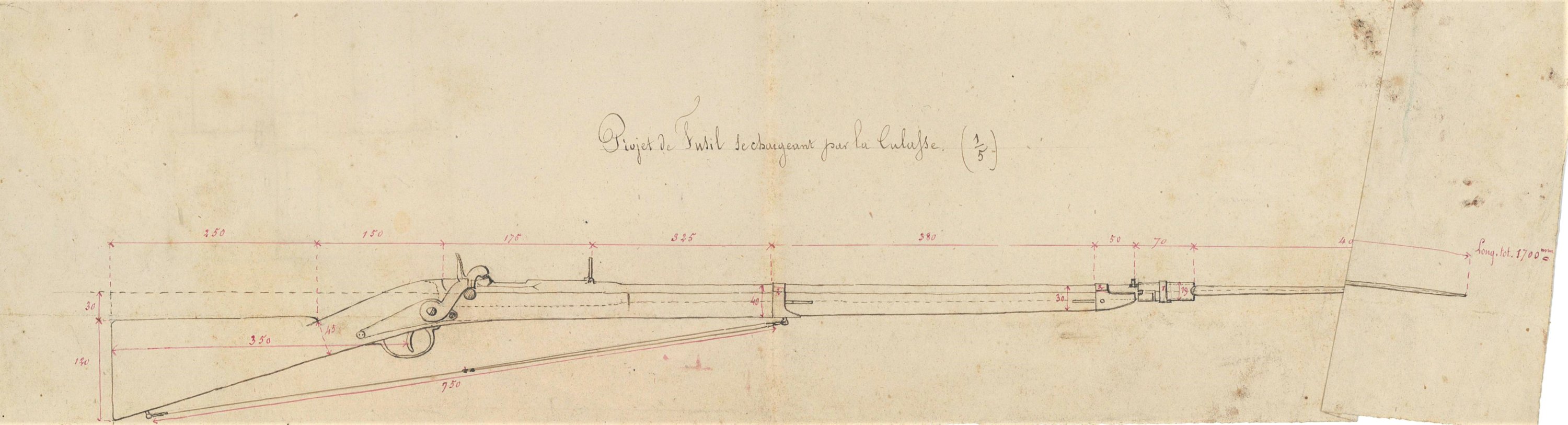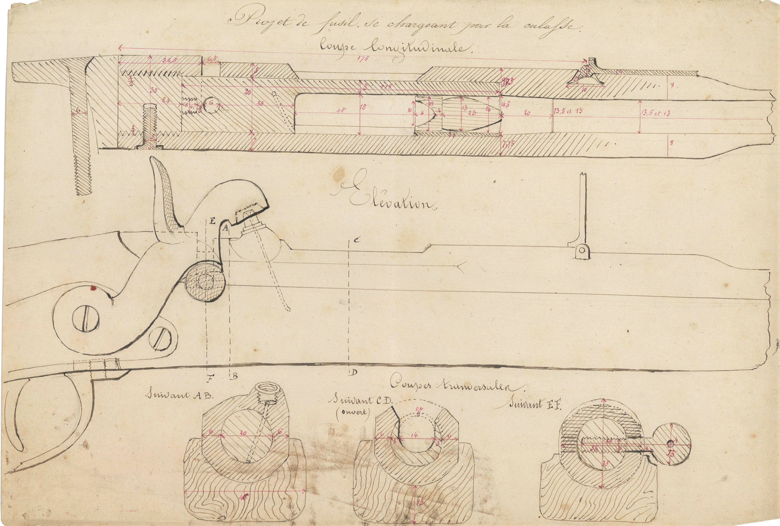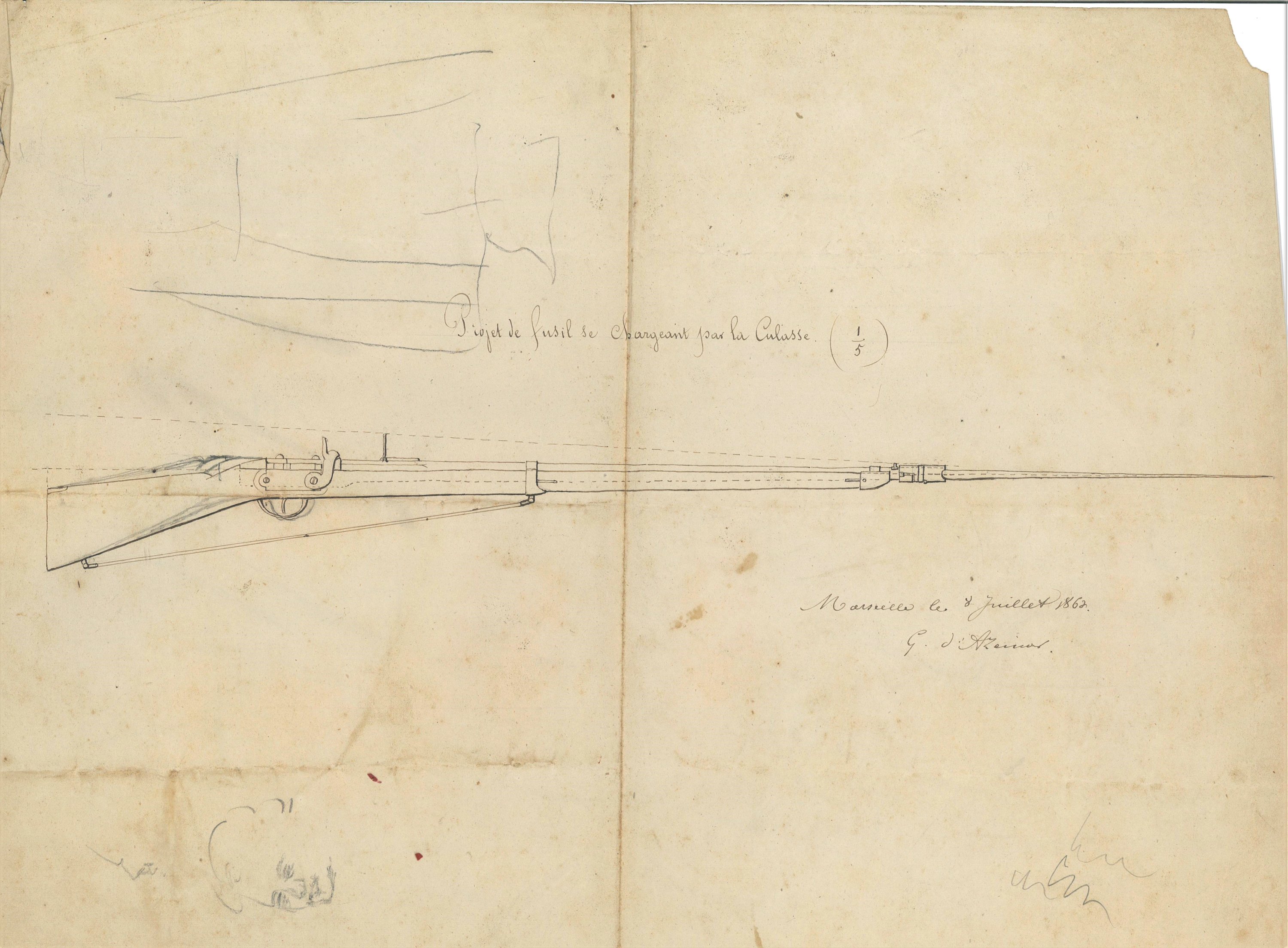 - Projet de fusil se chargeant par la culasse, manuscrit à la plume avec corrections et ratures, 35 pp. in-4 ; copie-brouillon dun mémoire rédigé par Gaston dAzémar vers 1863, lieutenant au 64e régiment dinfanterie, sur la conception dun nouveau type de fusil à aiguille, accompagné de 3 croquis à la plume et copie manuscrite dune lettre datée du 18 octobre 1866 du secrétaire dEtat de la guerre lui signifiant ne pas donner suite à ce projet de construction dune nouvelle arme, jugé défectueux par la commission dartillerie ;
