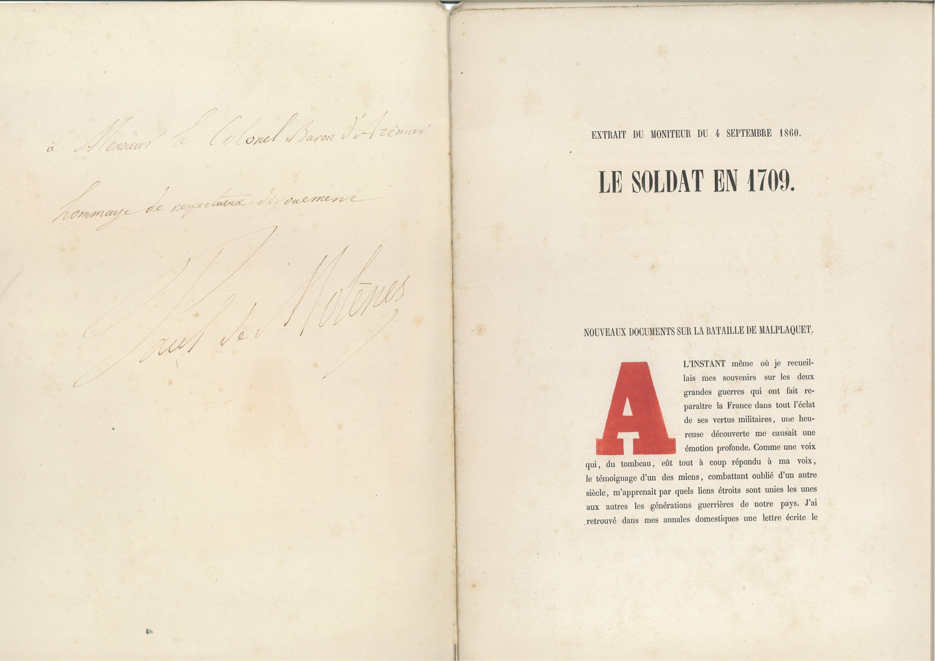 - Paul Gaschon de Molènes (1821-1862), officier militaire et homme de lettres, Le Soldat en 1709, Maubeuge, Imp. Decaussenne, 14 pp. in-4, avec envoi manuscrit signé : « à Monsieur le colonel baron dAzémar hommage de respectueux dévouement » ;