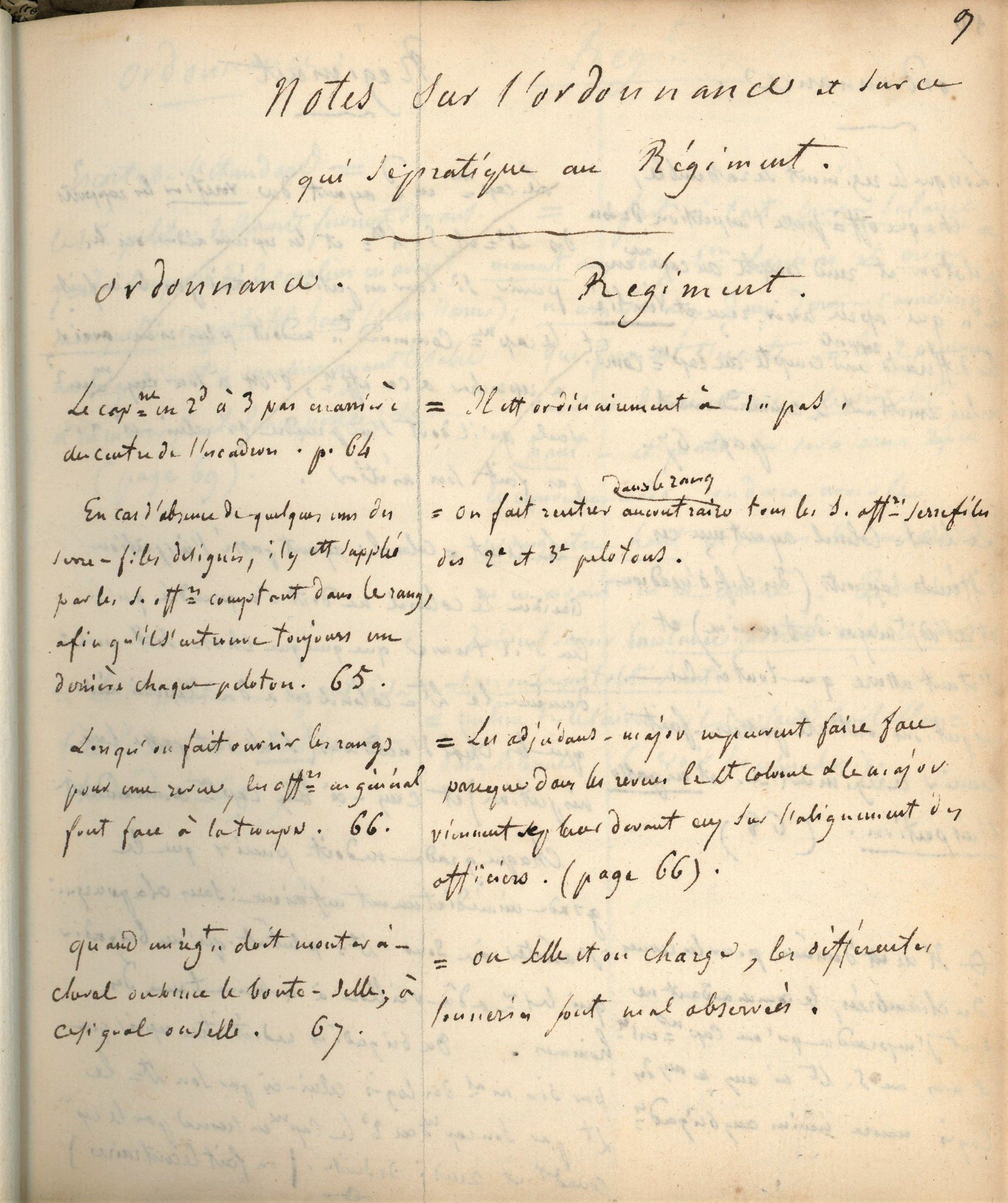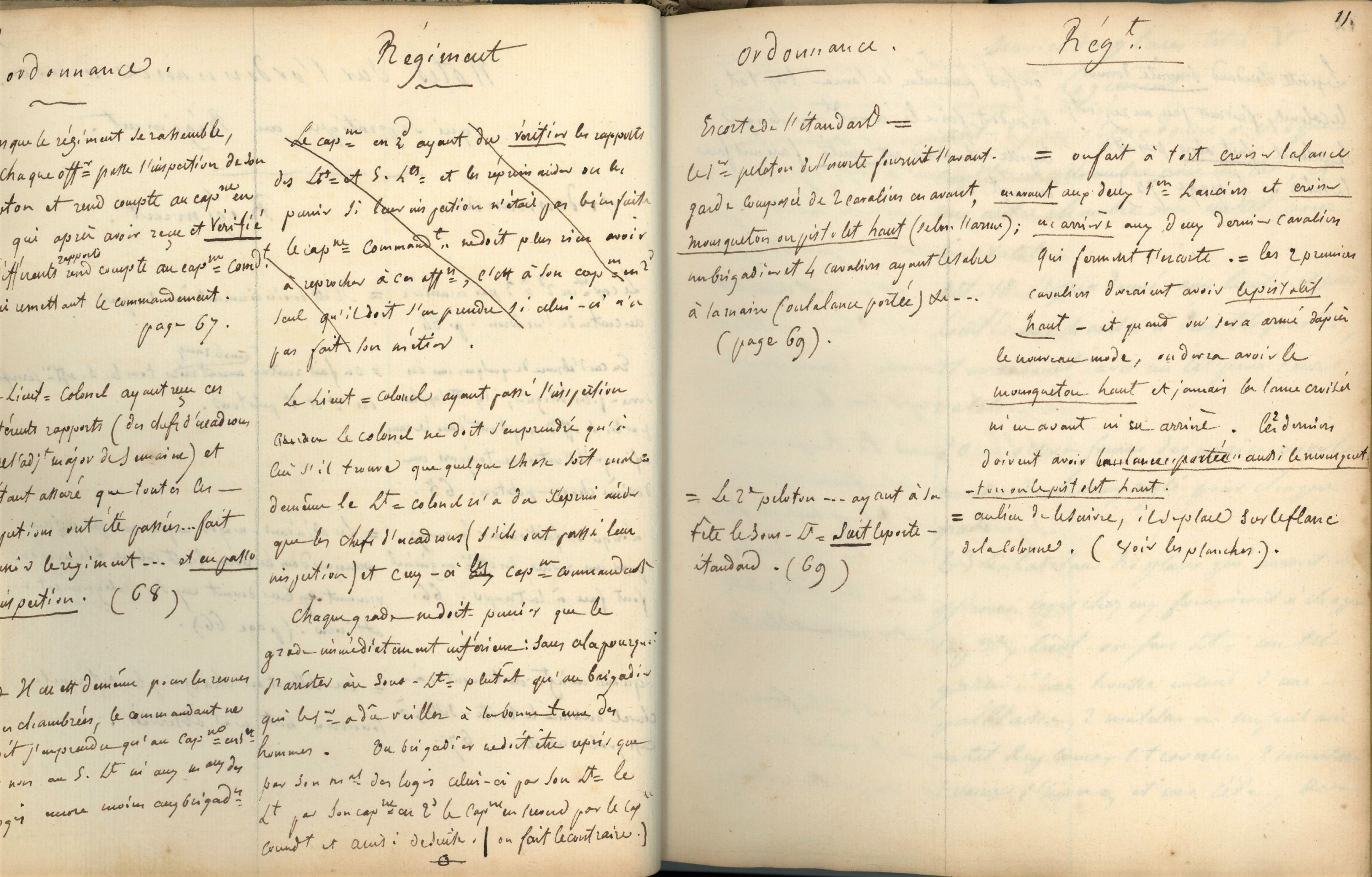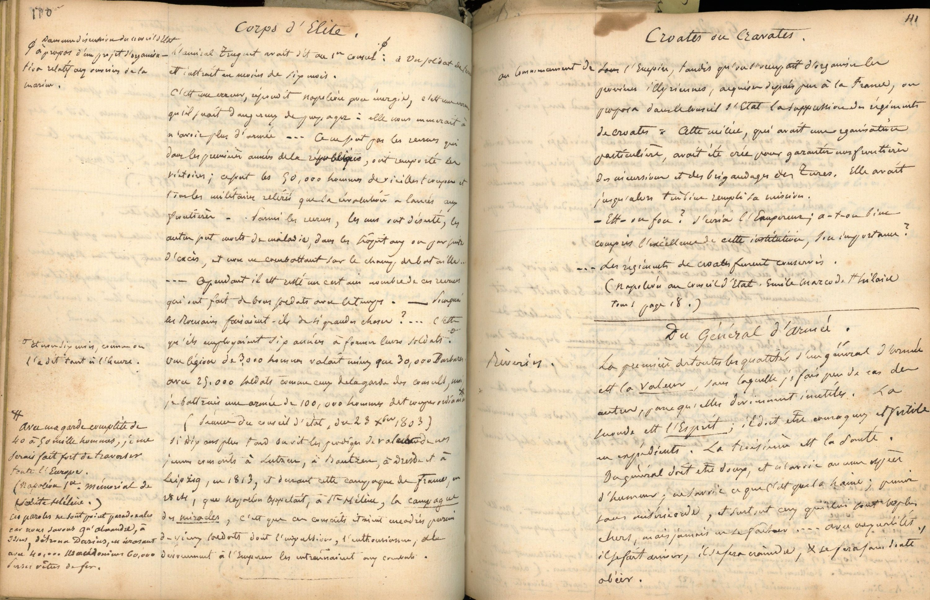 - Carnet relié (en létat), + de 280 pages in-8, contenant les notes manuscrites de lecture, de réflexion et de coupures de journaux relevés par le général Léopold baron dAzémar vers 1860-1880. Les sujets traités se réfèrent essentiellement à lorganisation et aux événements militaires et plus particulièrement à lévolution de la cavalerie, mais aussi à la politique, à la généalogie de la famille dAzémar, recettes de droguerie, etc ;