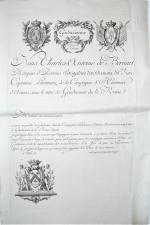 Brevet de congé de retraite, vers 1780, gravé en taille douce, à décor aux armes de France et de la compagnie des gendarmes de la Reine dans la partie supérieure, et dans la partie inférieure aux armes de Charles Antoine de Bernart, marquis dAvernes, capitaine-lieutenant de la compagnie des gendarmes de la Reine de 1780 à 1784, 43,5 x 28,5 cm (plis).