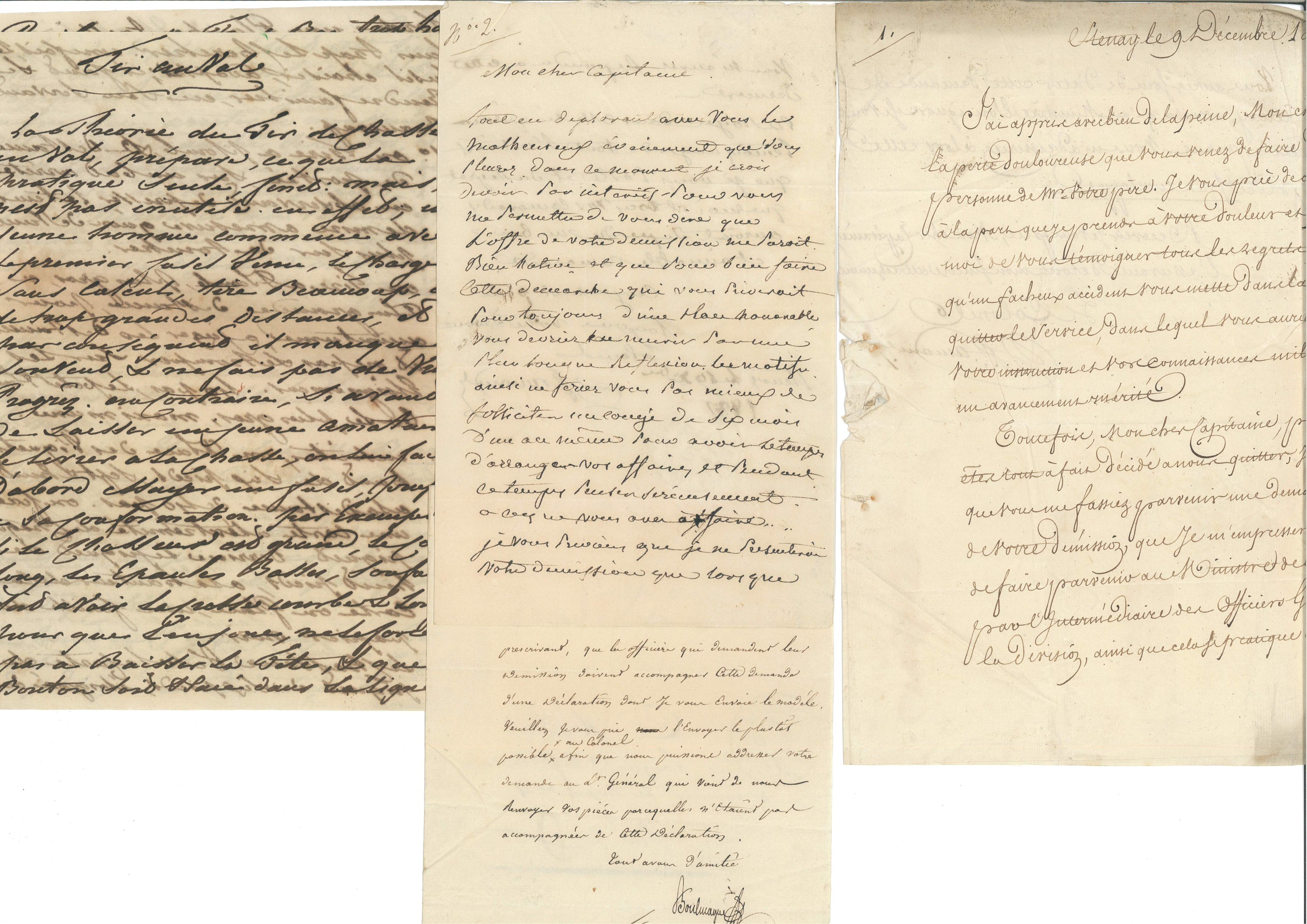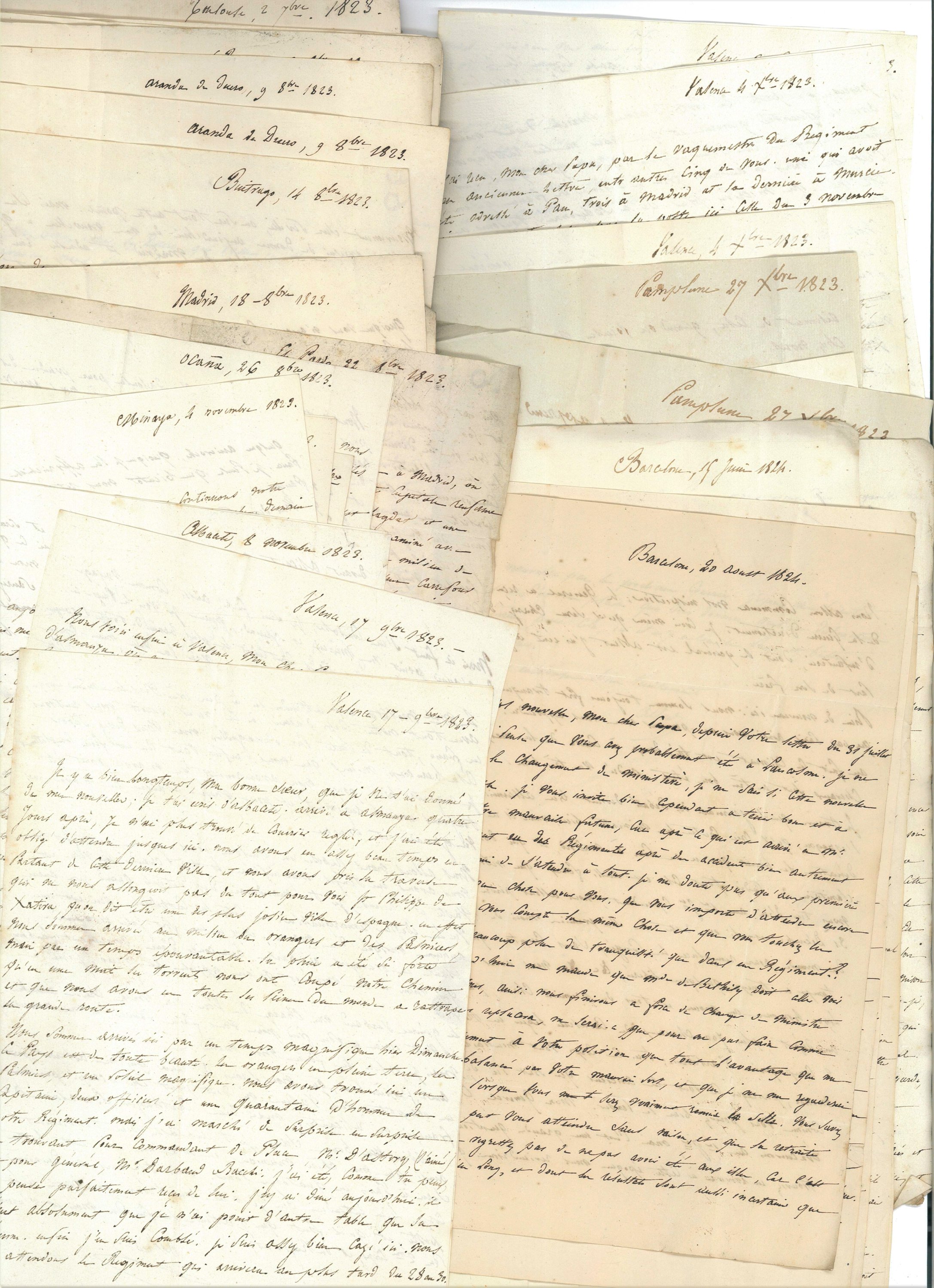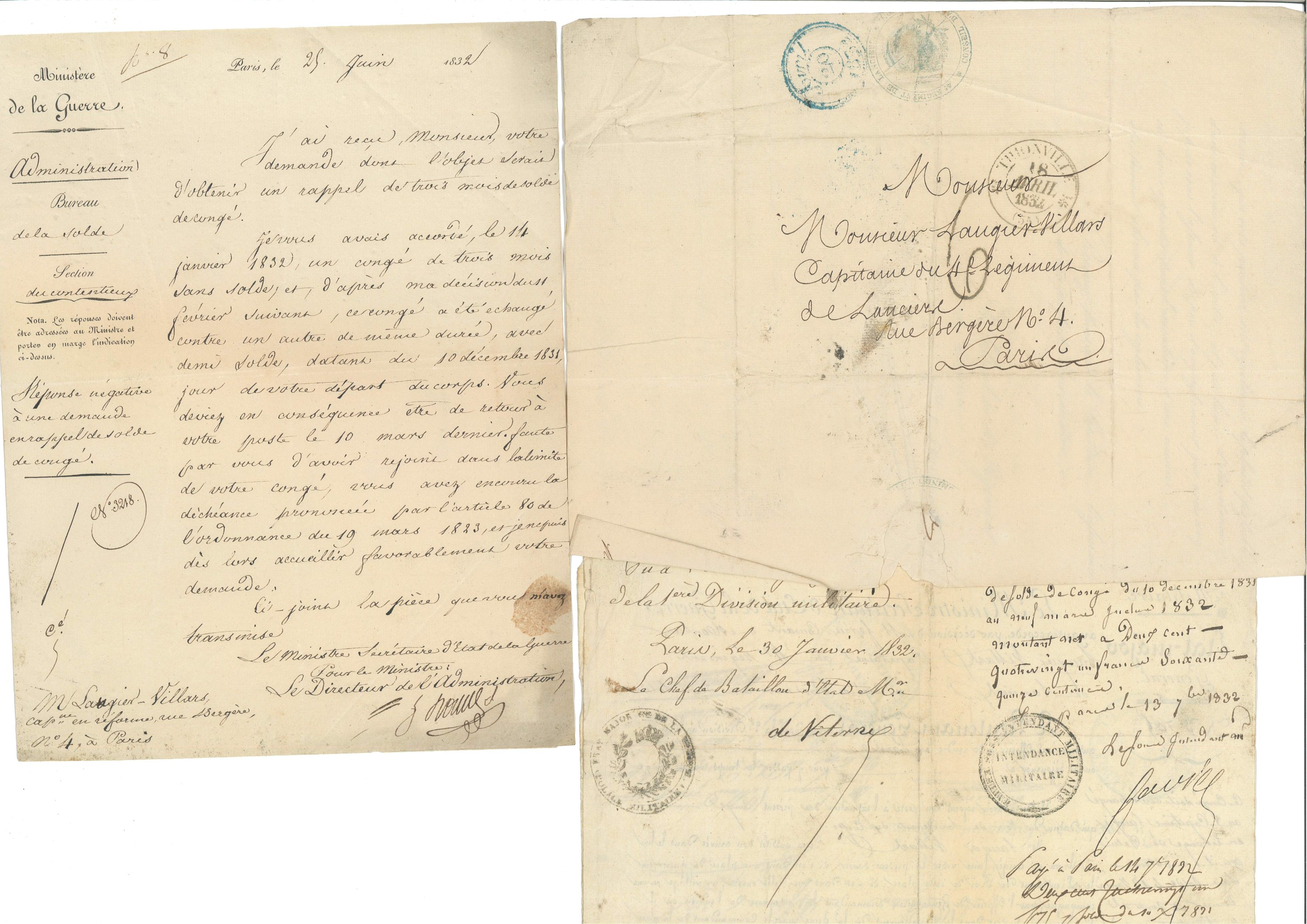 72 L.A.S., 1822-1831, écrites par Alfred de Laugier-Villars, officier de cavalerie, adressées à ses proches dont à son père Louis Henri de Laugier-Villars (1768-1831), colonel de cavalerie, maire de Gagny (Seine-Saint-Denis) de 1813 à 1815.