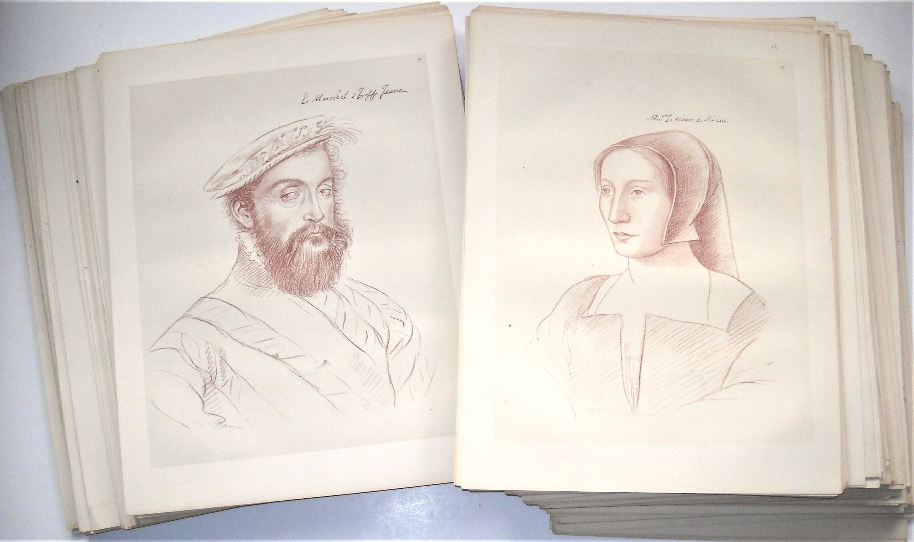 Lot de + de 260 planches lithographiées sur fond teinté, extraites de louvrage publié en 2 volumes à Londres et à Paris en 1875 : « Three hundred French portraits representing personages of the Courts of Francis I, Henry II, and Francis II, by Clouet. Auto-lithographed from the originals at Castle Howard, Yorkshire » par Lord Ronald Gower. Reproduction de la collection des croquis à la sanguine de Jean et François Clouet recueillie par Catherine de Médicis, conservée aujourdhui au château de Chantilly.