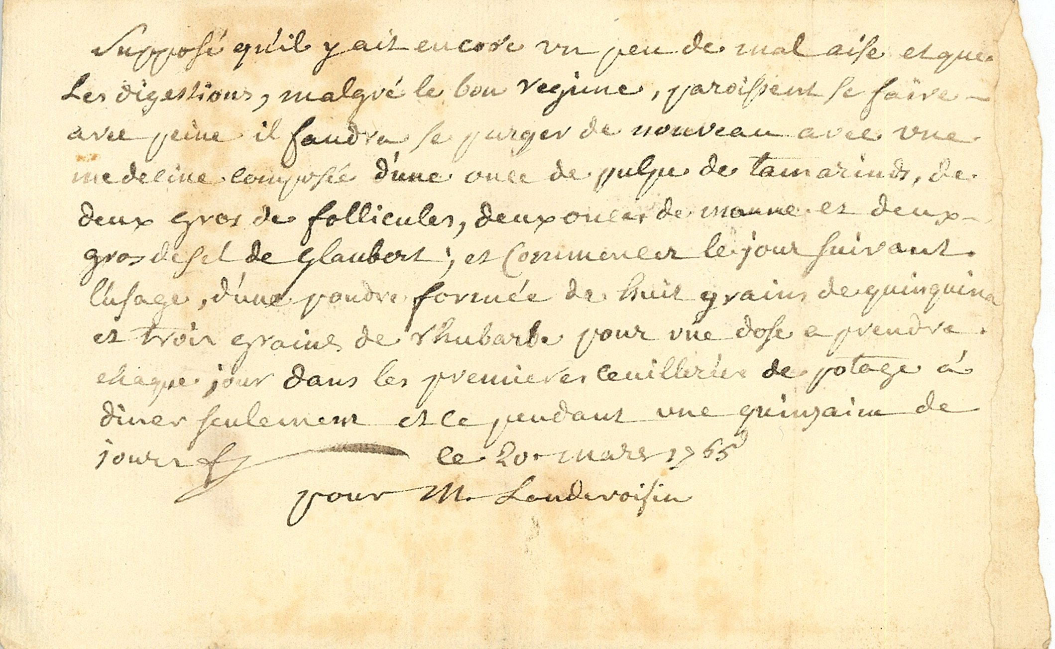 Rare réunion de 3 L.A.S. et 1 L.A., 1765-1787, 5 pages in-8 ; prescriptions médicales adressées à René-Henry Soucanye de Landevoisin, sieur dAuvillers et de Lierval, garde du corps du roi, dont belle L.A.S, Paris, 29 septembre 1777 : « Les farineux sont bons en eux-mêmes, très bons surtout pour une nourrice ; mais labus de cette espèce dalimens épaissit les humeurs, et donne naissance à des viscosités, à des crudités, etc dans lestomac, surtout quand on est du tempérament de Madame la consultante : je lui conseille donc den modérer lusage. Pour en détruire les mauvais effets, je lui conseille 1/ de boire tous les matins, à jeun, pendant huit jours, une pinte deaux nouvelles (