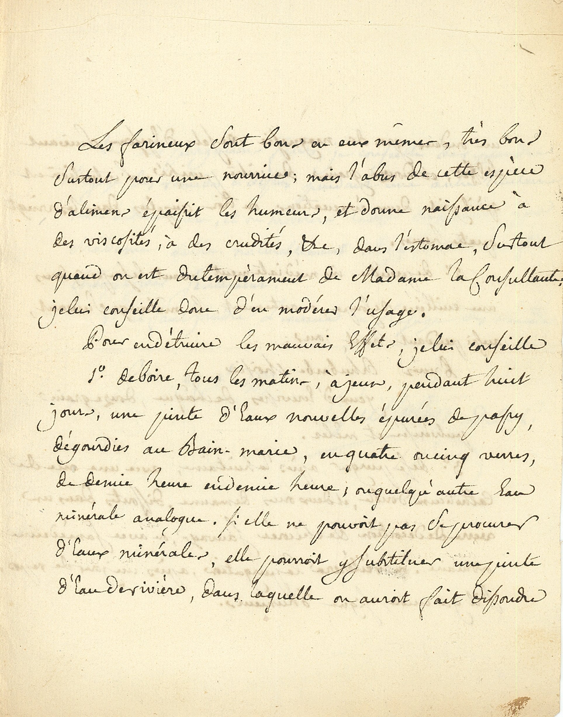 ) 4/ les purgations finies, je conseille de reprendr des remèdes ci-dessus pendant une atre huitaine mais on diminuera, et on modérera la dose de manière que Madame aille naturellement à la garderobe une fois chaque jour seulement. 5/ il faut joindre lexercice à lusage des remèdes