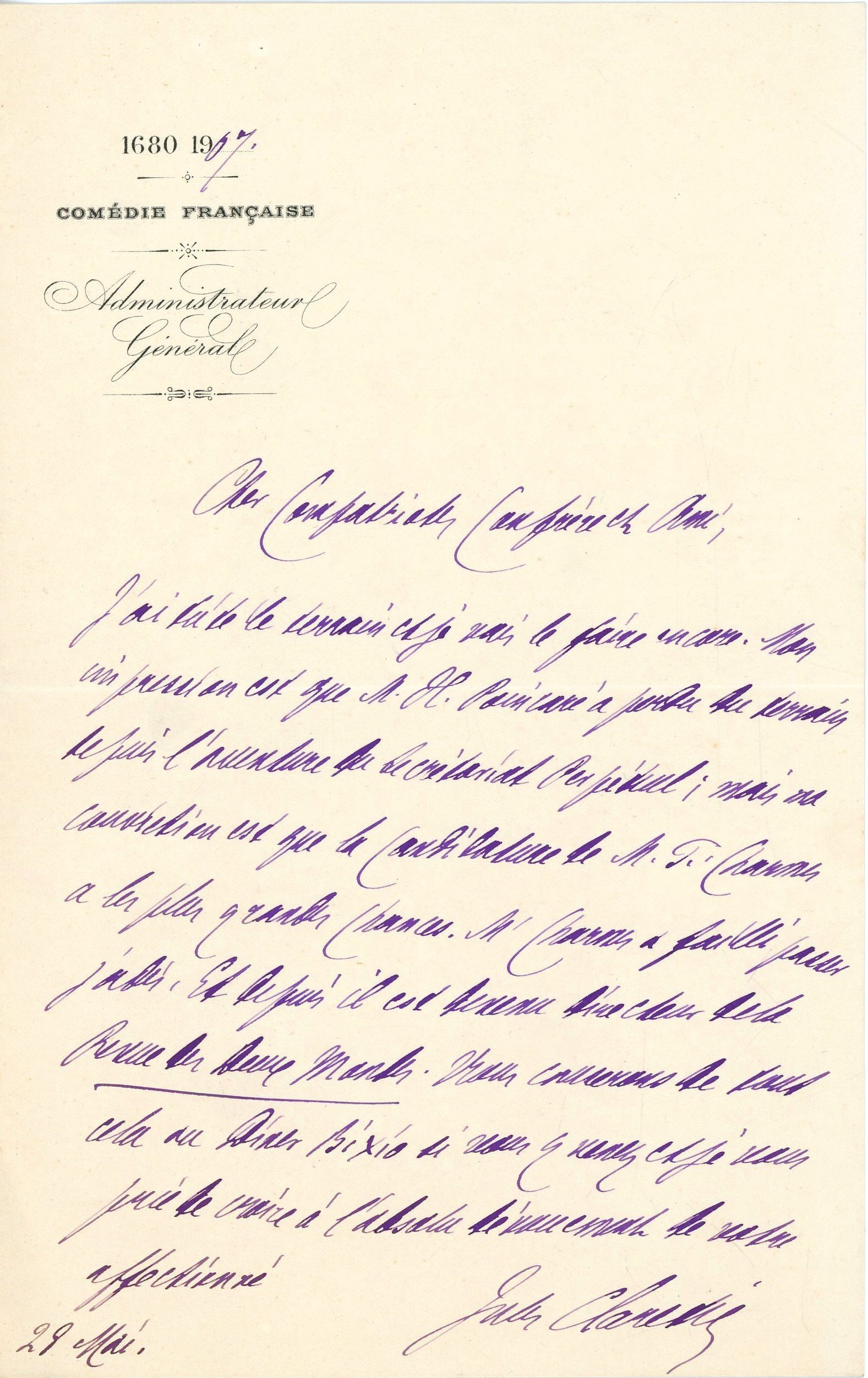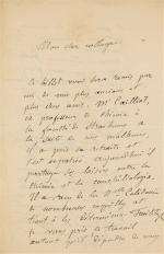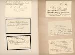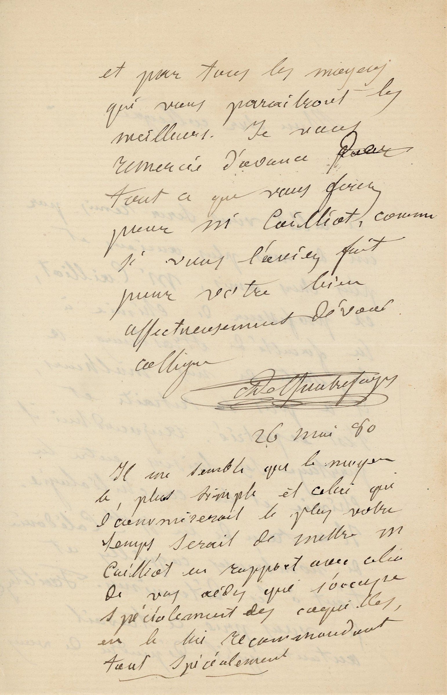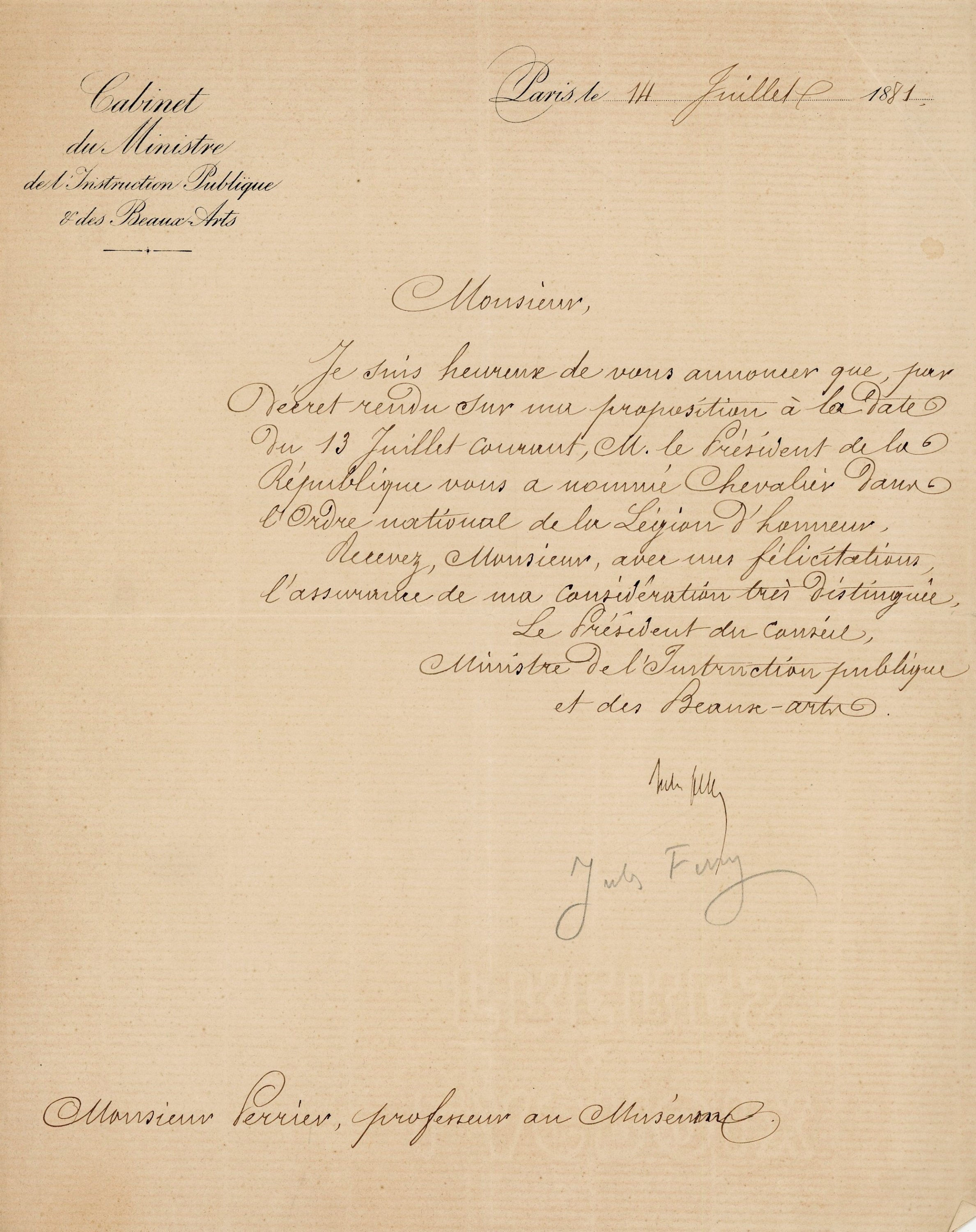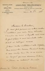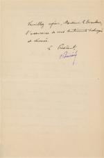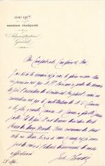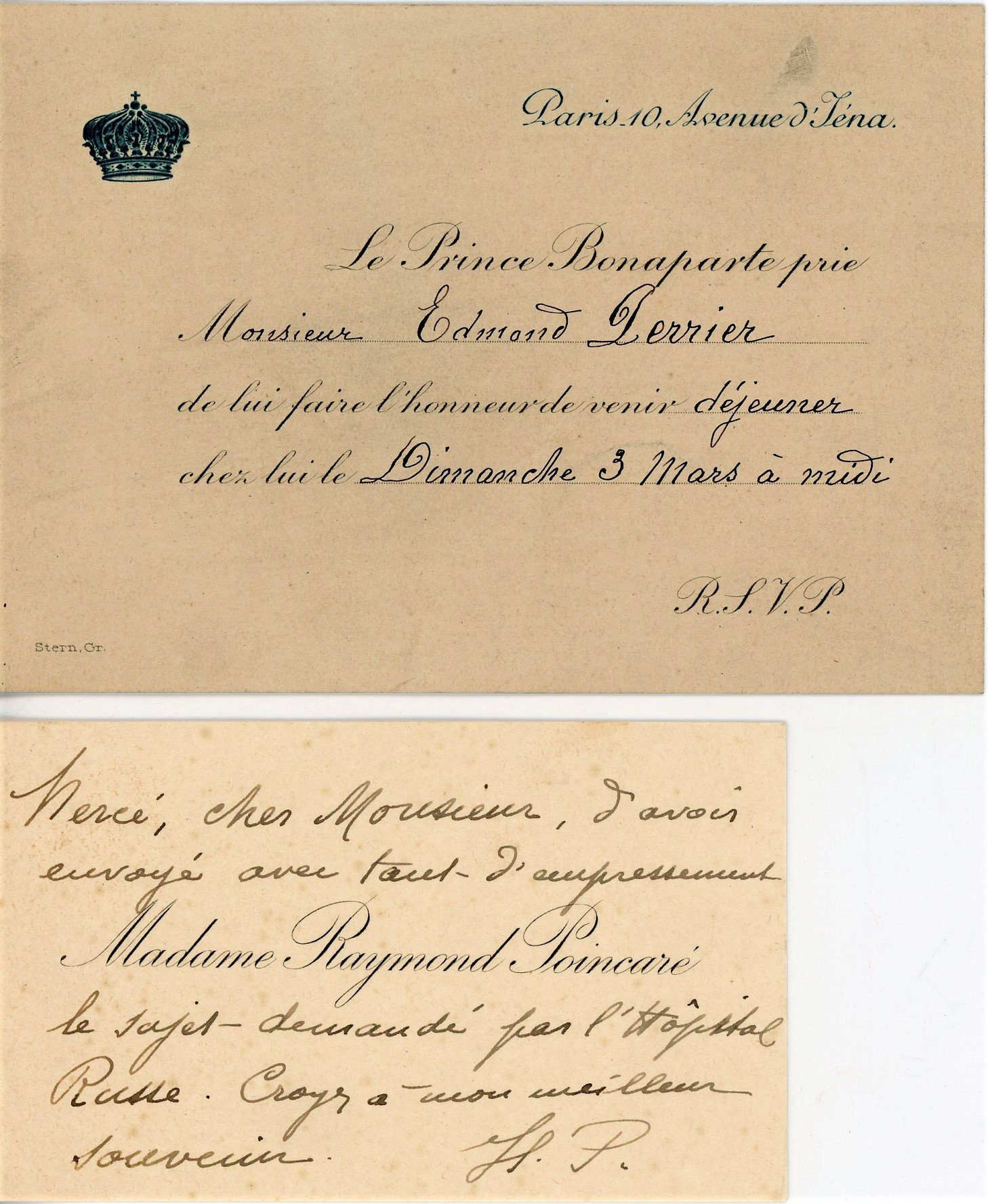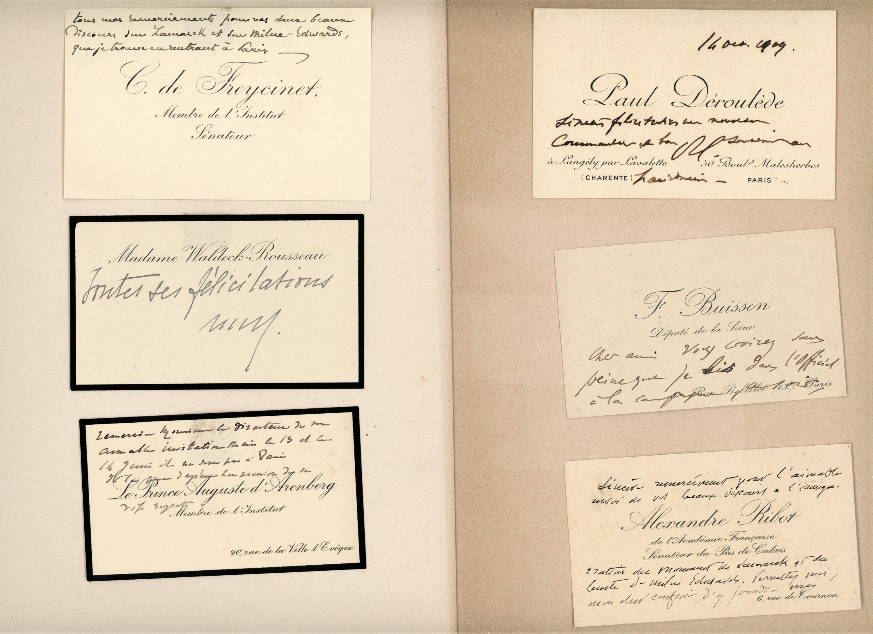 L.A.S., 26 mai 1880, Armand de Quatrefages (1810-1892), biologiste et anthropologue ; L.S., 11 juillet 1881, Jules Ferry (1832-1893), président du Conseil ; Lot de 8 cartes de visite, début du XXe s., dont certaines avec annotations manuscrites dont Paul Déroulède, Alexandre Ribot, prince Auguste dArenberg, Charles de Freycinet, etc ; Carton dinvitation du prince Bonaparte ; L.S., 31 octobre 1908, Raymond Poincaré (1860-1934), président de lunion des associations philotechniques ; L.A.S., 28 mai [1907], Jules Clarétie(1840-1913), 1 page in-8, au sujet de lélection à lAcadémie française: « Cher compatriote, confrère et ami, jai tâté le terrain et je vais le faire encore. Mon impression est que M. H[enri] Poincaré a perdu du terrain depuis louverture du secrétariat perpétuel ; mais ma conviction est que la candidature de M. F[rancis] Charmes a les plus grandes chances. M. Charmes a failli passer jadis. Et depuis il est devenu directeur de la Revue des Deux Mondes. Nous causerons de tout cela au dîner Bixio si vous y venez