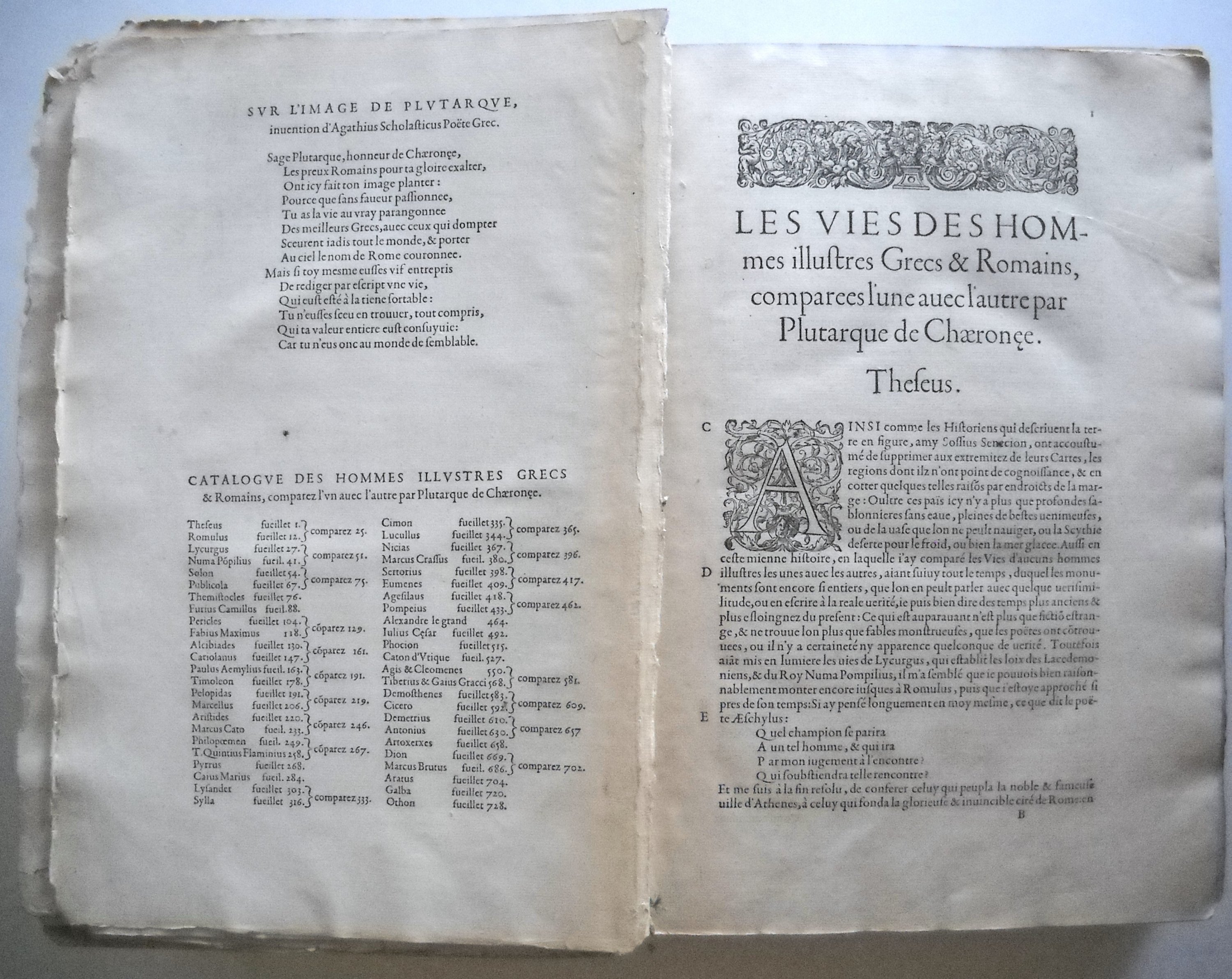 « Les Vies des hommes illustres grecs & romains, comparées l'une avec l'autre par Plutarque de Chaeronée. Translatees de Grec en François », Paris, Michel de Vascosan, 1559. Avec « Table alphabétique sur les vies de Plutarque ». In-fol. de (8)-734-(26) feuillets (qqs feuillets détachés, déchirures et petits manques, mouillures).