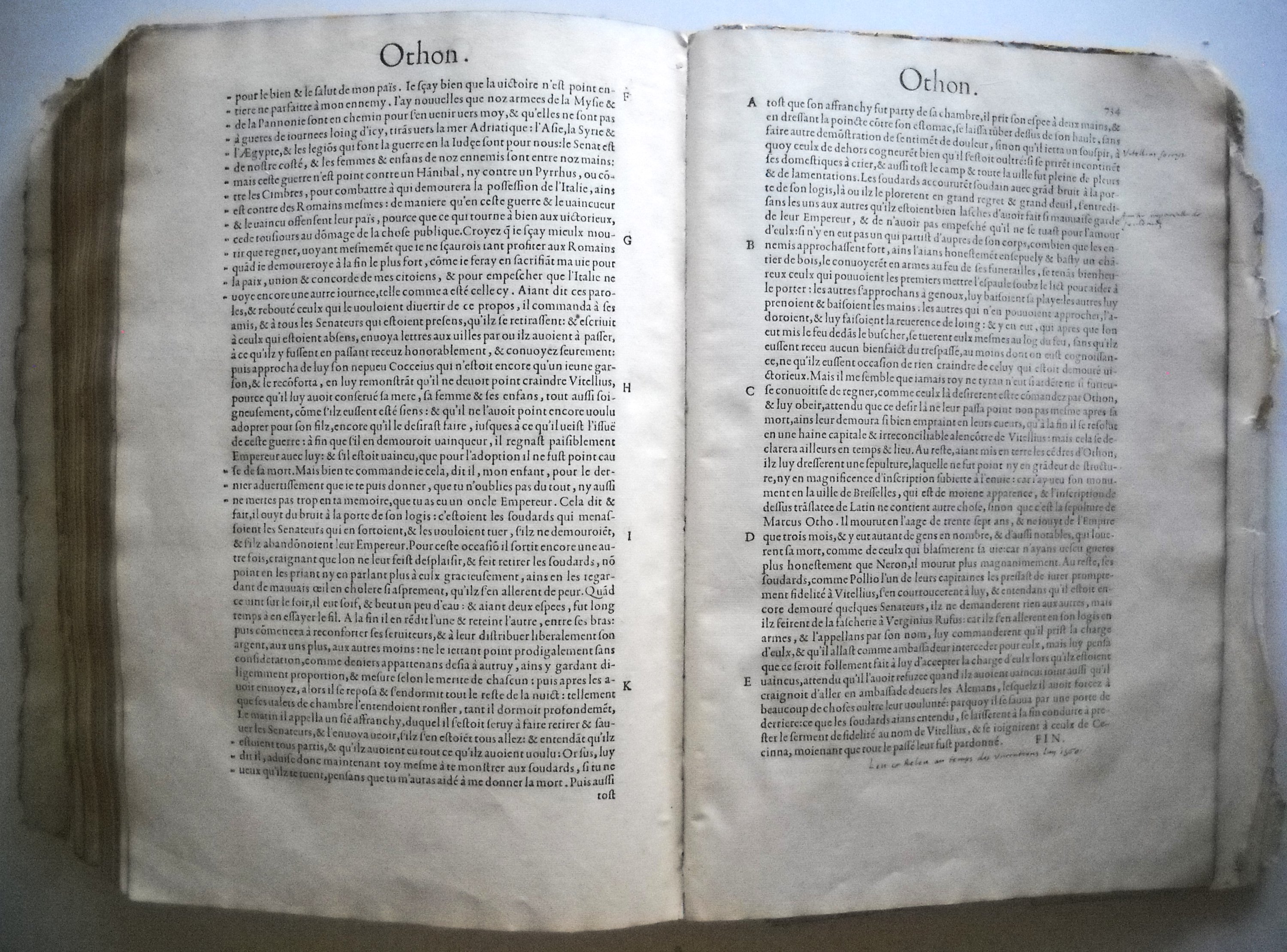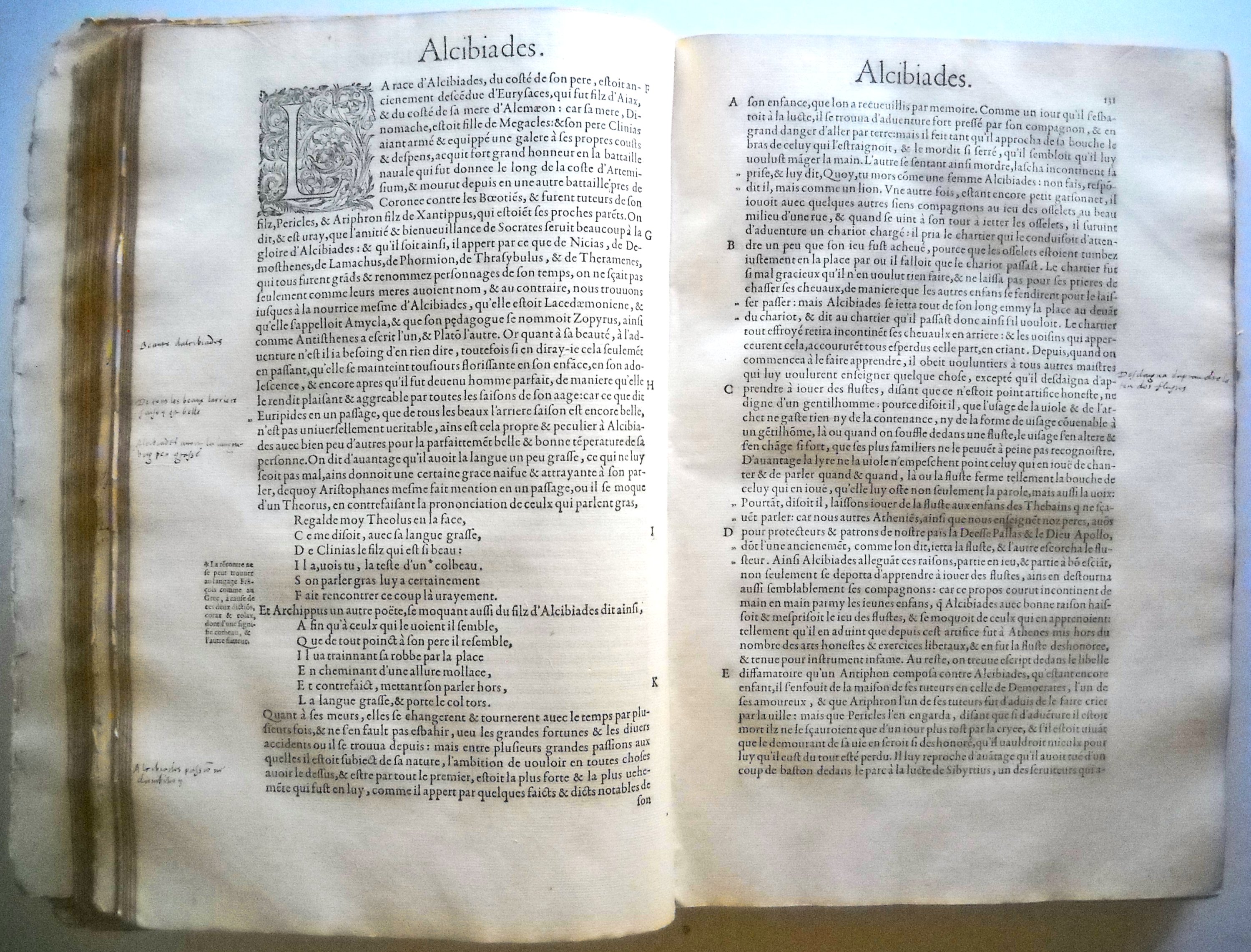 Première édition de la traduction française de Jacques Amyot. Intéressant exemplaire contenant en marges des commentaires manuscrits à la plume terminant par ses mots: « Leu et releu le temps des vaccations en lan 1560 ».