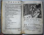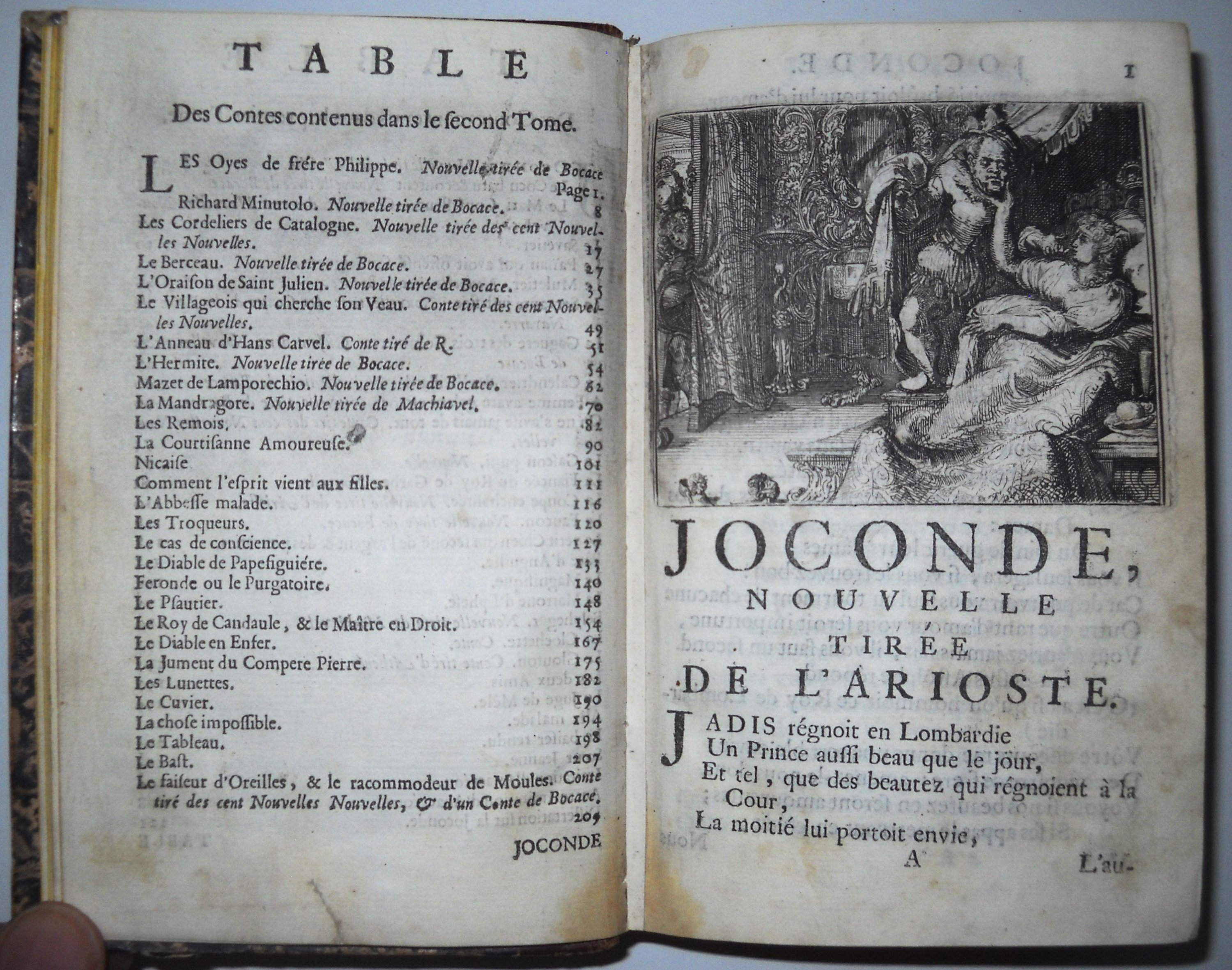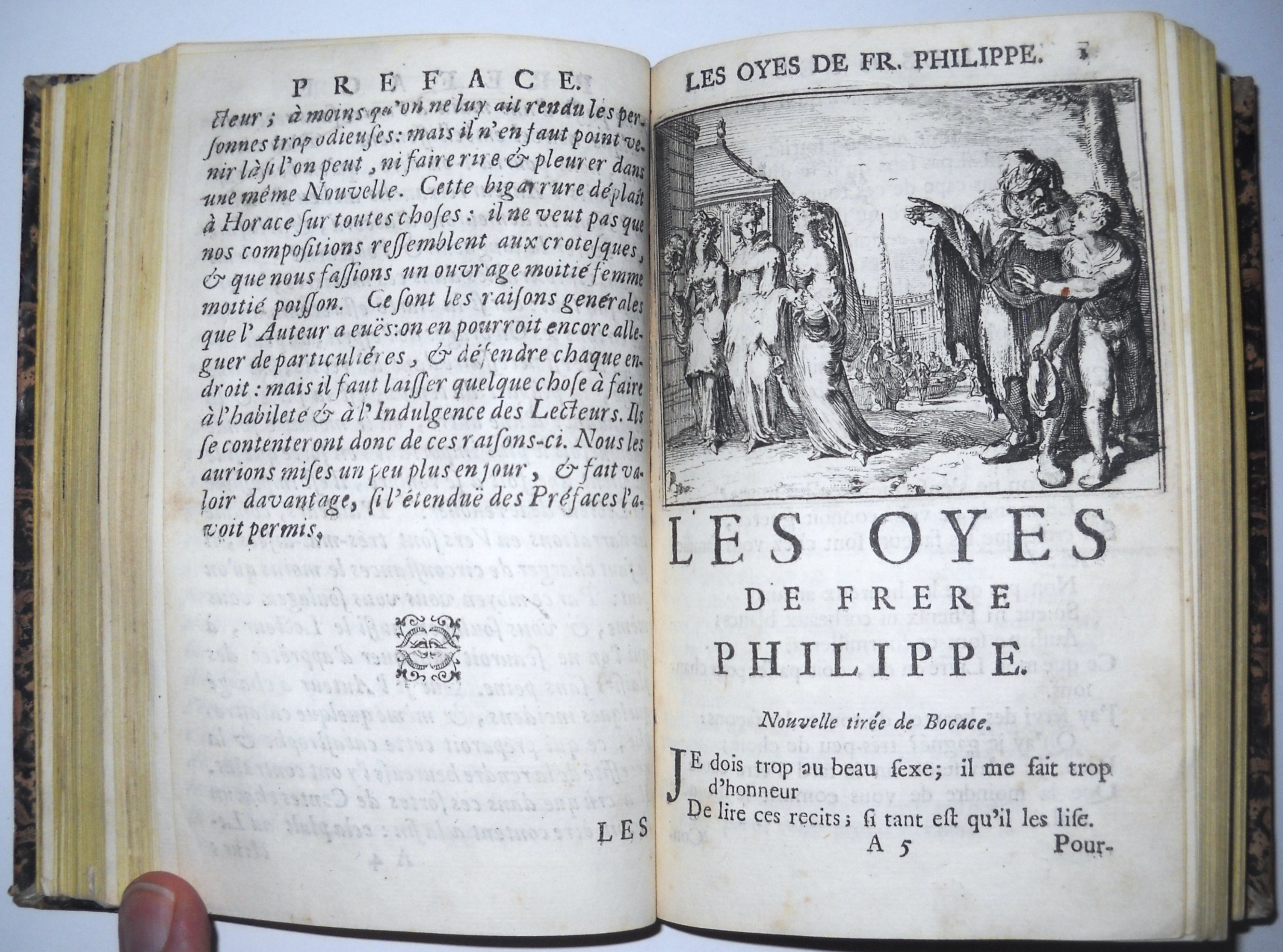 Jean de La Fontaine, « Contes et nouvelles en vers. De Monsieur de La Fontaine. Nouvelle édition enrichie de tailles-douces ». 2 tomes en 1 vol. in-8. Amsterdam, chez Henry Desbordes, 1685, (18)-236-(8)-216 pp., frontispice et 58 vignettes de Romain de Hooghe (accdts, rest., déchirures) ;