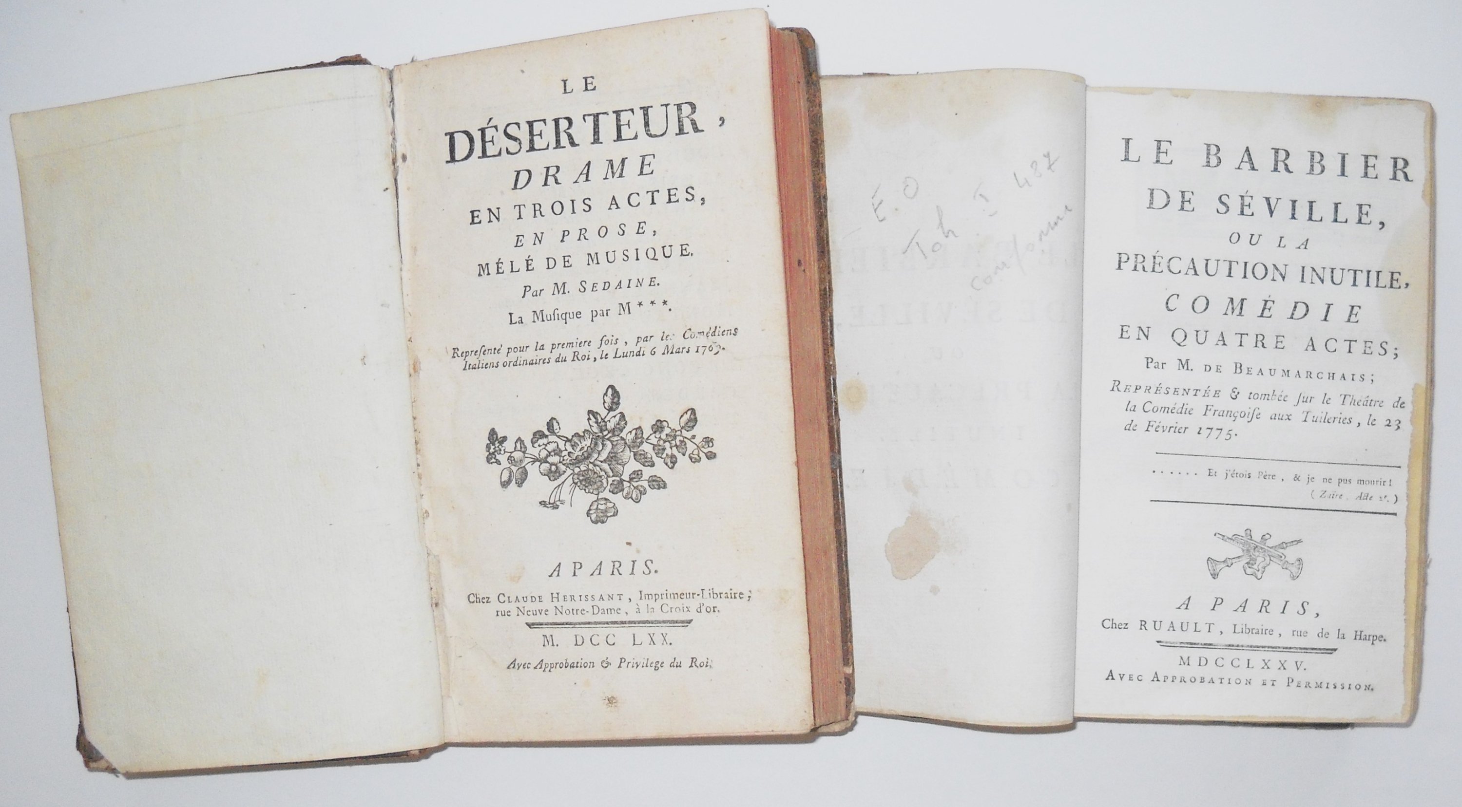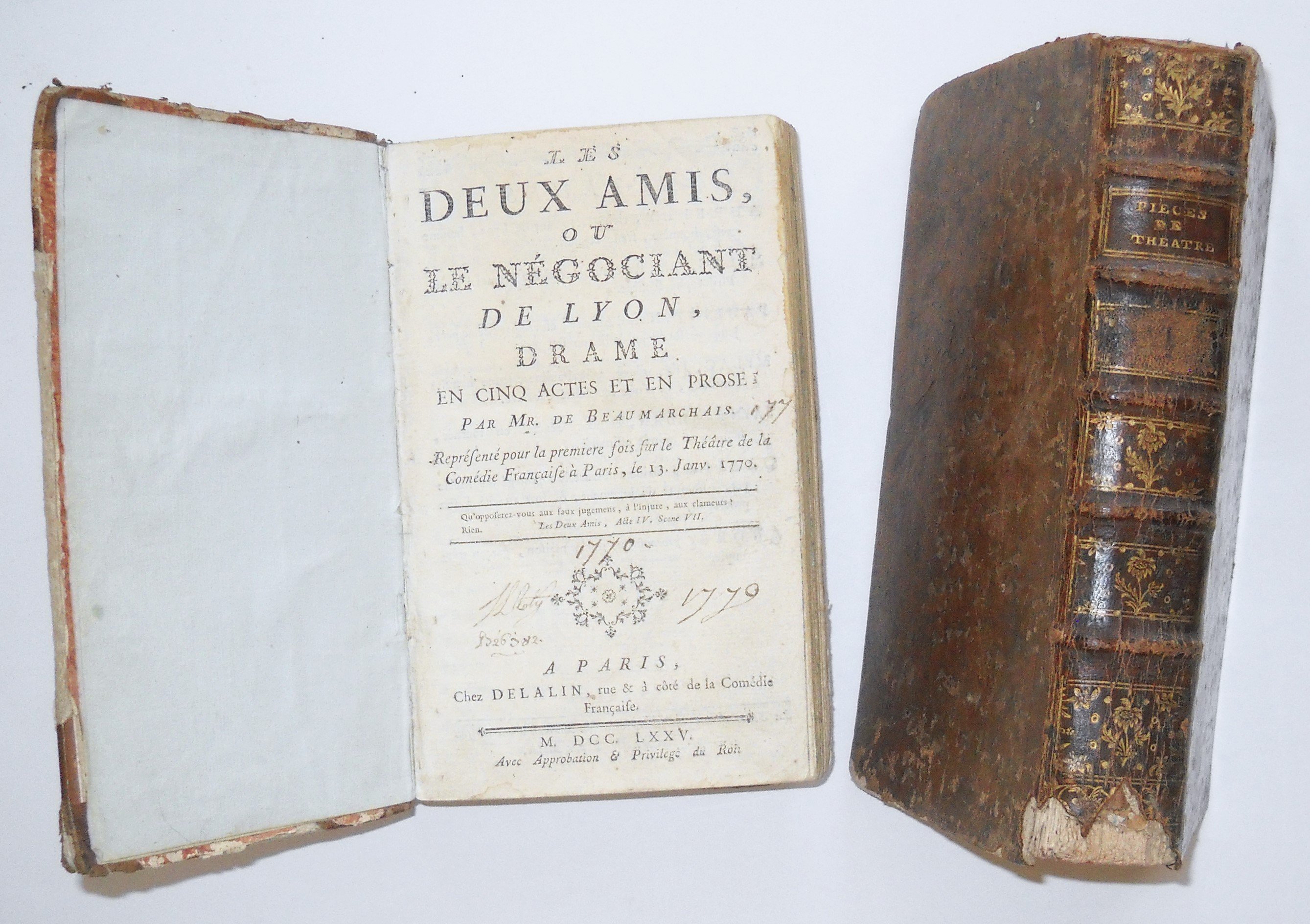 Recueil de 9 pièces, rel. demi basane in-8 (en létat) contenant : « Les deux amis ou le négociant de Lyon », Paris, Delalin, 1775, 64 pp. ; « Eugénie », Paris, Merlin, 1778, 87 pp. ; « Le barbier de Séville ou la précaution inutile », Paris, Ruault, 1775, 48 pp. ; « Le barbier de Séville ou la précaution inutile », 132 pp. ; « La folle journée ou le mariage de Figaro », Lyon, 1785, 37 pp. ; « La folle journée ou le mariage de Figaro », Amsterdam, 1785, 156 pp. ; « Lautre Tartuffe ou la mère coupable », 65 pp. ; « Panurge dans lisle des lanternes », Paris, 1790, 28 pp. ; « La gageure imprévue », Paris, veuve Duchesne, 1769, 48 pp.