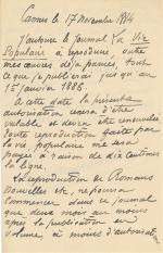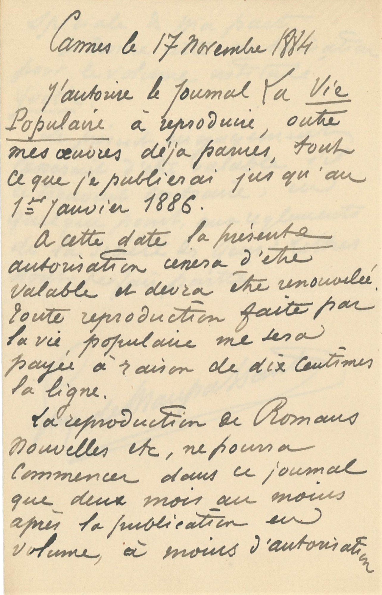 L.A.S., Cannes, 17 novembre 1884, adressée à Jean Dupuy, président du conseil de surveillance et actionnaire du journal quotidien « Le Petit Parisien », 2 pages in-8 ; rare lettre dengagement contractuel entièrement écrite par Guy de Maupassant: « Jautorise le journal La Vie Populaire à reproduire, outre mes uvres déjà parues, tout ce que je publierai jusquau 1er janvier 1886. A cette date la présente autorisation cessera dêtre valable et devra être renouvelée. Toute reproduction faite par La Vie Populaire me sera payée à raison de dix centimes la ligne. La reproduction de romans nouvelles etc, ne pourra commencer dans ce journal que deux mois au moins après la publication en volume, à moins dautorisation spéciale de ma part. Je donne cette autorisation pour le volume intitulé Yvette. Le présent engagement cesserait dêtre valable sil se trouvait contraire, en quelque point, aux règlements de la société des gens de lettres dont je fais partie. »