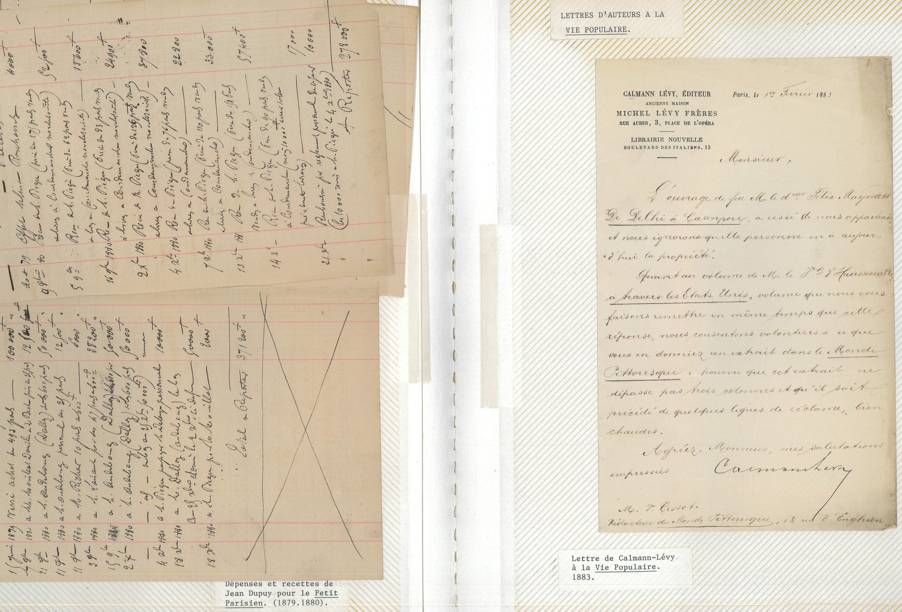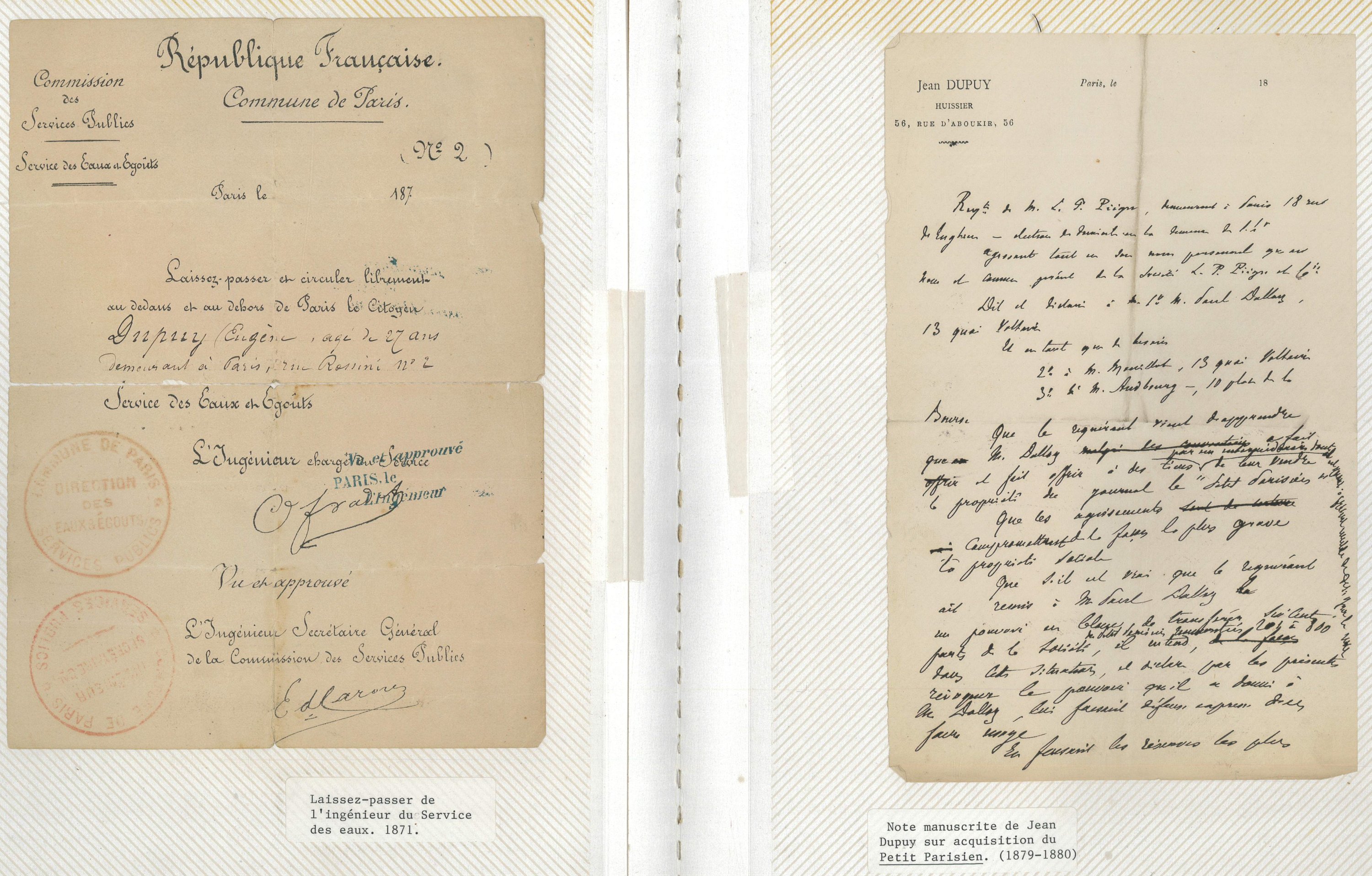 2 portraits photographiques et notes manuscrites de Jean Dupuy (acquisition du Petit Parisien, compte des dépenses et recettes) ;