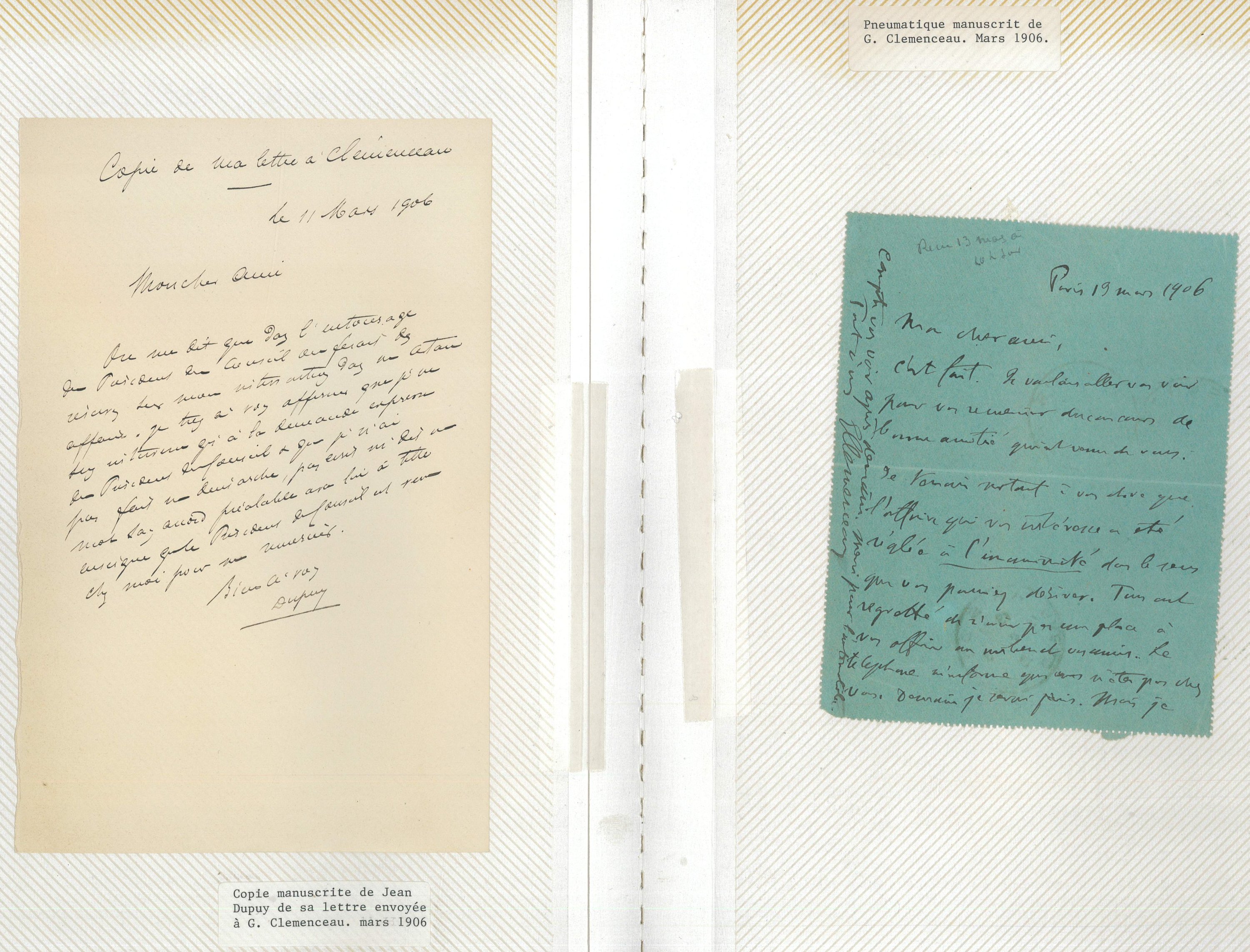 P.A.S., 13 mars 1906, Georges Clémenceau, écrit la veille de sa nomination au ministère de lIntérieur, où il sera surnommé « le Tigre » et se désignant lui-même comme le « premier flic de France », + 2 notes manuscrites de Jean Dupuy expliquant le déroulé des jours qui ont précédé la nomination de Clémenceau ;