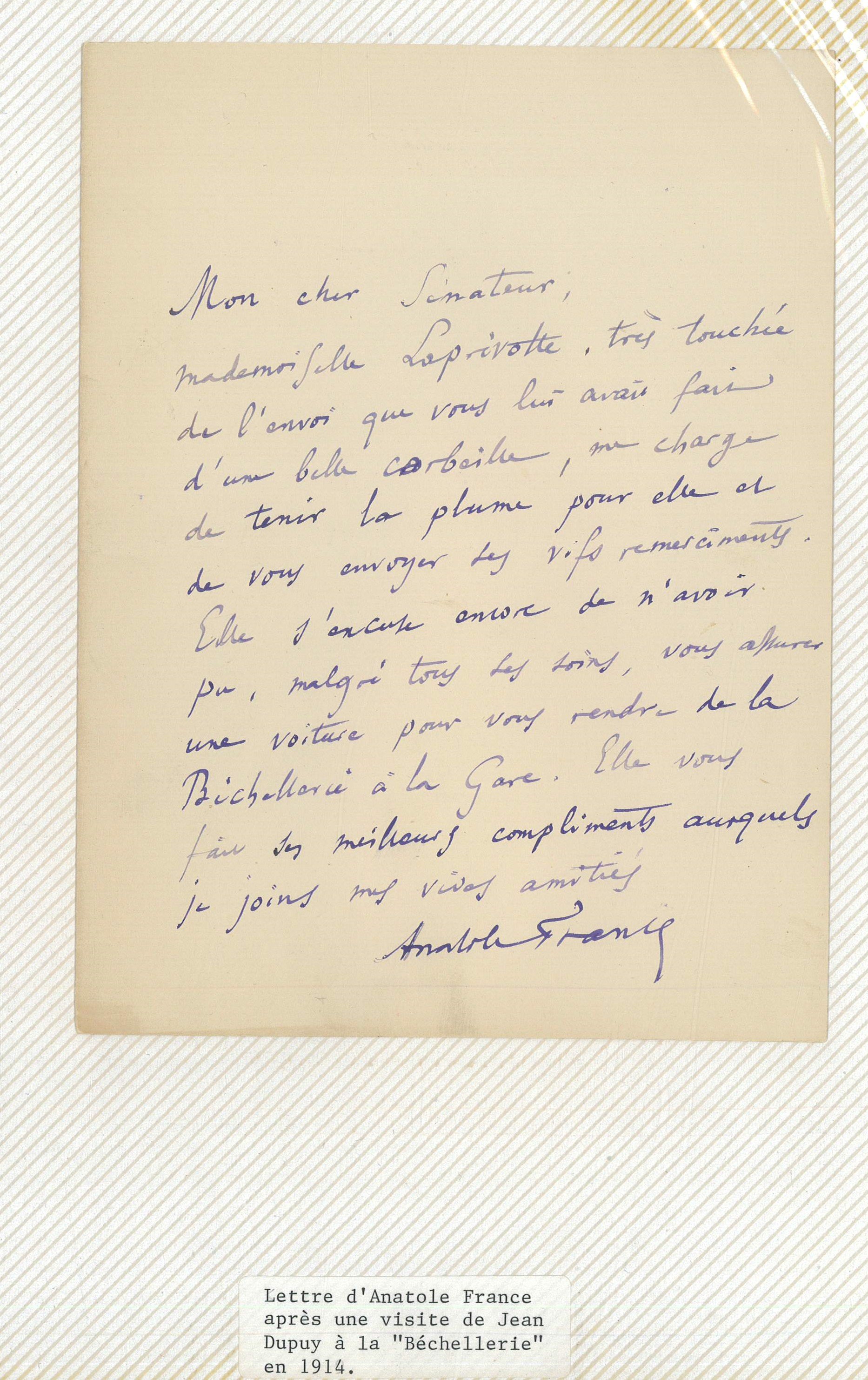 L.A.S., 1914, Anatole France écrite de sa propriété de la Béchellerie en Touraine ;