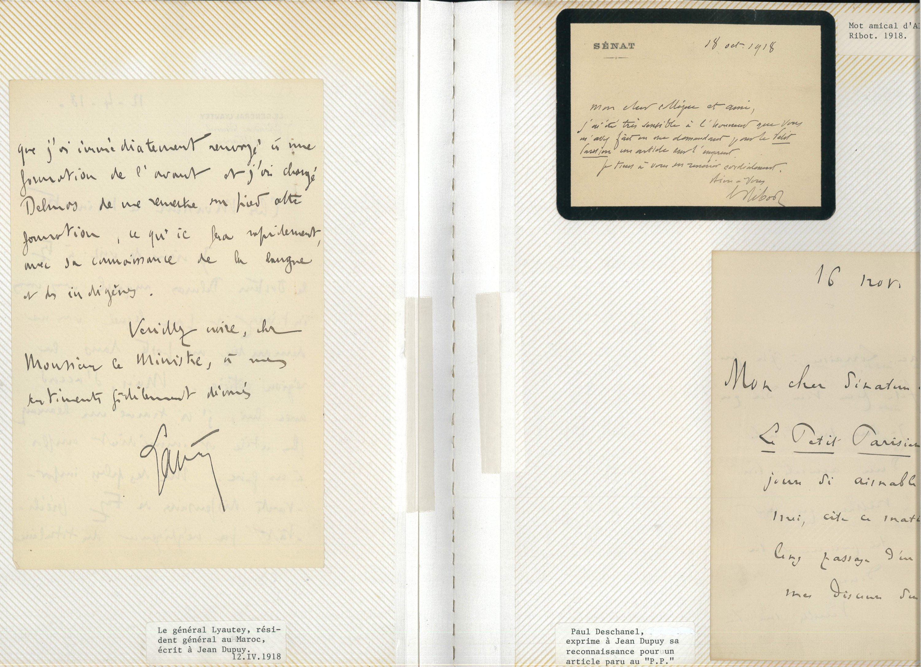 L.A.S. Hubert Lyautey général du protectorat français au Maroc (1918) ; P.A.S. Alexandre Ribot sénateur ; L.A.S. Paul Deschanel président de la chambre des députés (1918) ;