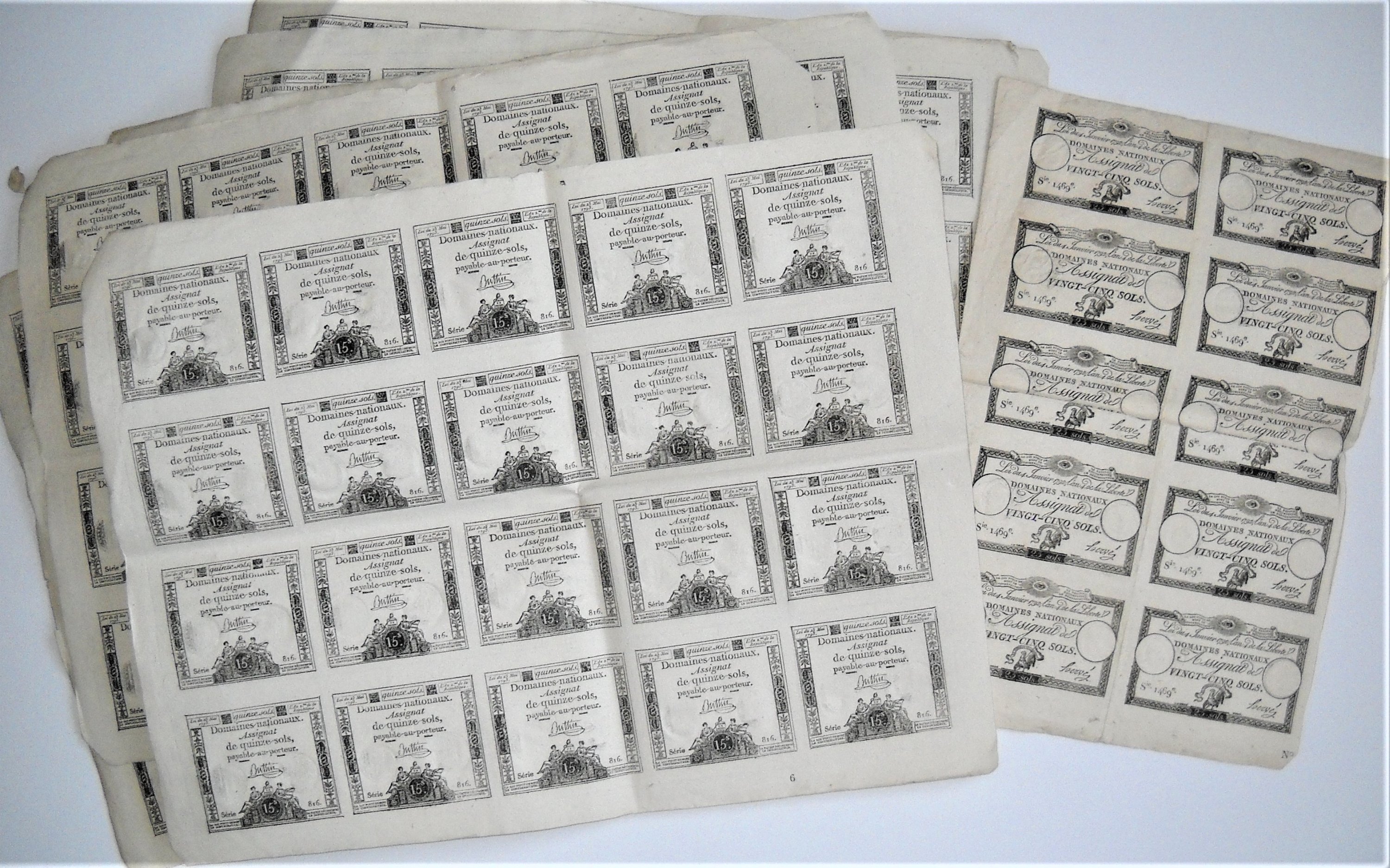 Réunion de 8 planches gravées, chacune contenant 20 billets dassignats de 15 sols du 23 mai 1793, 35 x 47 cm ; et demi-planche gravée de 10 billets dassignats de 25 sols du 4 janvier 1792, 36 x 23 cm.