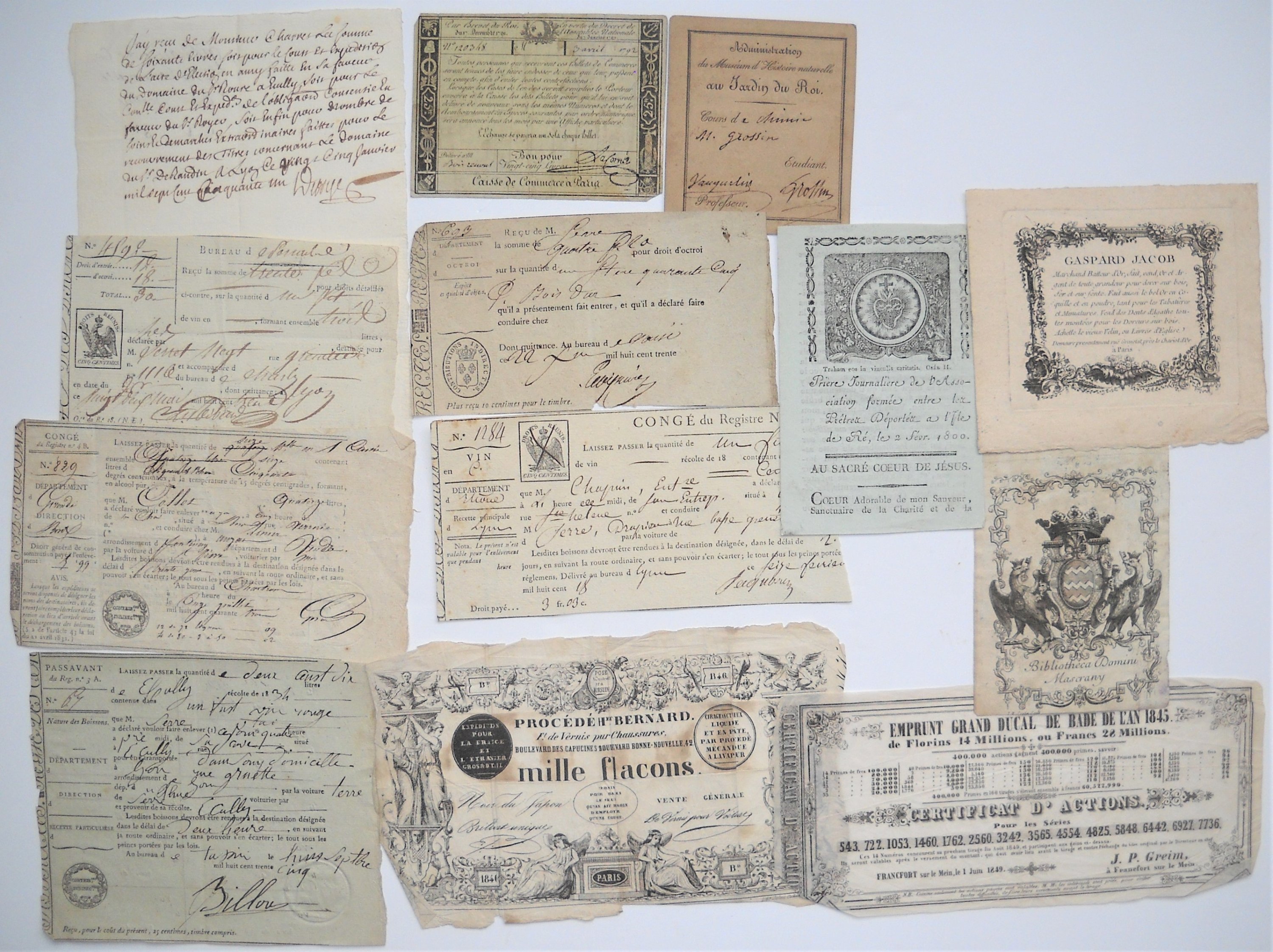 BILLETS, PUBLICITÉS, LETTRES DE VOITURE ET DIVERS, XVIIIe ET XIXe SIÈCLES