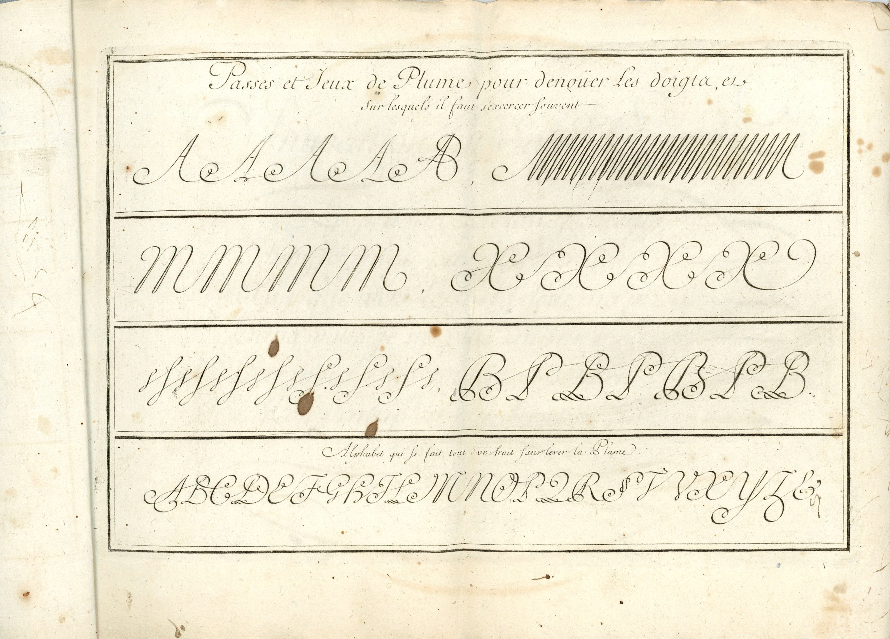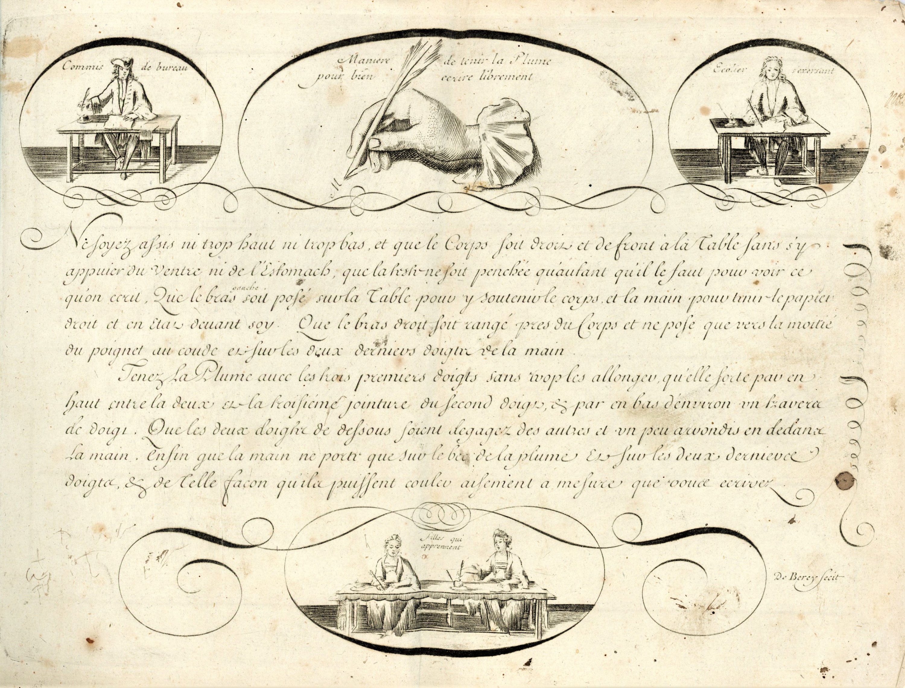 « Manière de tenir la plume pour bien écrire librement », cahier 8 pp. in-4 à litalienne gravé en taille-douce ; rarissime livret dinstruction pour apprendre à bien écrire, vers 1700-1730.