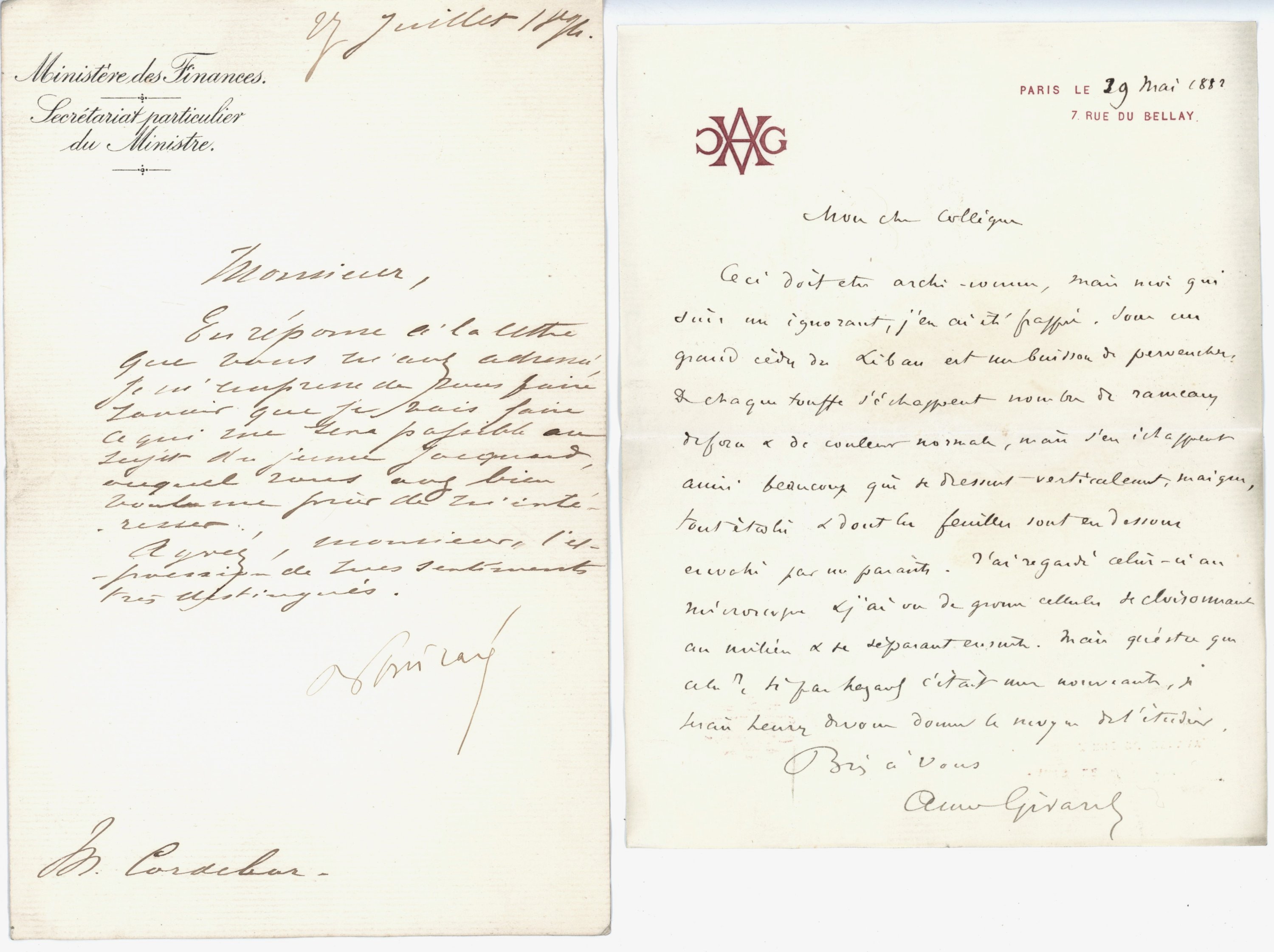L.A.S. Adam-Charles Girard (1837-1918), chimiste, 1 page in-8 : « Paris 29 mai 1882 Mon cher collègue cela doit être archi-connu, mais moi qui suis un ignorant, jen ai été frappé. Sous un grand cèdre du Liban est un buisson de pervenches. De chaque touffe séchappent nombre de rameaux de force et de couleur normale (