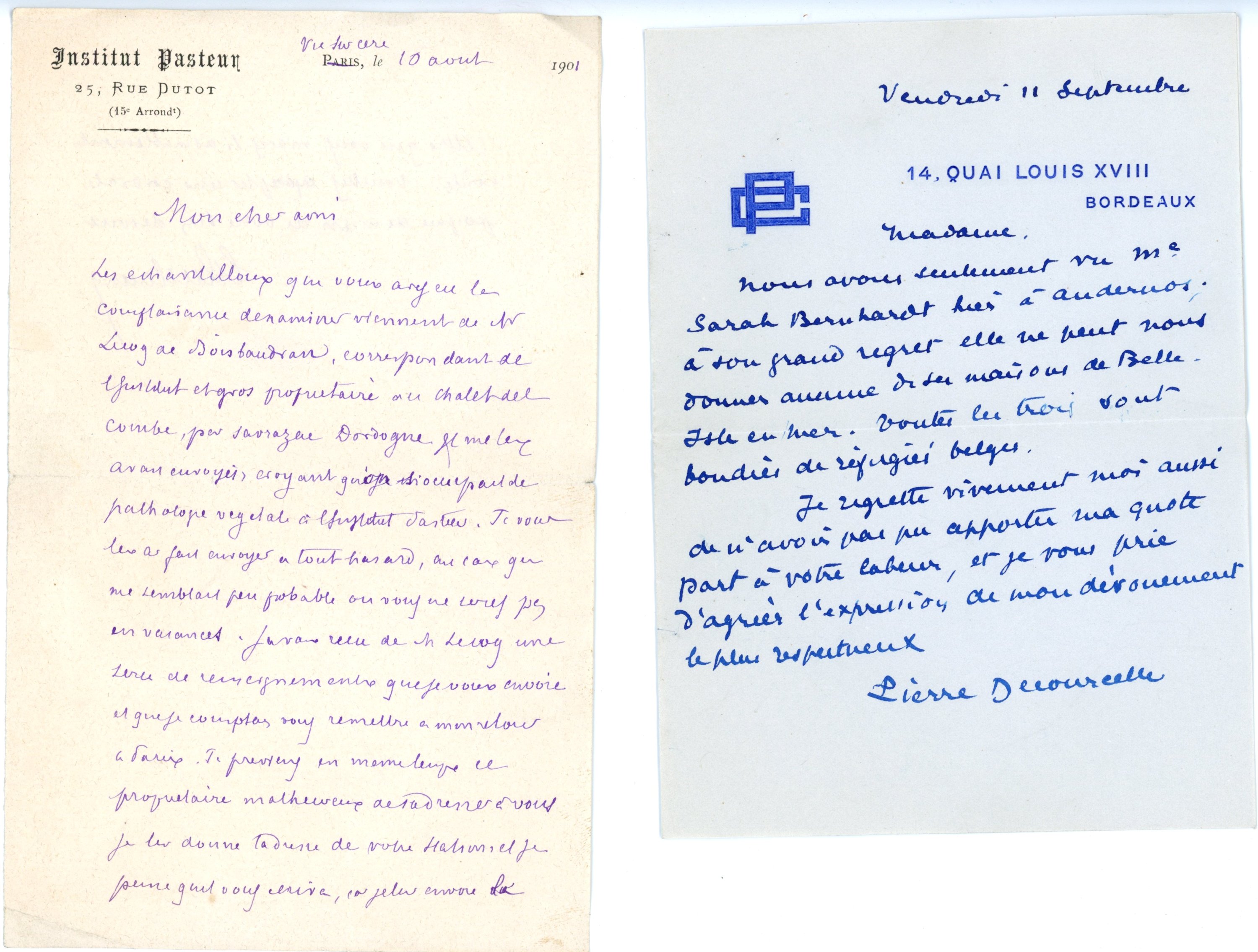 L.A.S. Pierre Decourcelle (1856-1926), romancier et dramaturge : « Vendredi 11 septembre Madame nous avons seulement vu Mde Sarah Bernhardt hier à Andernos. A son grand regret elle ne peut nous donner aucune de ses maisons de Belle-Isle en Mer. Toutes les trois sont bondées de réfugiés belges