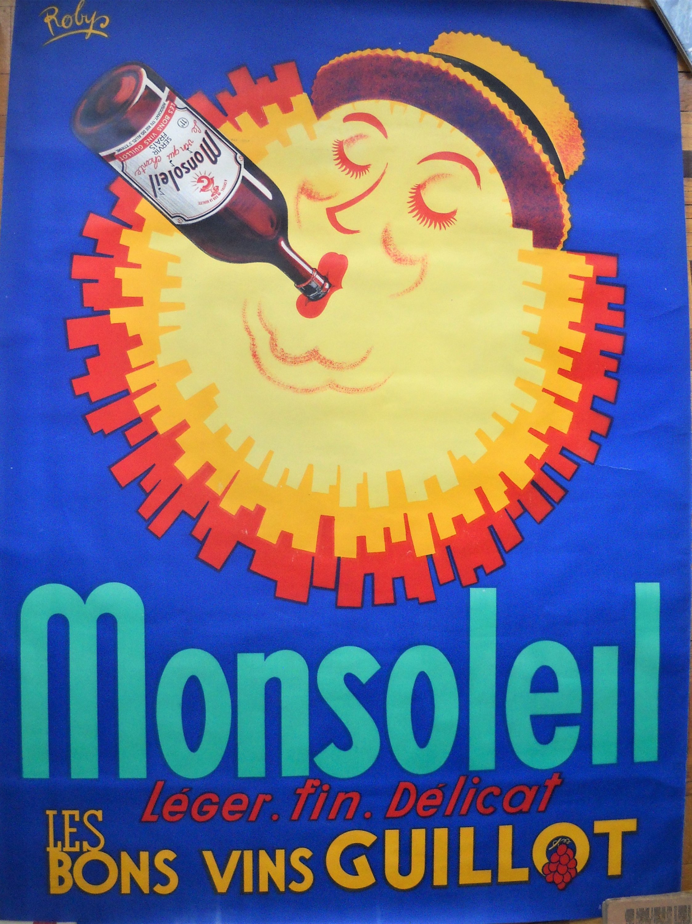 « Monsoleil / Léger fin, délicat / Les bons vins Guillot », vers 1950. Epreuve originale imprimée en couleurs. « Avenir Publicité Saint Etienne ».