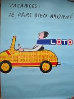 « Vacances: je pars, bien abonné / Loto ». Signée. 1989. Epreuve originale imprimée en couleurs. Non entoilée, 155 x 115 cm, bel état.