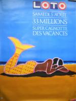 « Loto / Samedi 5 août / 33 millions / Super cagnotte des vacances ». Signée. 1989. Epreuve originale imprimée en couleurs. Non entoilée, 155 x 115 cm, bel état.